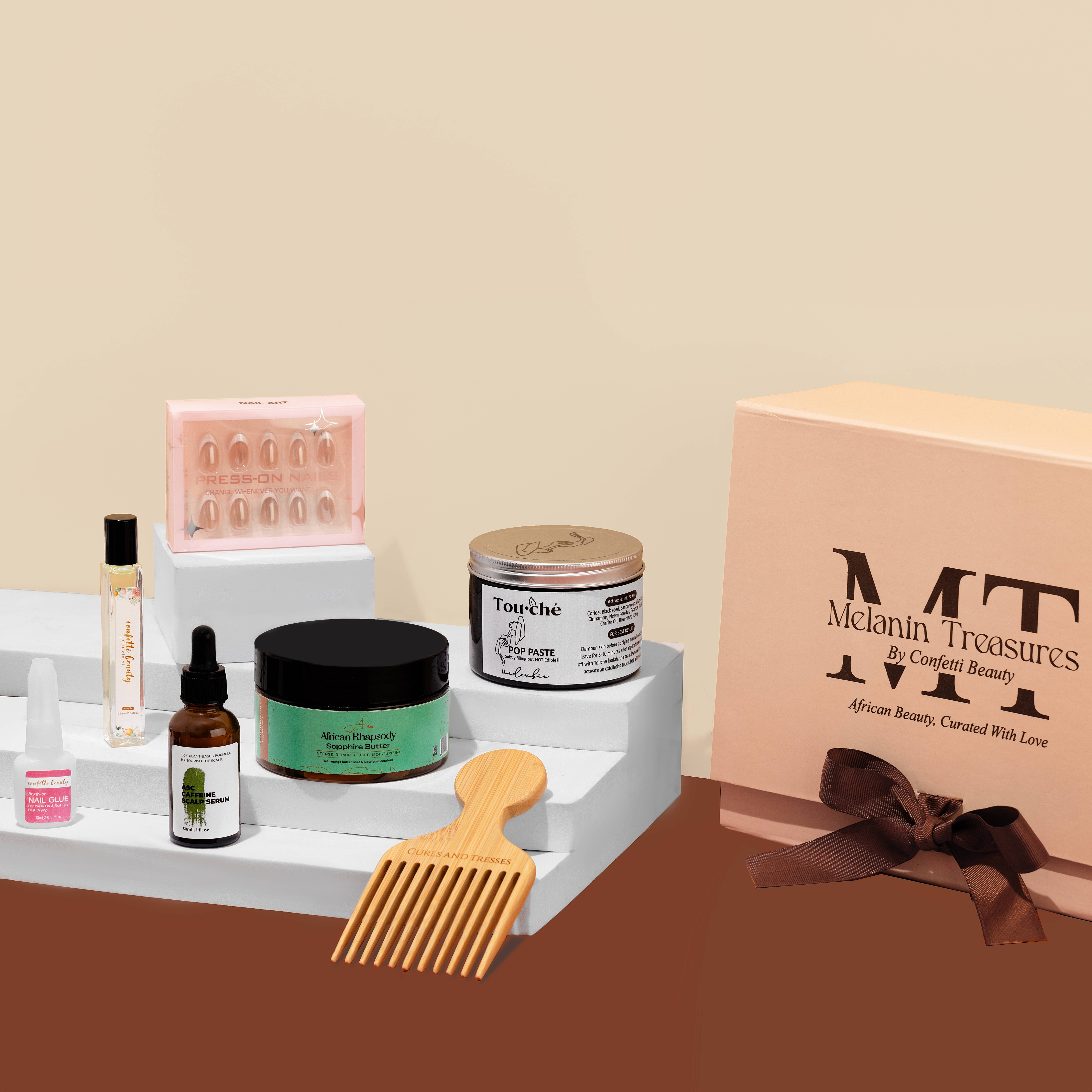 Brand Story – Melanin Treasures Melanin Treasures was born from a deep desire to reconnect women around the world with the richness of African beauty rituals. We curate premium skincare, haircare, makeup, and nail care products crafted by skilled African women artisans using natural, plant-based ingredients sourced ethically from the continent’s rich biodiversity. Each product in our collection celebrates centuries-old traditions passed down through generations — reimagined for the modern woman who craves authenticity, quality, and intention in her self-care routine. From soothing shea butters to glow-enhancing oils, every item tells a story of heritage, craftsmanship, and healing. At Melanin Treasures, beauty is more than skin deep — it’s a movement. A portion of our proceeds goes towards supporting STEM education for young girls across Africa, empowering the next generation of innovators and leaders. When you stock Melanin Treasures, you’re not just offering your customers beautifully made, clean beauty products — you’re giving them the chance to support something bigger: a thriving ecosystem of African female entrepreneurs, and a mission-driven brand that gives back.