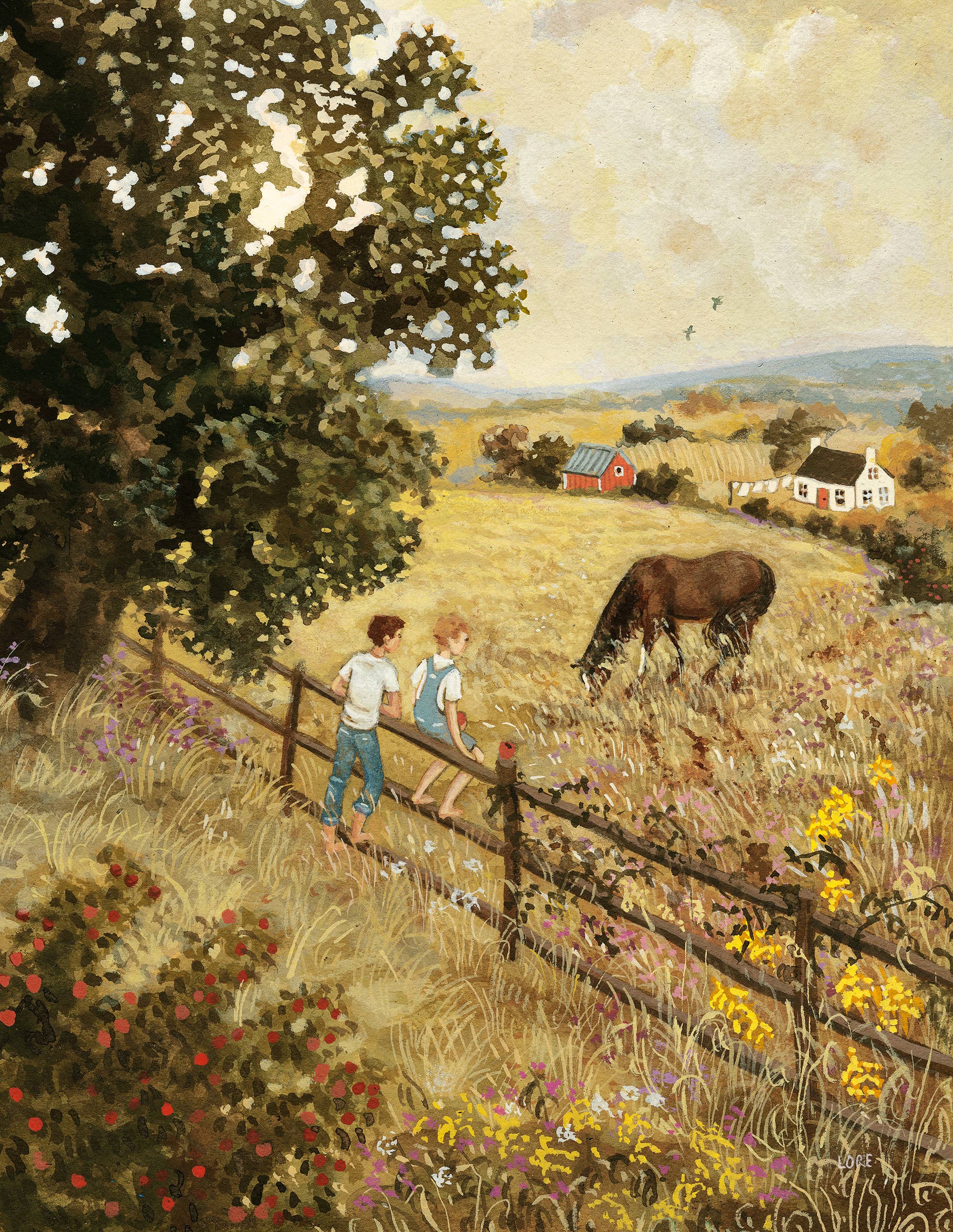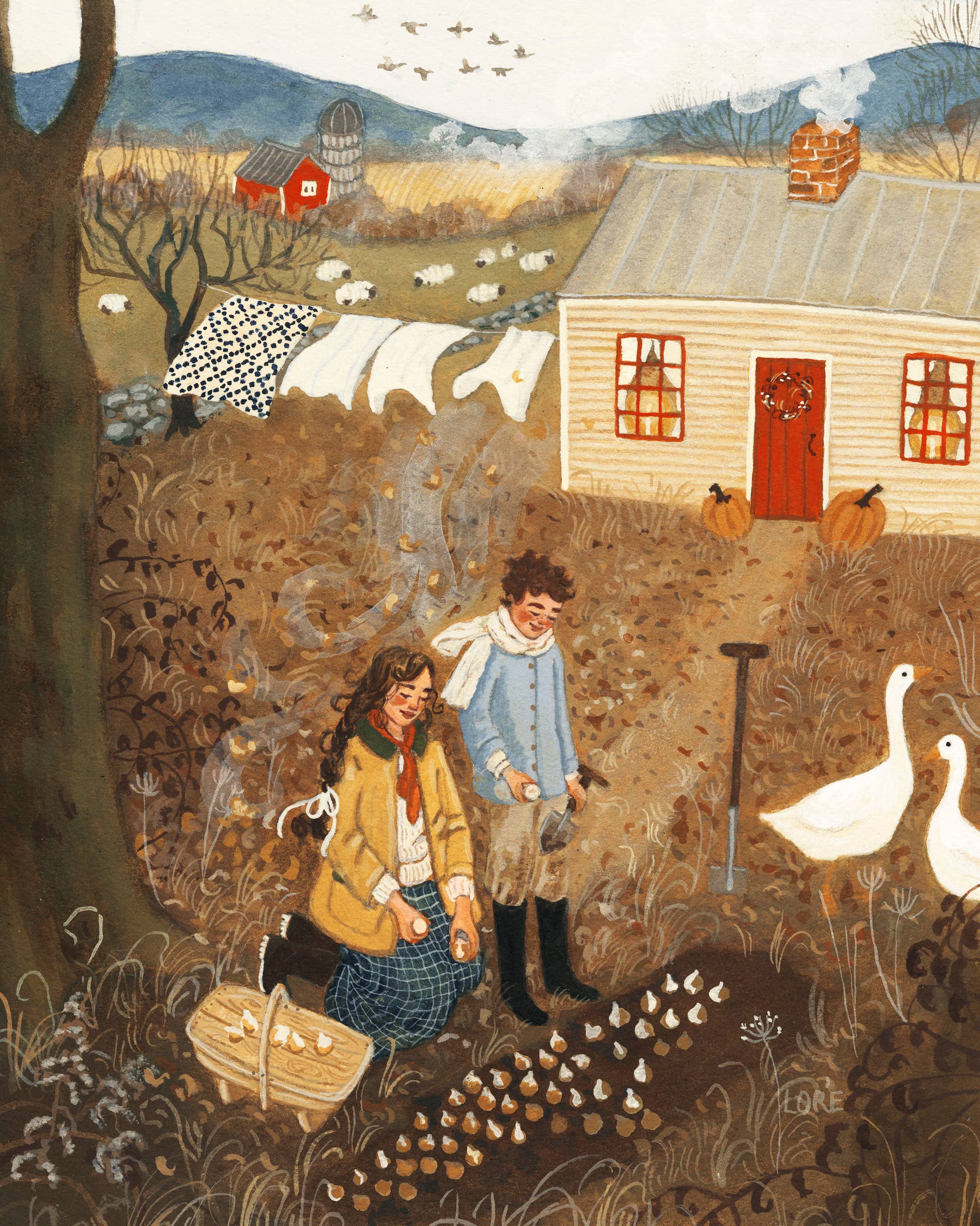 Tucked between rivers, hills, and farm fields, Loré lives with her husband and children in rural Vermont. Drawing from the beauty and simplicity their day to day life offers, she works with gouache on cotton paper. Inspired by the natural world, her children, homesteading, all the books dear to her in childhood, and a good dose of dreaming, she paints in a sunny corner of her bedroom with a large cup of coffee.