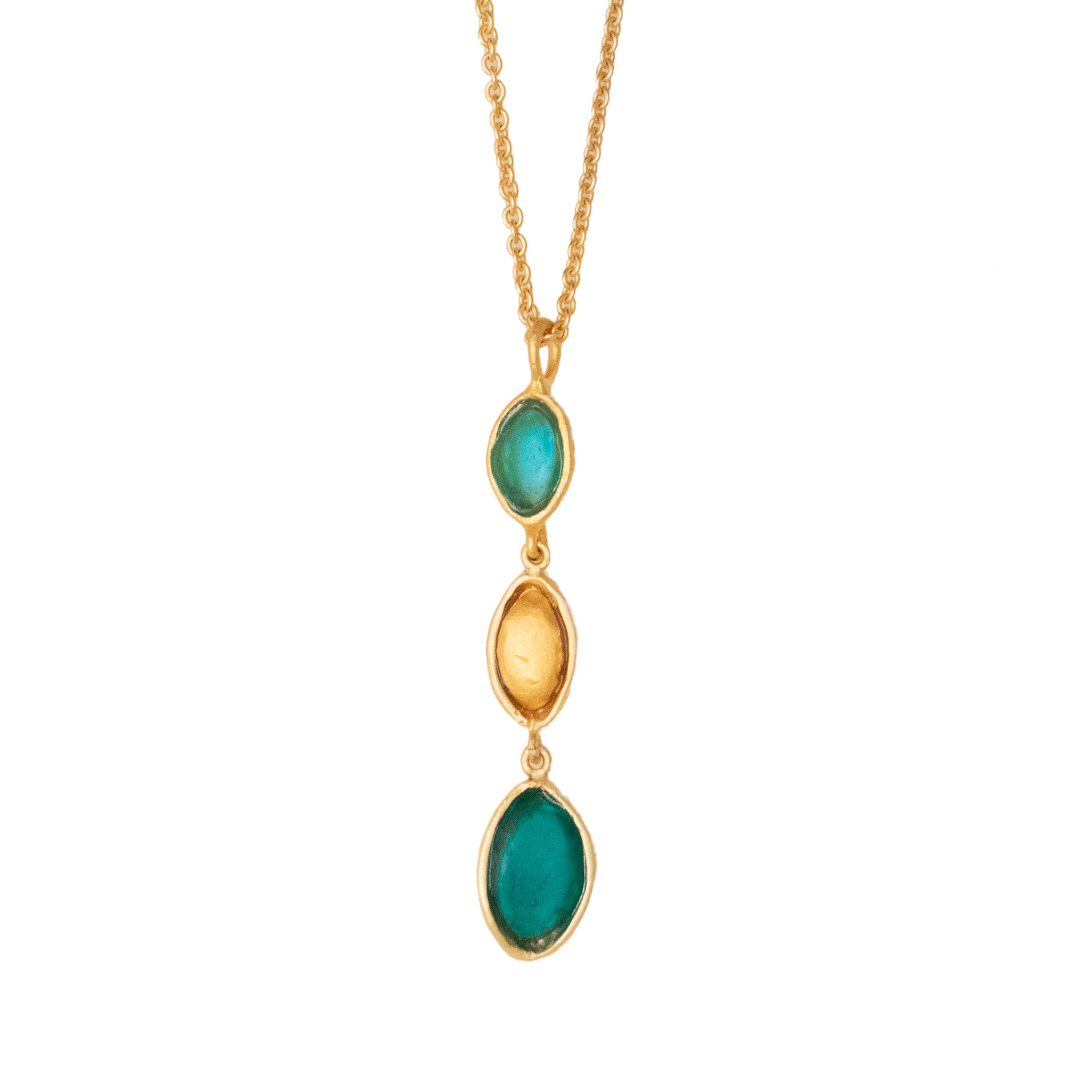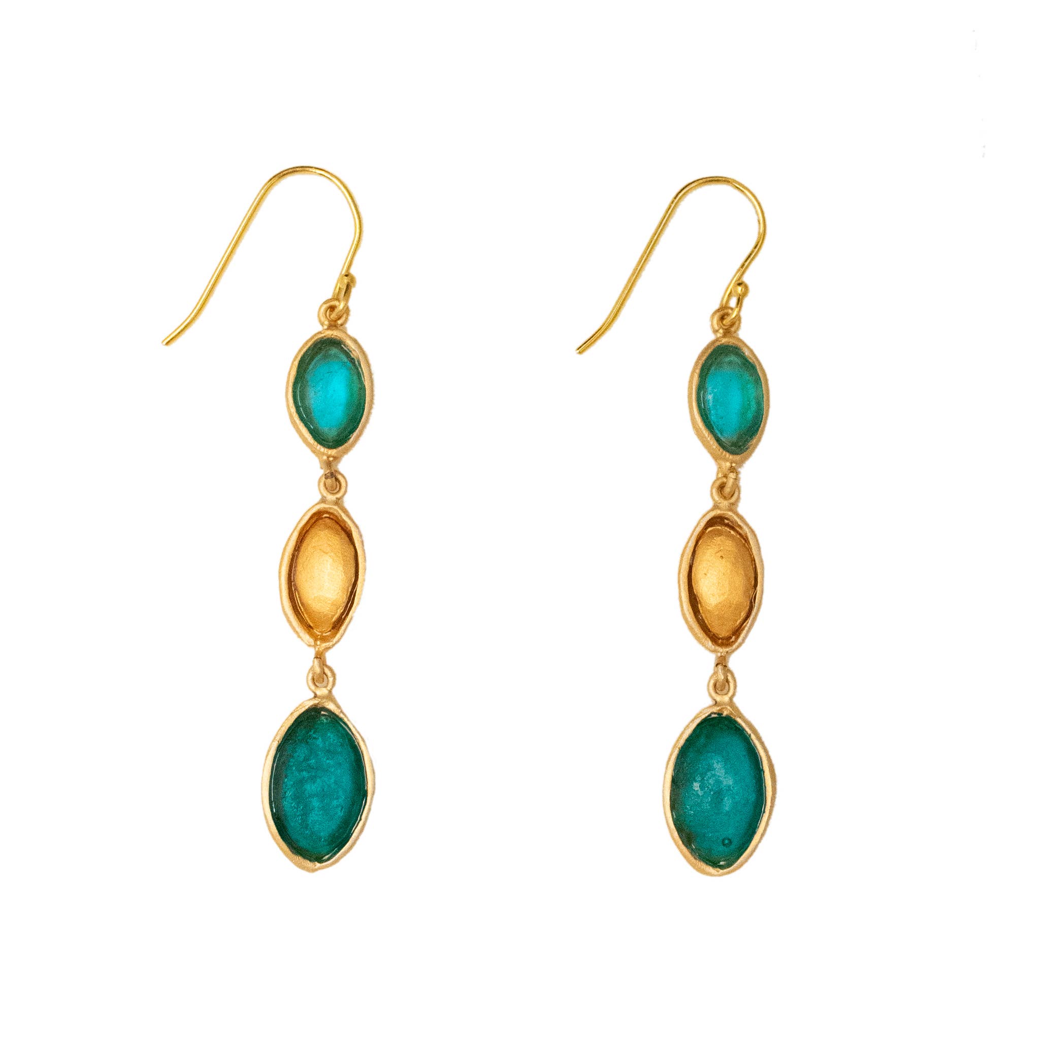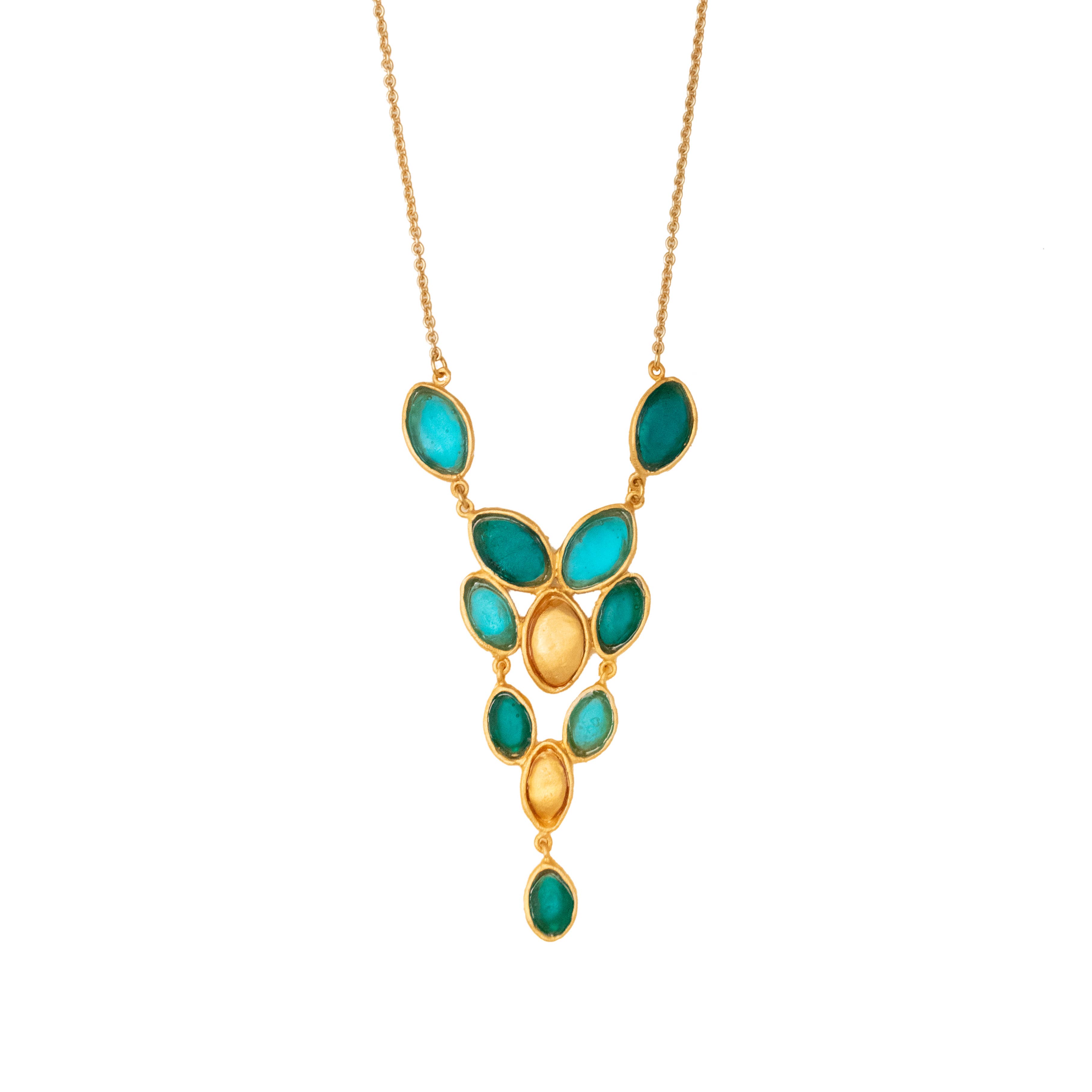 Michael Vincent Michaud is notably unique in his process of cast glass. Through this craft, Michael is able to capture bold colors and textures which, when hit with radiant light, make each glass element of the jewelry glisten and glow. Surrounded by the skilled craftsmen at his father’s studio, Michael was inspired by the master craftsmanship of his father, as well as his own true love of “art glass” and the colors of the world around him. He studied extensively with some of America’s finest glass artists at various institutions including the prestigious Corning and Urban glass programs. Our collection is cast in bronze with a gold finish, and accented with cast glass. All jewelry pieces are meticulously handmade in New York.