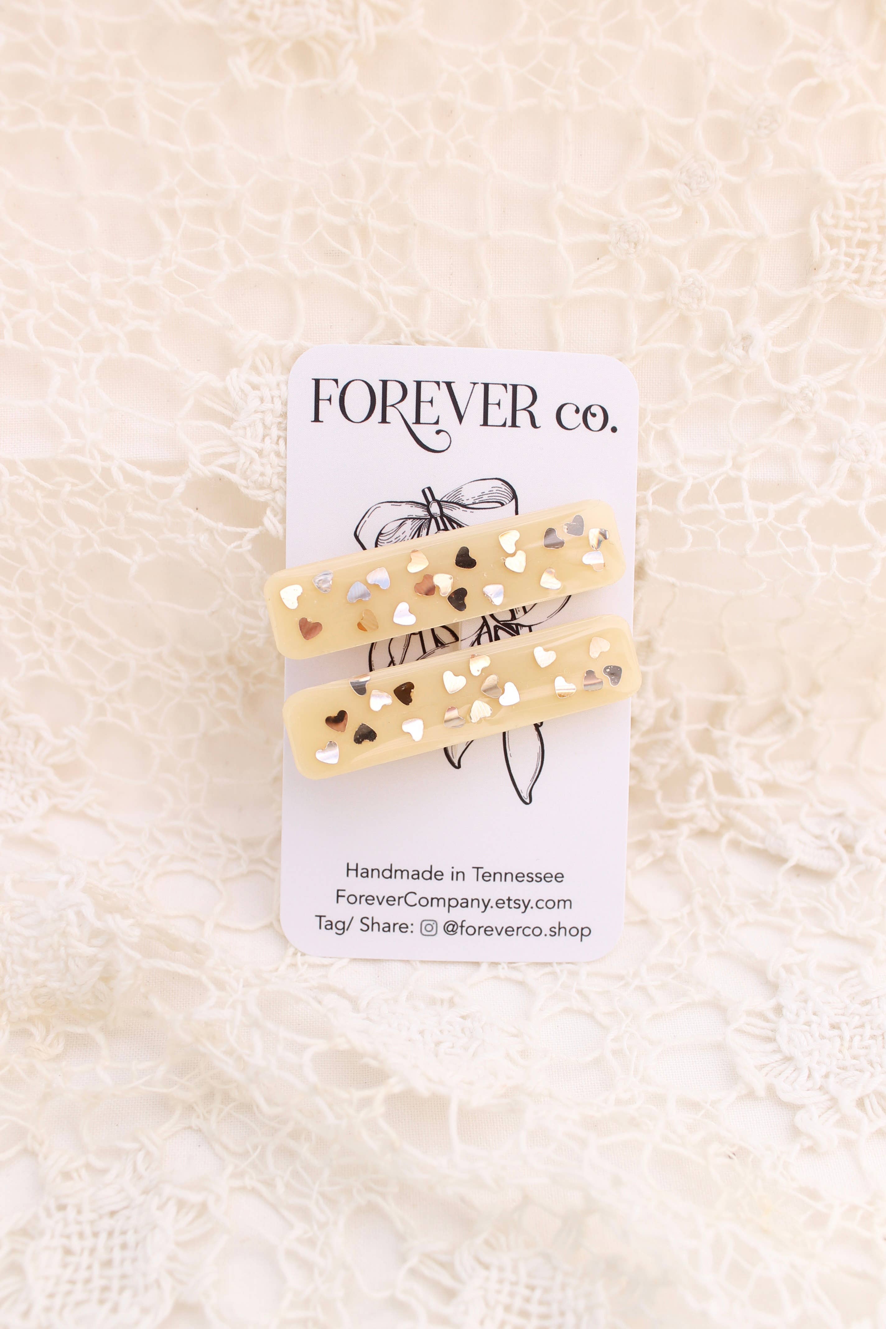 Forever Company specializes in handmade hair accessories. You’ll find beautiful color tones along with unique patterns and fun glitter combinations. Looking for a special phrase or customized name/ brand name on a hair clip? We can do that. (As long as it’s not political or a cuss word, sorry!)