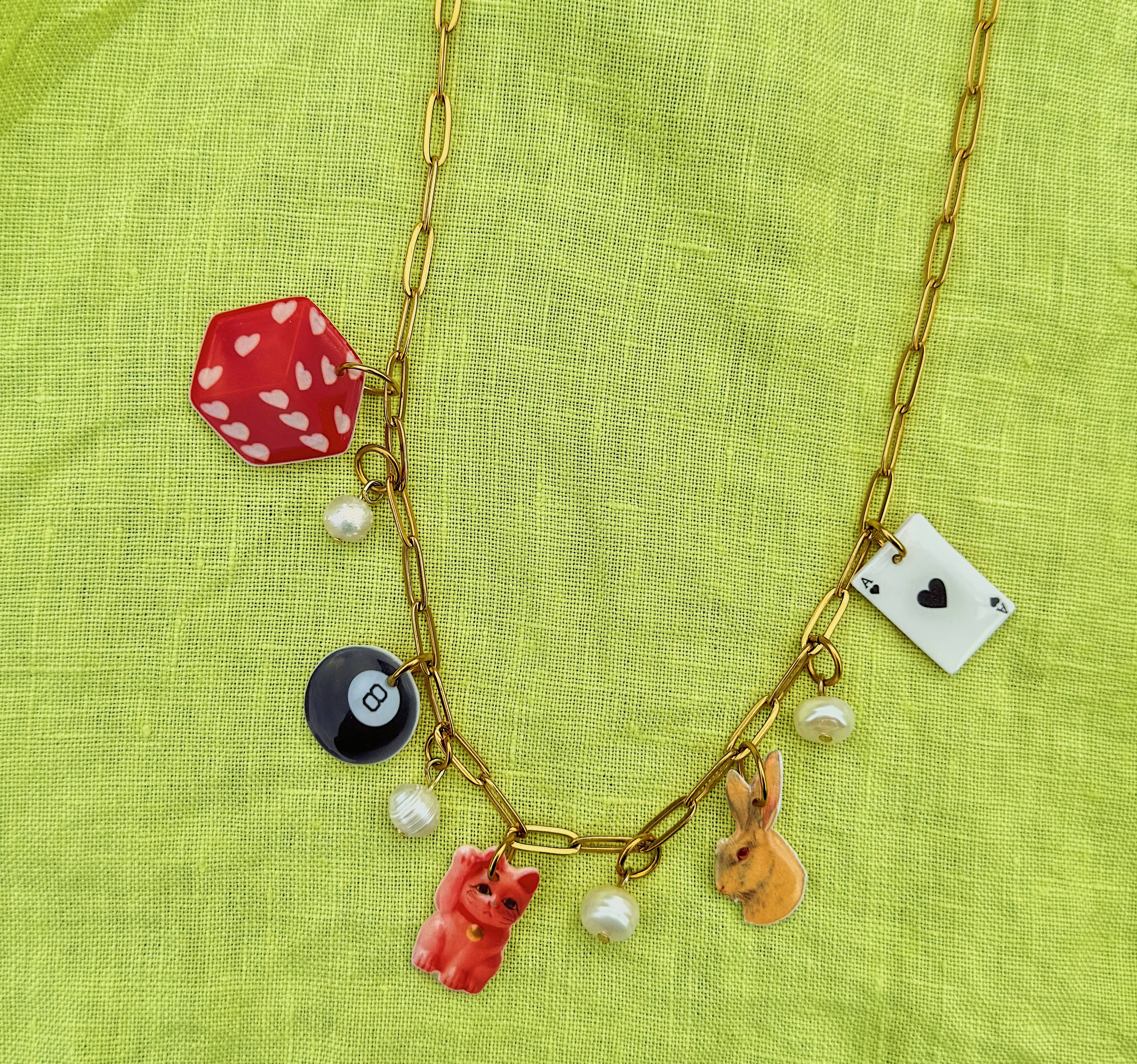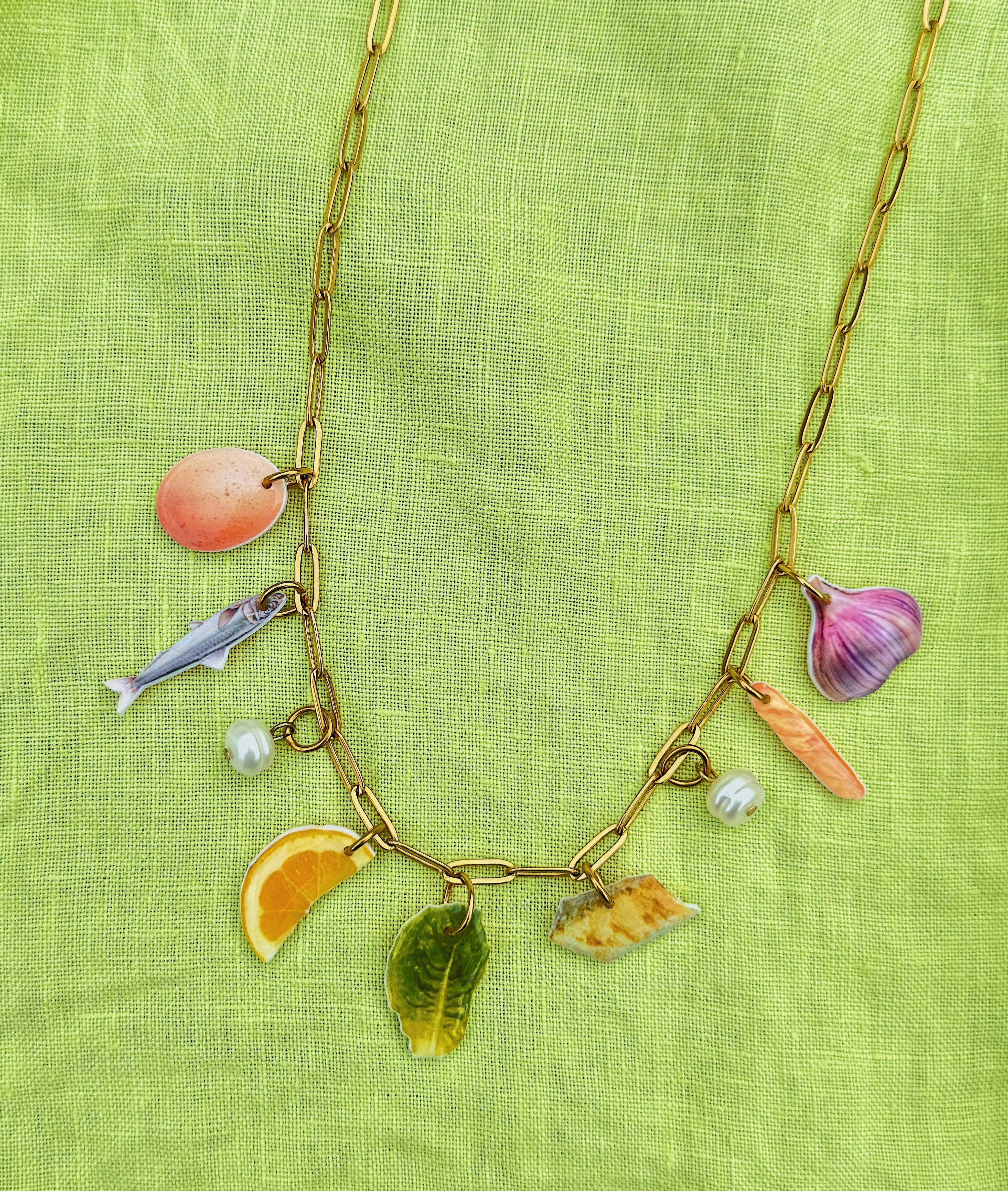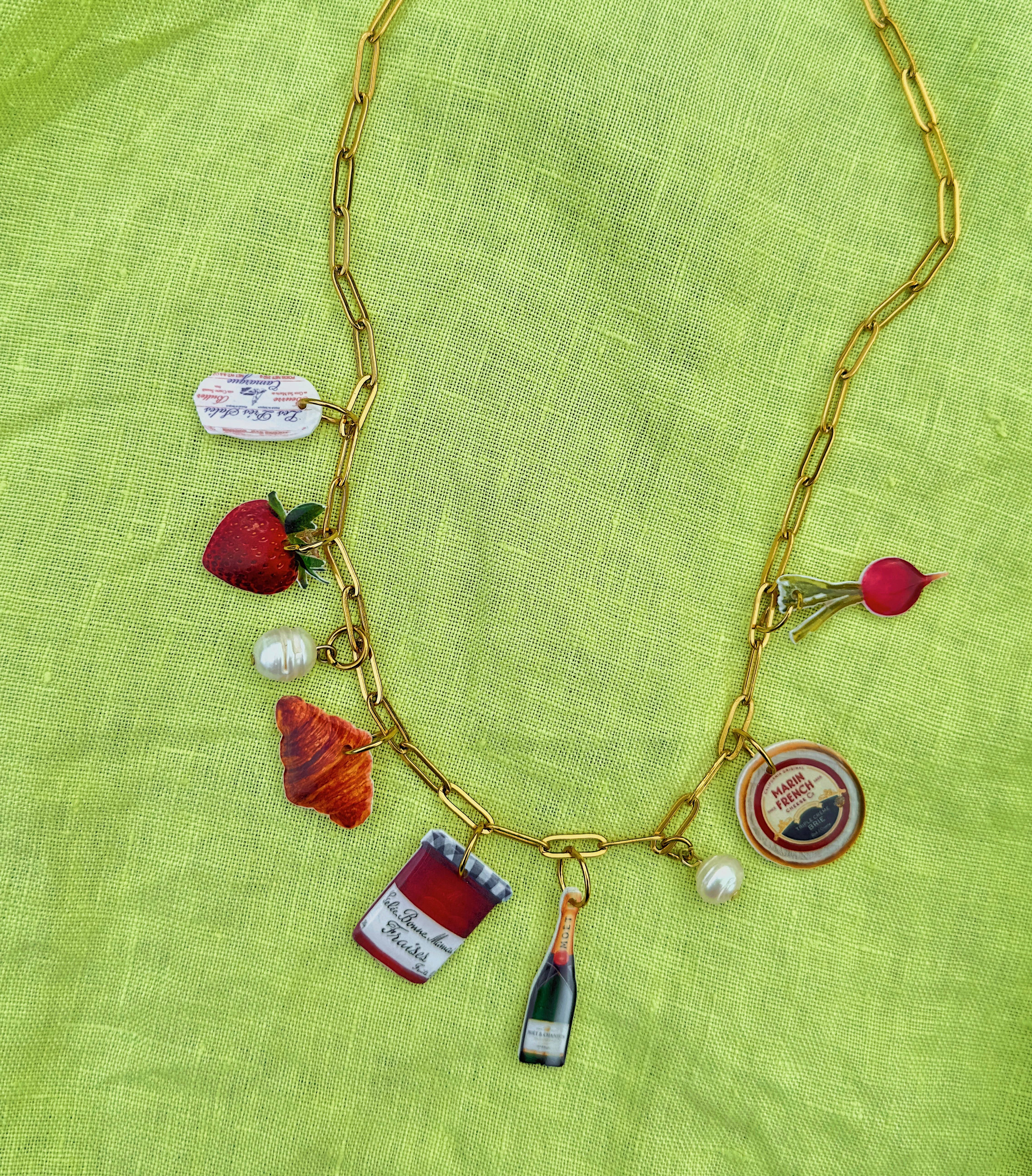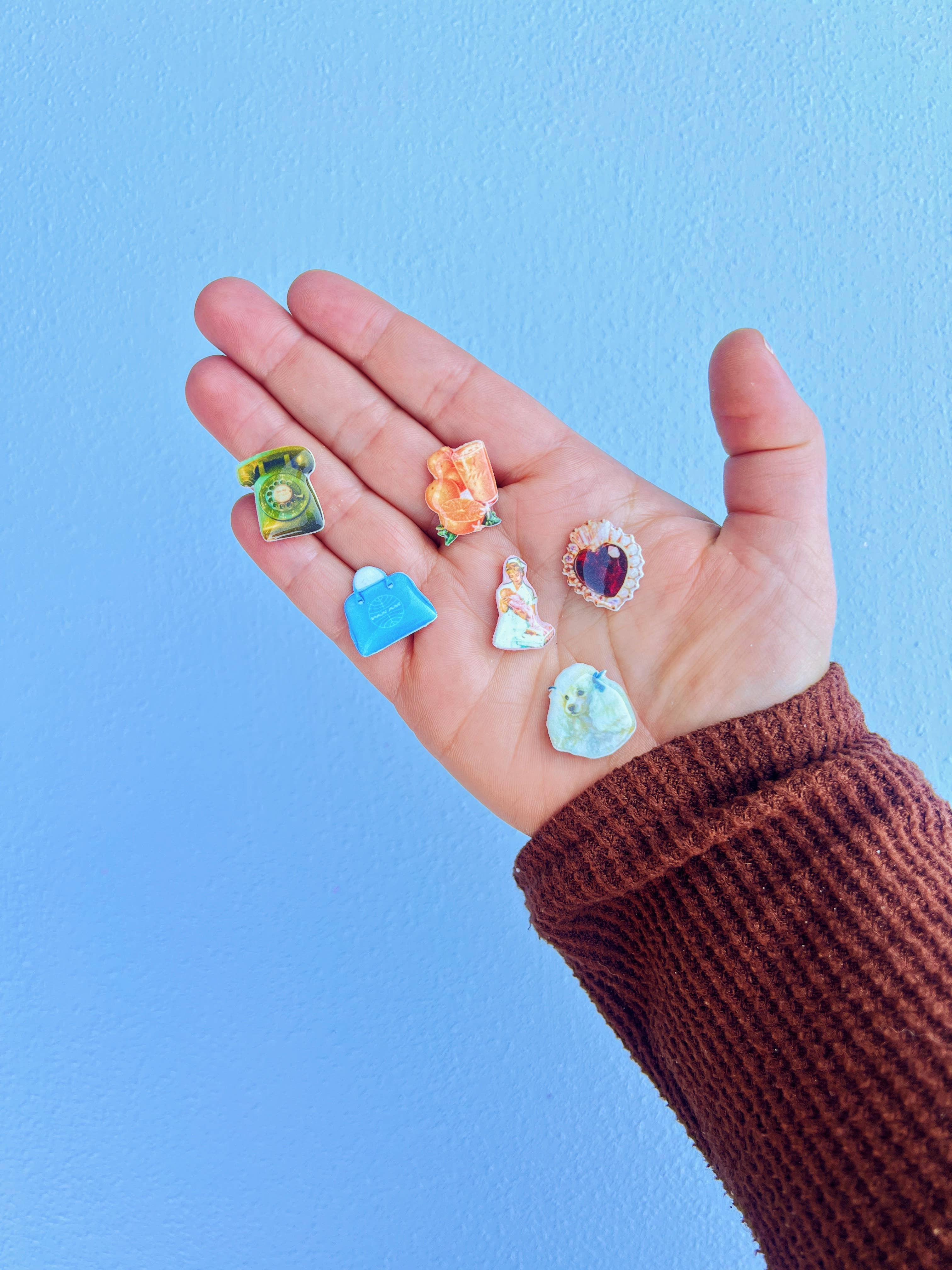Inspired by the abstract world, wiggly and wavy shapes appear in most of my packaging, displays, and signs. I love to explain the vibe of Goldfinch as “a disco in the desert”: bringing together the subtle textures and colors of the desert with the more playful nature that is the Daydreamer Charm Bar. Our charms are lovingly handmade in Portland, Oregon. The goal in creating this little world was to invoke a feeling of nostalgia through each piece, whether it be through our combined love of food, art, or pop culture. You’ll find themed necklaces, silly bag charms, and more, all composed of our ever popular Daydreamer Charms. Everything is hypo-allergenic, nickel-free, and tarnish resistant. While waterproof, I would take caution in introducing our Daydreamer Charms into water long term.