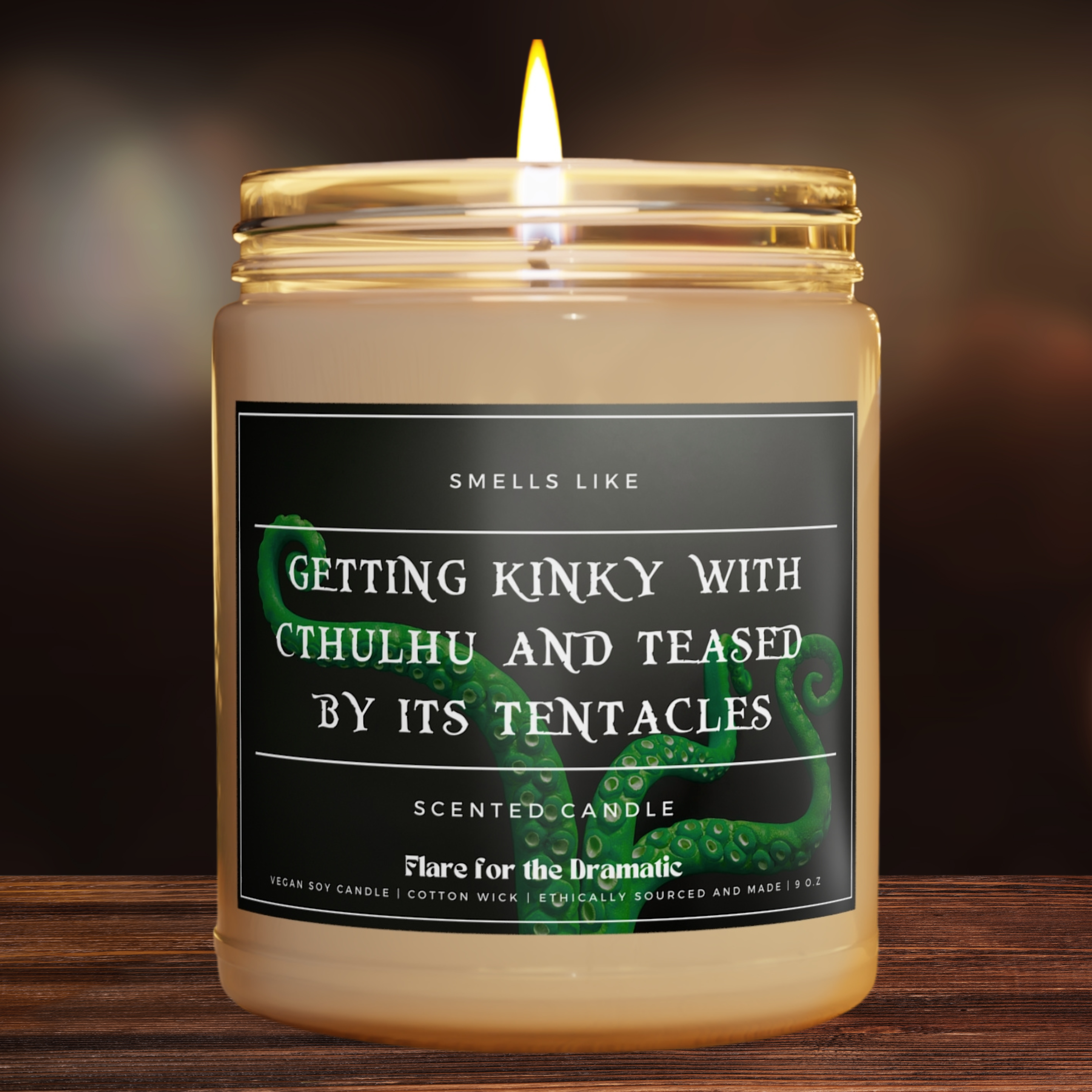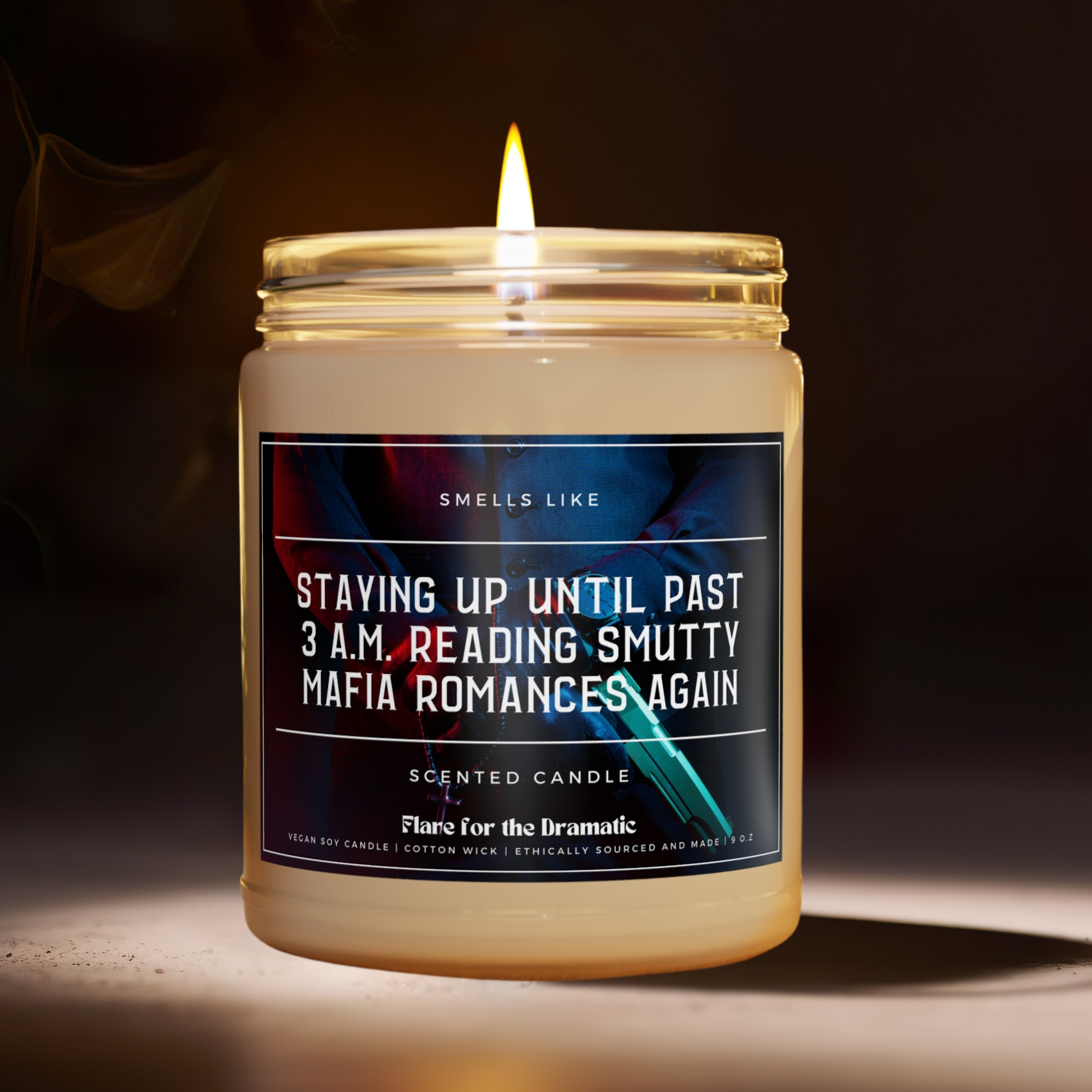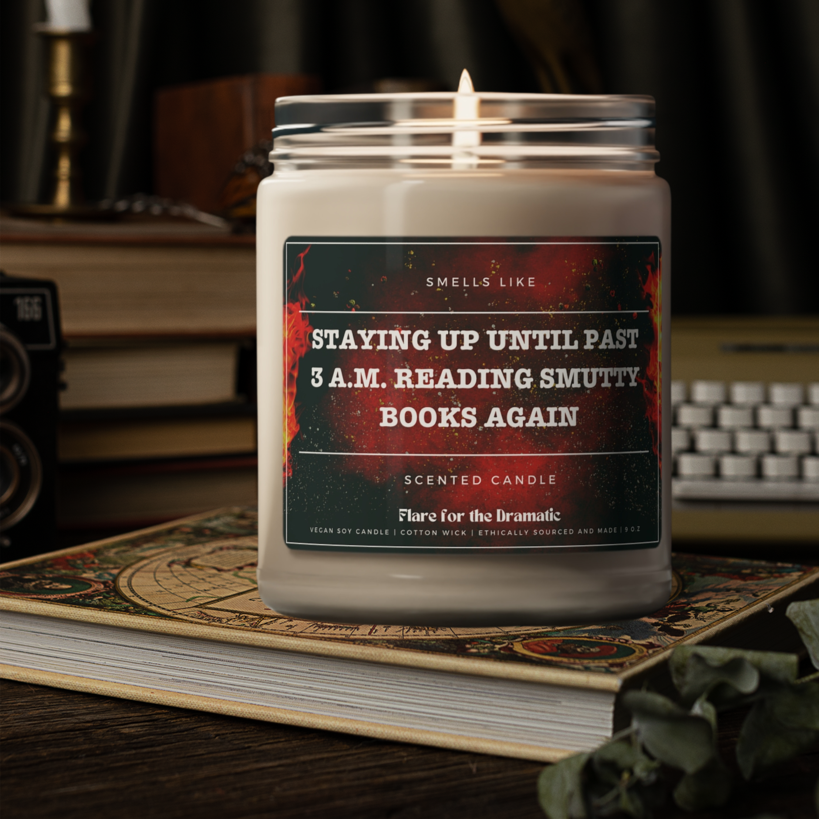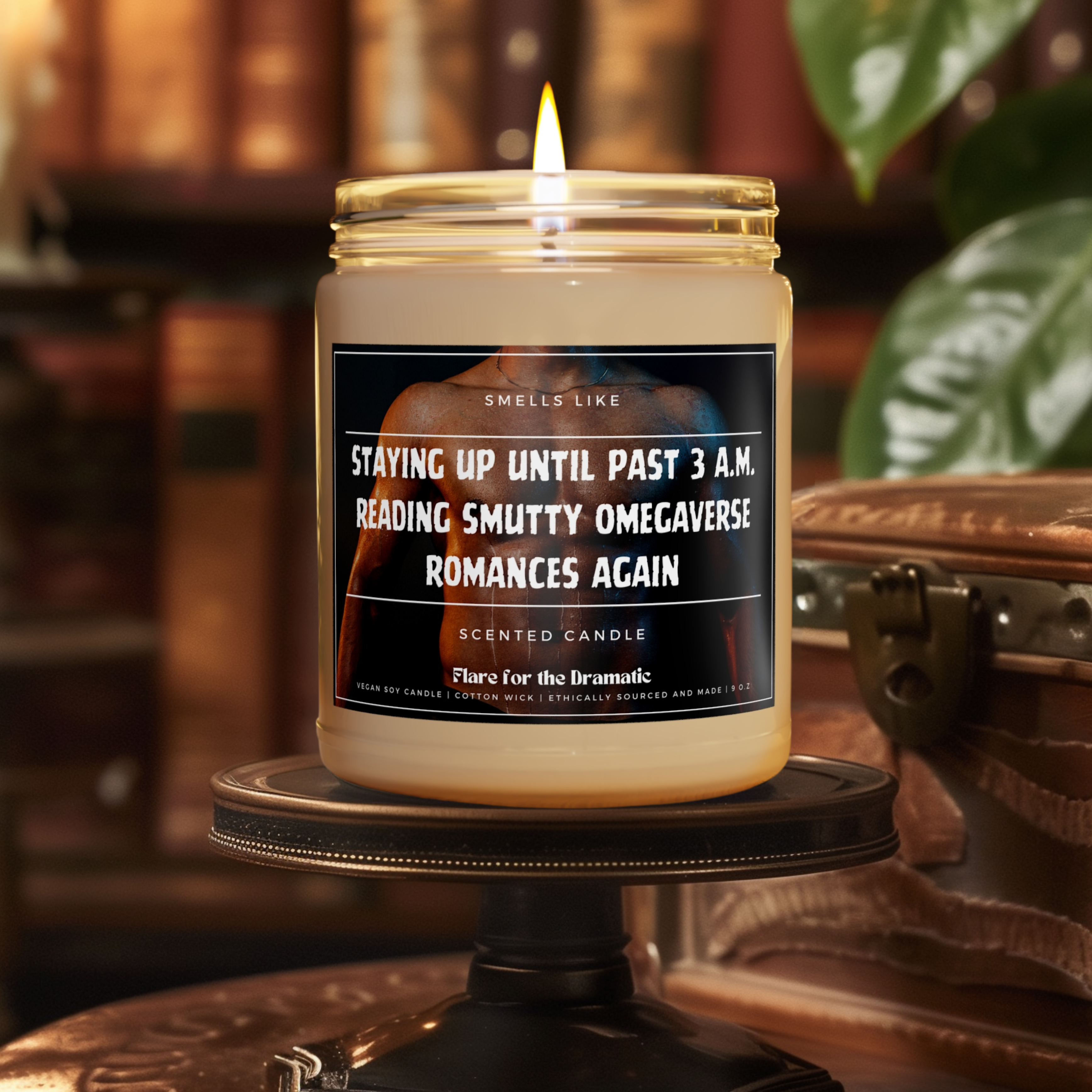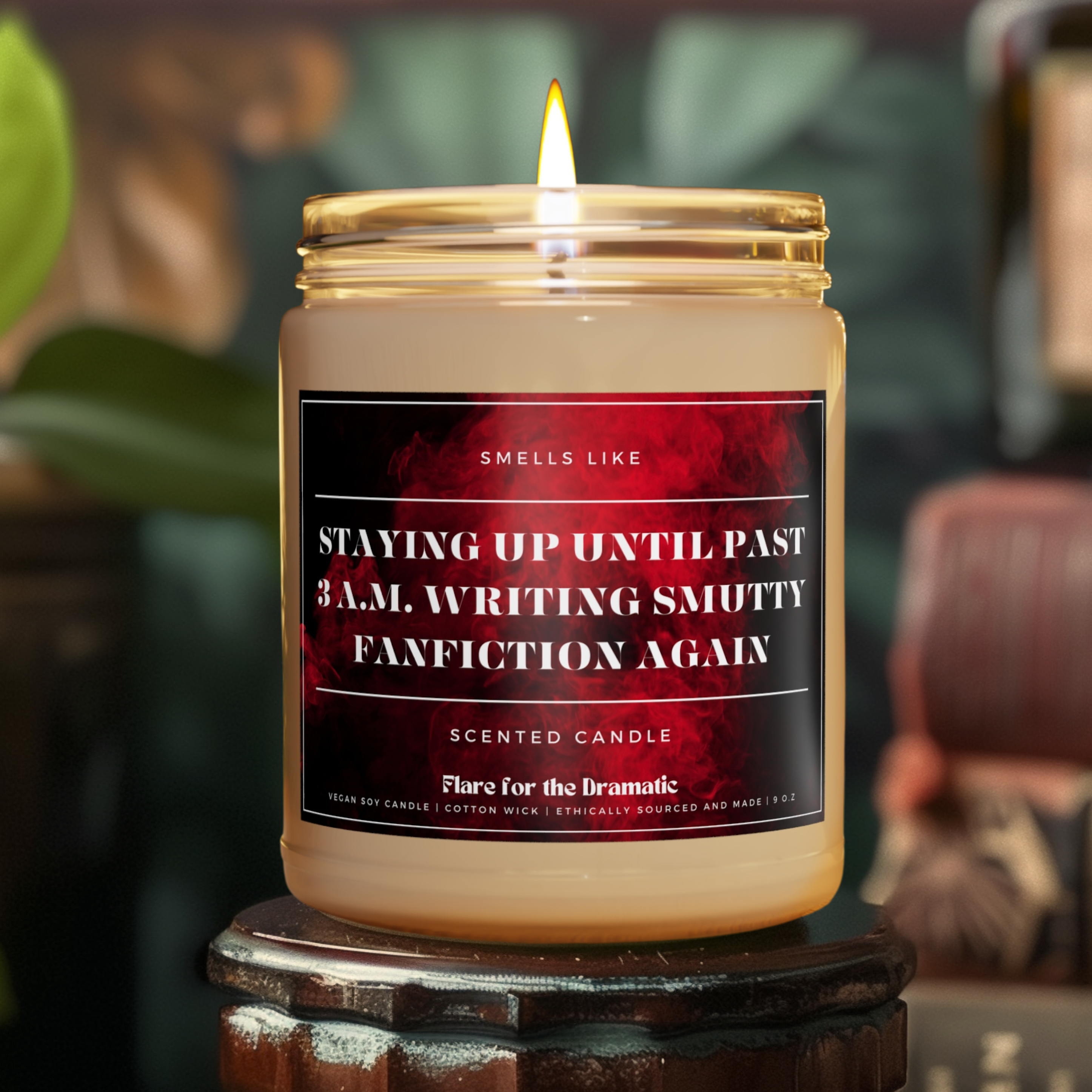 Flare for the Dramatic: spicy, funny scented candles for smut lovers and the hotties who who read spicy books (and fall for the fictional characters). Our candles are perfect for bookshops, coffee shops, stationery/writing supplies stores, gift stores, gaming and ttprg shops, geek/nerd culture events and more. Because if you're a fanfic stan, pop culture fanatic or bookish babe, these candles are for you. Our candles are packed with immersive aromas and come in covet-worthy scents. They're perfect for a modern aesthetic, so your home decor will be smelling good AND stylish. Each of our candles is lovingly hand-poured here in the US using a 100% natural soy wax blend, 100% cotton wick and a glass jar. We burn hot. Each candle has a burning time of 50-60 hours. And while we love dirty books, we care about clean ingredients. Our candles are non-toxic. That means no lead, plastics, parabens, synthetic dyes, or phthalates. Just the good stuff.