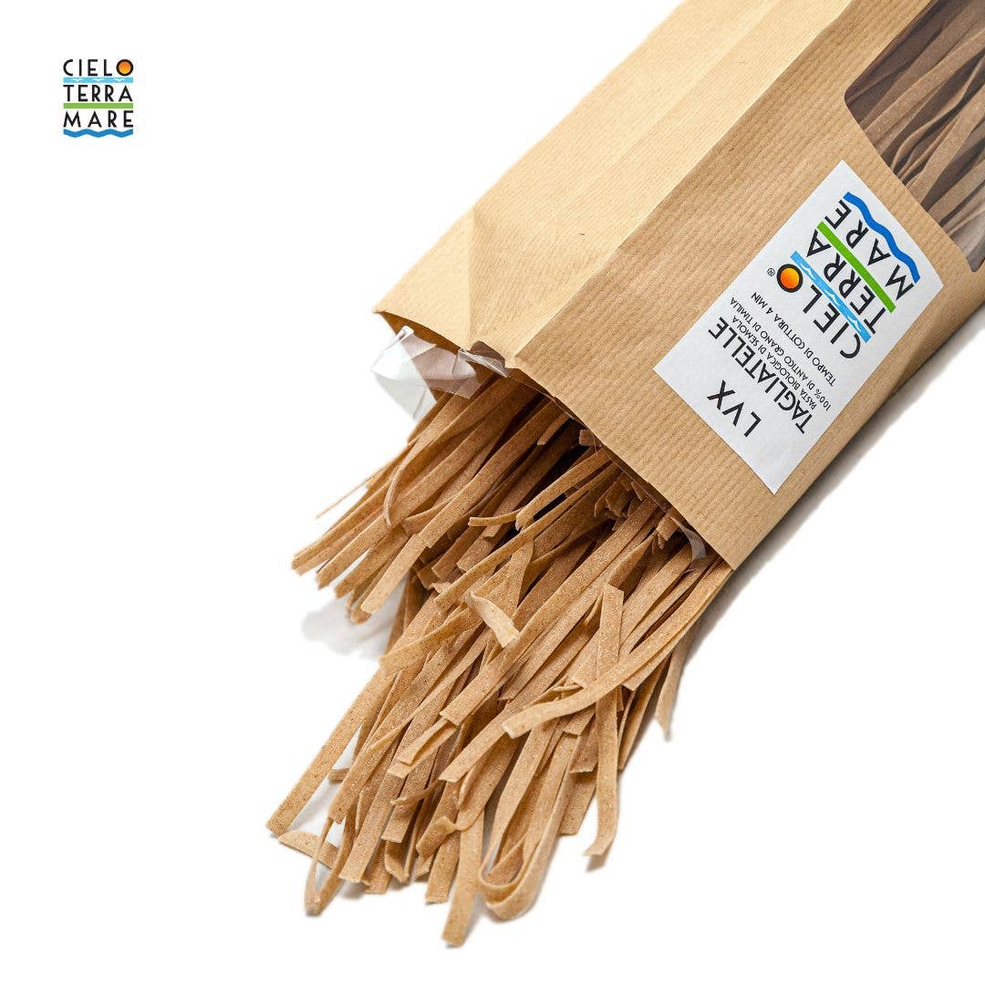 Pasta made with Timilia durum wheat semolina (Tumminia) Bronze drawn and dried slowly at low temperature Made from organic Timilìa (or Tumminìa) durum wheat semolina, ancient grain rediscovered by us in recent years and grown in the central area of Sicily. This pasta is the product obtained from the mixture of Timilìa granulated with water, from the next bronze drawing and drying at low temperature. The slow drying at low temperature, with a rest time of over 62 hours, it guarantees the complete maintenance of nutrients and its unmistakable aromatic scent. The ancient grains of Timilia. Timilìa is a variety of durum wheat that was in danger of extinction, typical of the center of Sicily, represents the Sicilian-Mediterranean biodiversity and is the result of a historic selection among the many varieties found in Sicily. Low gluten index - Timilìa has an index of gluten less than 15% (a measure of the structural strength of gluten) that differentiates it from modern grains that have indices greater than 90%. Some studies carried out on ancient grains show a lower allergenicity, compared to modern grains, such as to make them compatible with consumption for those suffering from gluten intolerances, other than celiac The disease. www.cieloterramare.bio