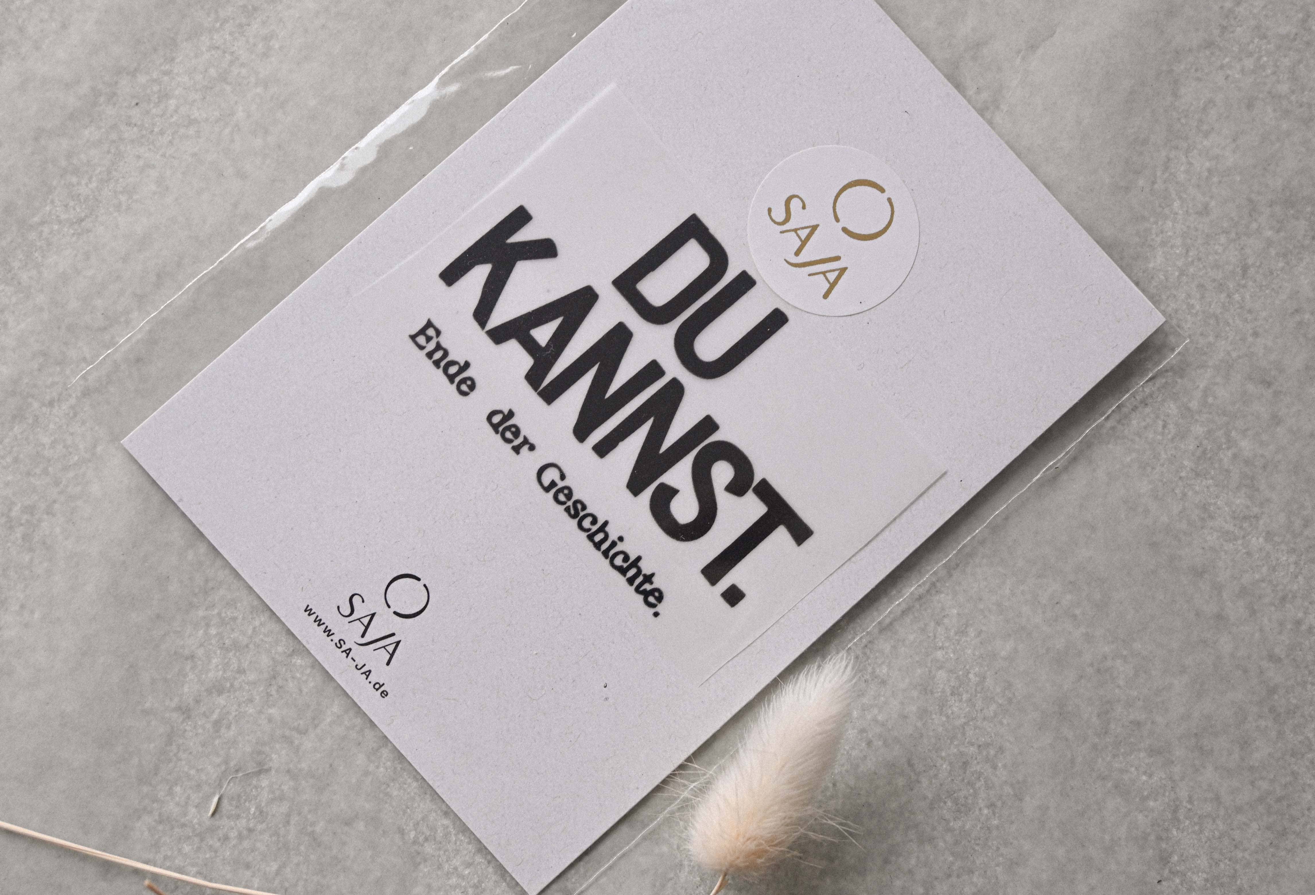 Hi, I'm Sabrina and the head behind SAJA Design Atelier. Here you can find stamped greeting cards and art prints with your own texts, beautiful quotes and funny sayings. To do this, I stamp each letter individually on the paper. The texts are then digitized and reproduced on recycled paper. The self-punched golden letters give some texts an elegant touch. They are punched by hand and individually applied to the art prints. My selection of texts on cards and art prints makes you smile and touch your heart. For more mindfulness, love and courage — for yourself or someone else in your heart.