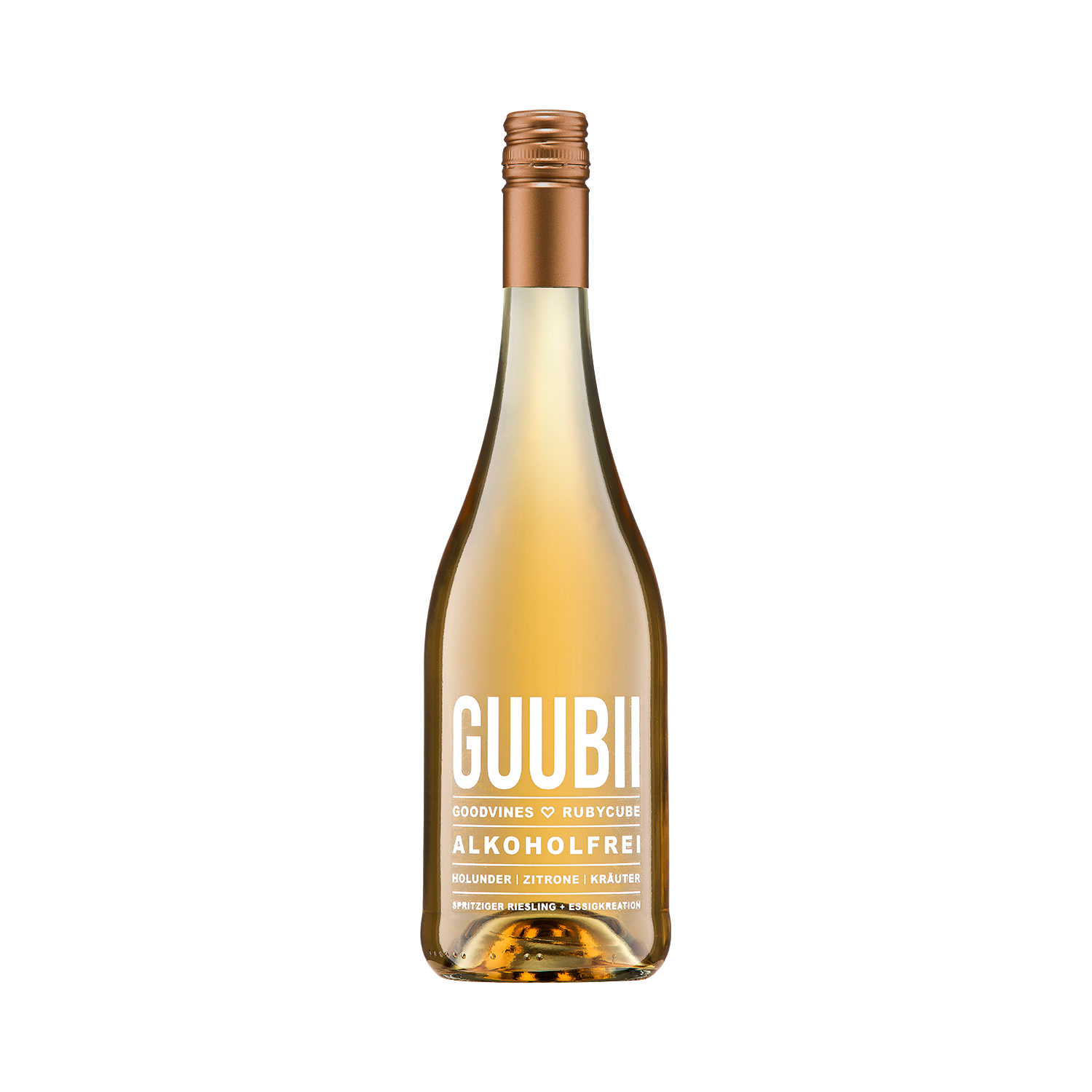 GUUBII is harmony in a glass. The world's first non-alcoholic wine aperitif made from Riesling and red wine vinegar gives you a fresh, fruity, tart taste experience that is elegantly slightly sparkling and surprises you time and time again. 100% unique, complex and outstandingly delicious. Several worlds come together to form an entire universe. Riesling in the best quality, which is gently dealcoholized following the excellent cellar work, and an extraordinary vinegar creation, which is produced once a year from red wine vinegar matured in wooden barrels, 11 selected herbs, freshly harvested elderflowers, lemons and natural cane sugar. The interplay of sweetness, acidity, fruit and spiciness harmonizes perfectly with the Riesling, underlines the wine character and together creates a completely new taste that you can drink again and again... and probably want to. Try GUUBII, be fascinated and surprise yourself and your loved ones. Completely alcohol-free, with the diversity of nature and lots of harmony in the glass.