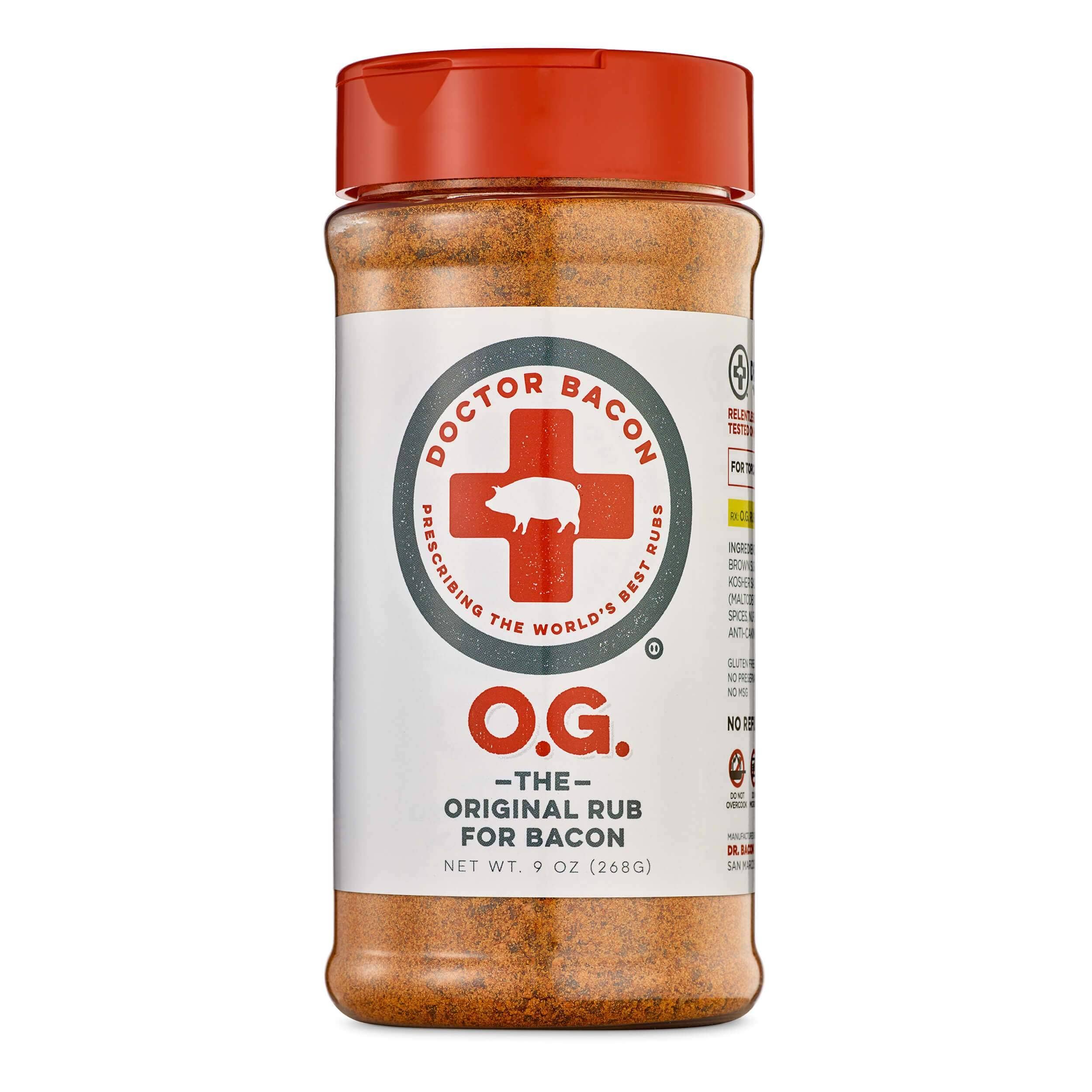 DR. BACON O.G. SPICE RUB is a unique and exciting blend of sweet and heat, creating a mouthwatering flavor profile to elevate your bacon and pork creations with a savory backbone and spicy kick on the back end. WITH VERSATILE FLAVOR, DR. BACON is not only delicious on bacon and pork dishes, but shines on salmon, shrimp, popcorn, French Fries, and vegetables like potatoes, asparagus, green beans, cauliflower, collard greens, and more! PERFECT FOR Smoked Bacon, BBQ Ribs, Deviled Eggs, Popcorn, Bacon Jam, Pulled Pork, Jalapeno Poppers, Armadillo Eggs, Breakfast Burritos, Shrimp Tacos, Bourbon Glazed Salmon, Brussels Sprouts, Pork Belly Burnt Ends, Pork Chops, and more! OUR UNIQUE RECIPE was developed to provide consistent results while being easy to use with a natural anti-caking agent, safety seal, shaker side and sift side for easy application.