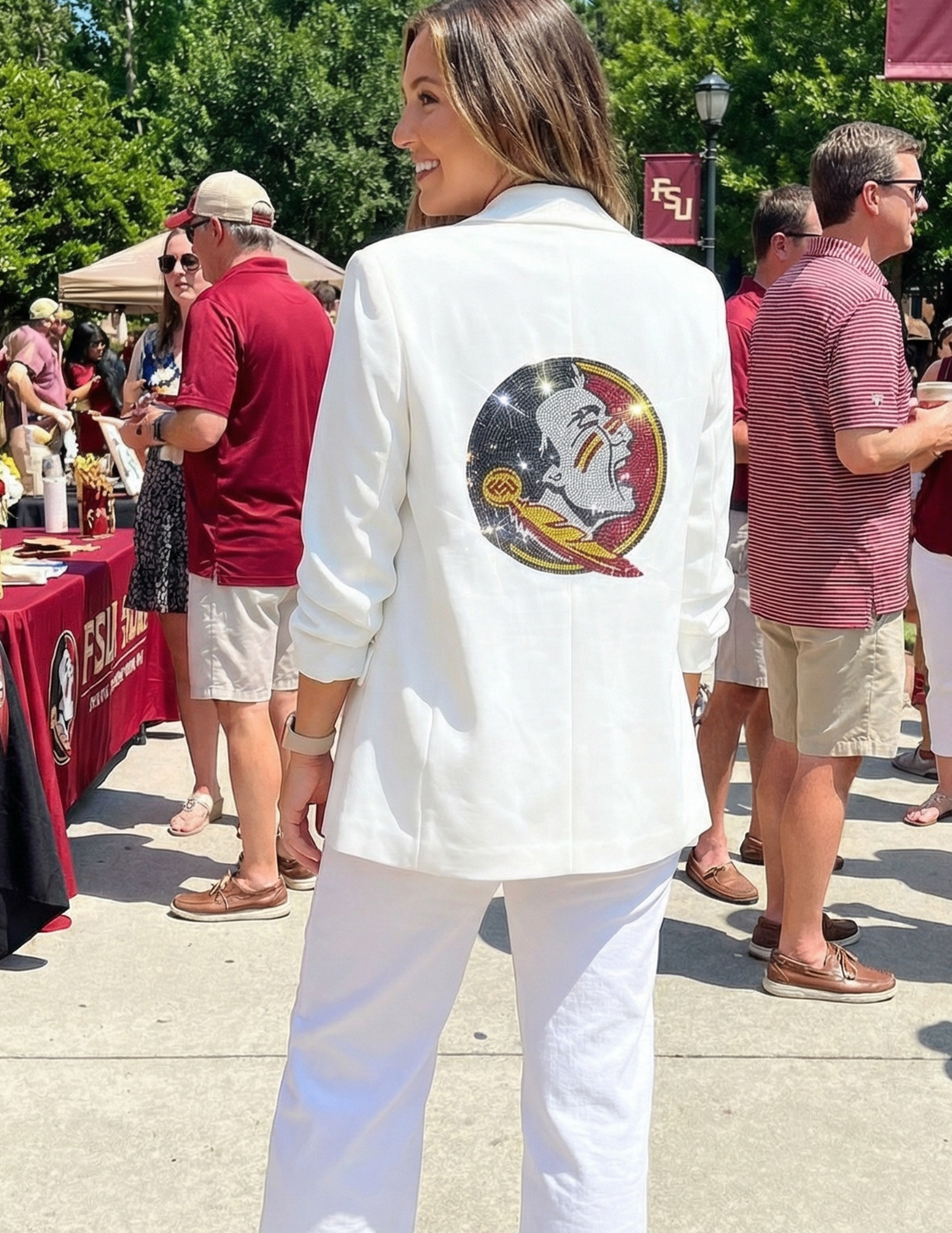 Moving Forward Designs was born from a passion for blending elevated fashion with college game day pride. As a woman-founded brand, we saw a gap in the market for apparel that celebrates school spirit without sacrificing style. Our designs feature bold embellishments, flattering cuts, and luxe details — transforming everyday sweatshirts, jackets, and blazers into statement pieces that fans actually want to wear. We are proudly licensed with top universities and deeply committed to representing each school with authenticity and flair. Every rhinestone we place, every silhouette we design, is done with the goal of making women feel confident, fashionable, and proud of their team. At our core, we care most about craftsmanship, originality, and empowering women to express themselves — whether on campus, at a tailgate, or beyond game day. Our vibe is relaxed and playful. Our goal is to bring a touch of edginess and extraordinary to the ordinary. Our motto is keep pushing boundaries, exploring form and fashion, and always continuing to move forward!