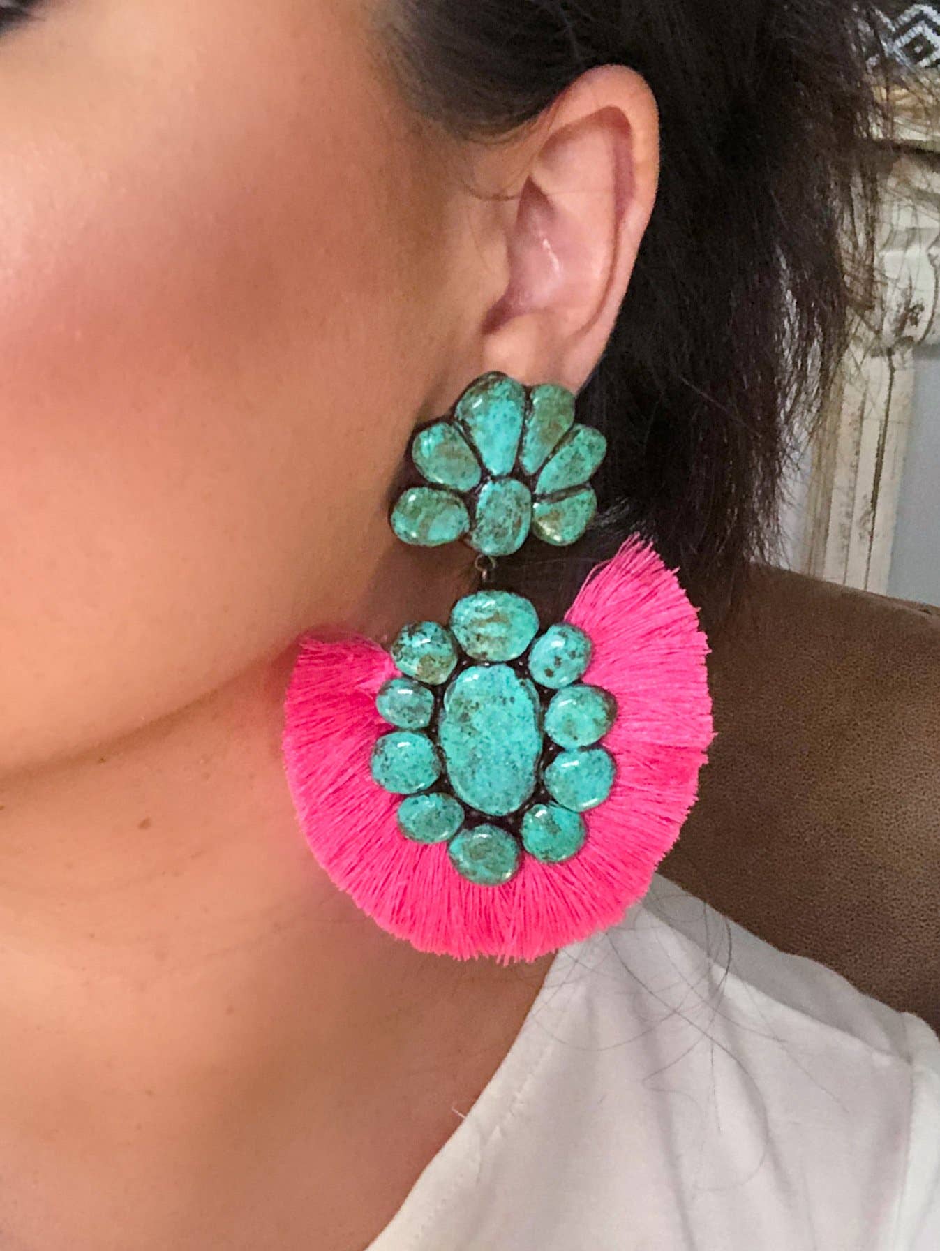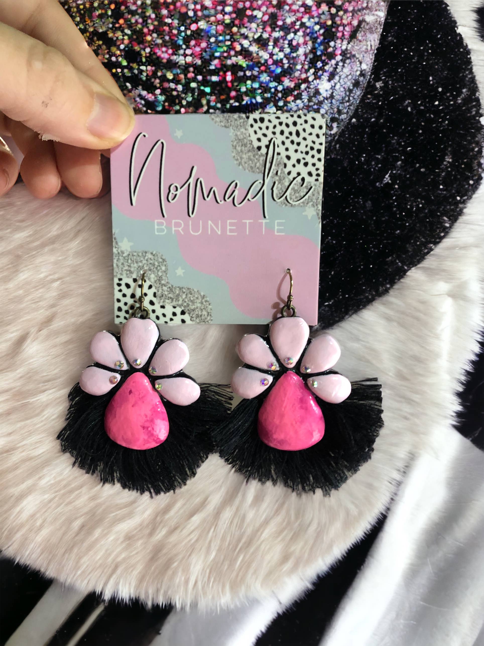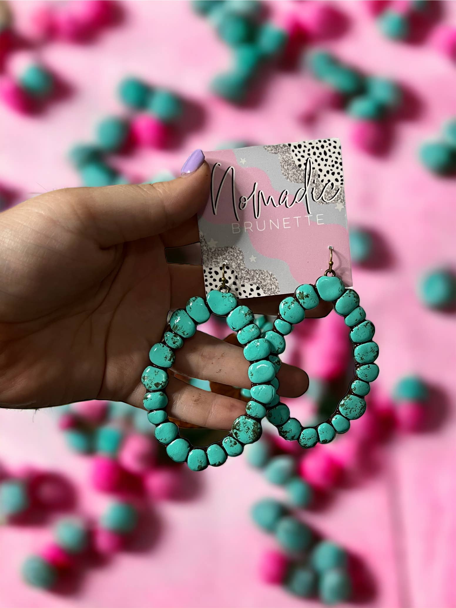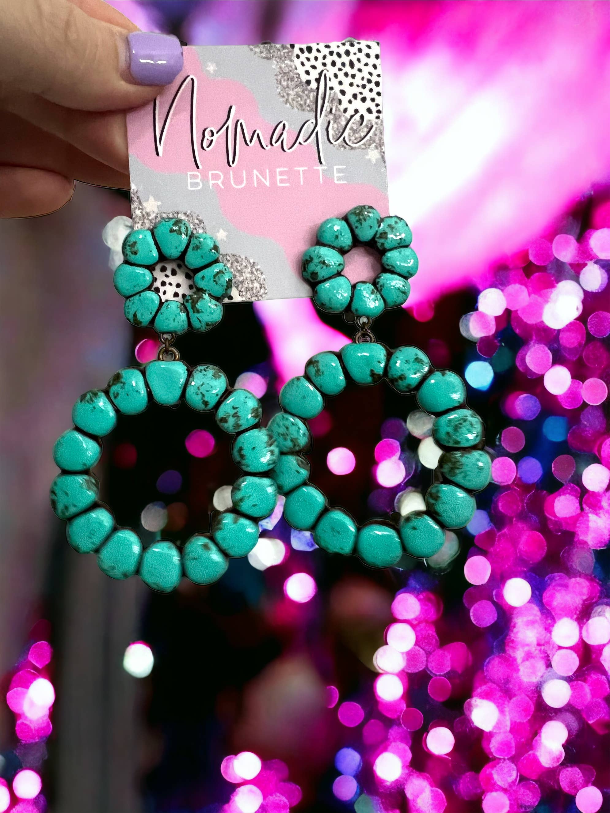 Nomadic Brunette is a handmade jewelry brand inspired by movement, earthy textures, and a love for bold, effortless style. Every piece is designed and created by me, Talia, using clay and other natural elements to mimic the beauty of turquoise and stone without the weight or high cost. My work is heavily influenced by the Southwest, with hints of boho and Western flair, but it’s also personal. I pull from my own roots and stories to create designs that feel soulful, grounded, and a little wild in the best way. Nomadic Brunette is for the ones who don’t mind standing out. The ones who love big earrings, turquoise tones, and that feeling of finding a piece that just fits. Each item is lightweight, made by hand, and totally one of a kind, just like the women who wear them.