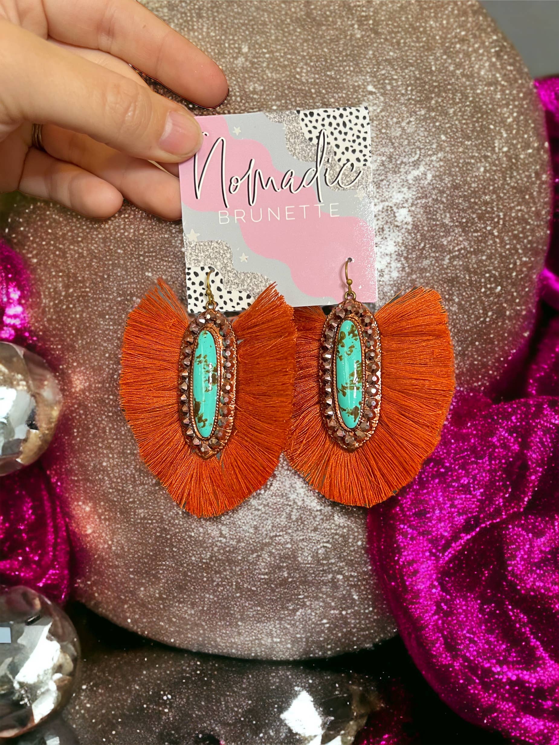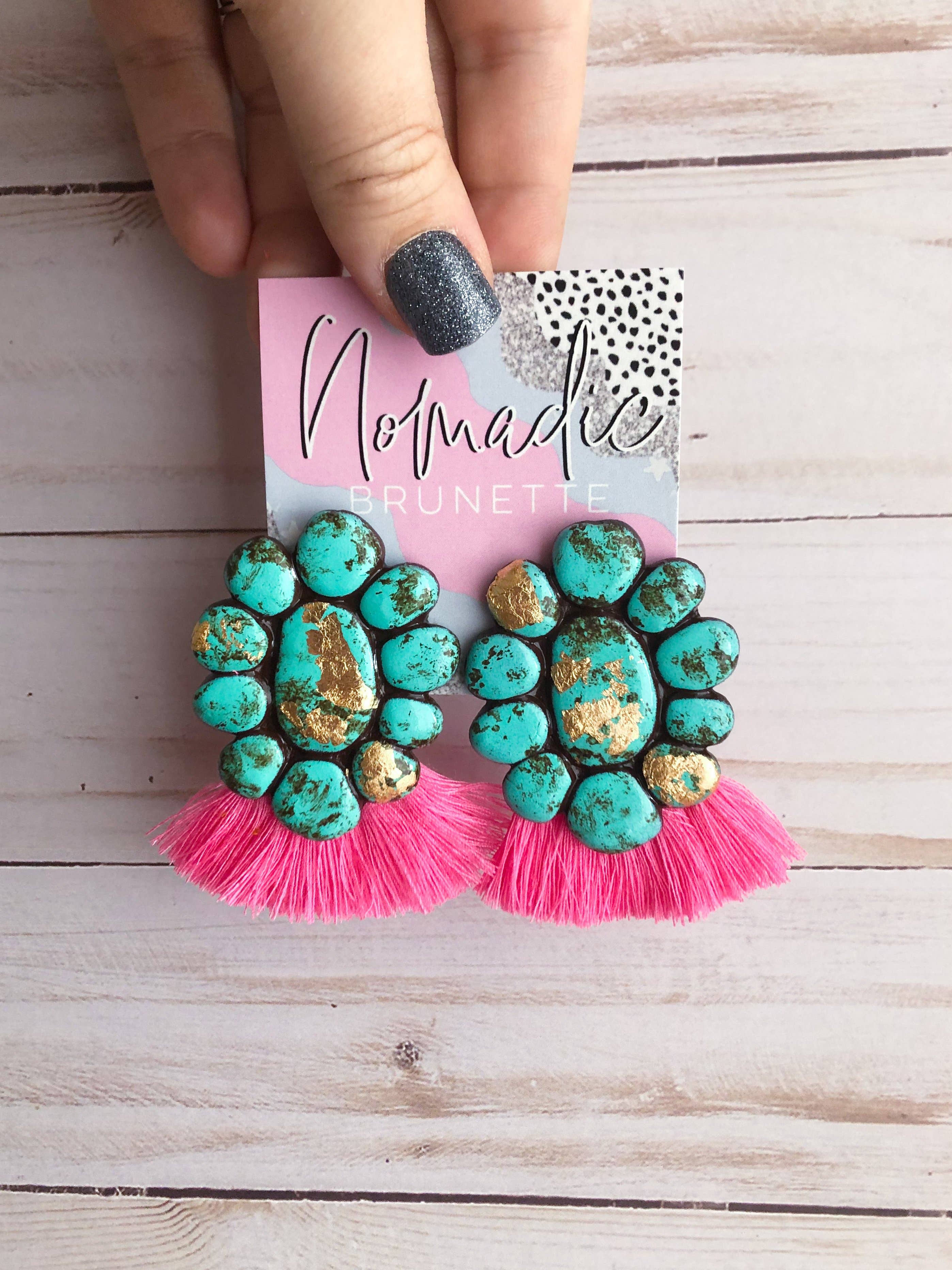 Nomadic Brunette is a handmade jewelry brand inspired by movement, earthy textures, and a love for bold, effortless style. Every piece is designed and created by me, Talia, using clay and other natural elements to mimic the beauty of turquoise and stone without the weight or high cost. My work is heavily influenced by the Southwest, with hints of boho and Western flair, but it’s also personal. I pull from my own roots and stories to create designs that feel soulful, grounded, and a little wild in the best way. Nomadic Brunette is for the ones who don’t mind standing out. The ones who love big earrings, turquoise tones, and that feeling of finding a piece that just fits. Each item is lightweight, made by hand, and totally one of a kind, just like the women who wear them.
