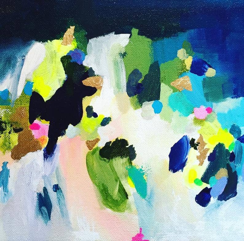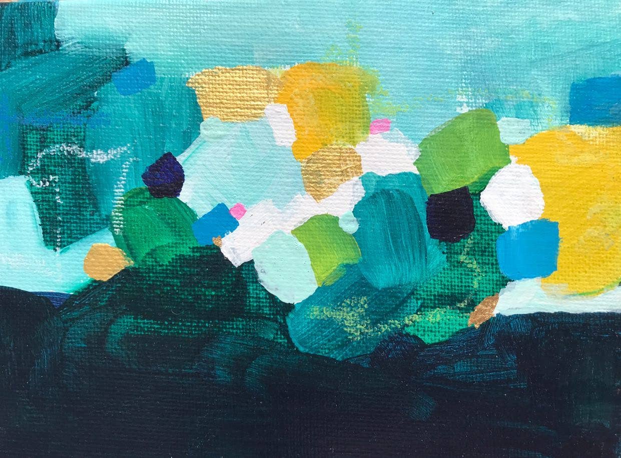 Missy Monson is an abstract artist with a love for color and fun! She playfully paints vibrant shapes into happy compositions with a slight sense of nostalgia or mise en scène. She uses bold color palettes blended with softer ones for a captivating mix that create a sense of joy and wonder. Travel(nature), poetry, and music are her greatest inspirations! She also paints florals, still lifes, and impressionistic seascapes. She is based in Excelsior, Minnesota with her two darling children, smart husband & not always on-best-behavior-but-love-anyway dog. You can find her art in person at Golden Rule, or shop via her website, also a few select online shops!