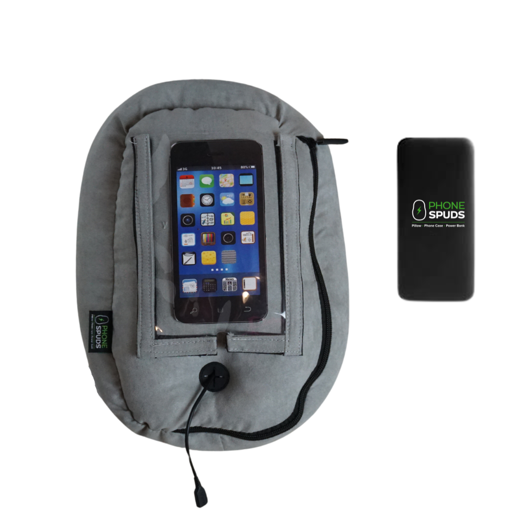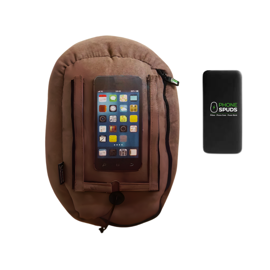 Hi! I’m Kim. In 2021, I was recovering from a head injury, and I wanted my phone charged and nearby at all times. I needed a comfortable way to hold, use and charge my phone while resting. PhoneSpuds was born. PhoneSpuds are pillow phone holders with a potato vibe. They stand up vertically and horizontally, and they even have a cubby for keeping your power bank and other accessories. Both fun and practical as a potato!