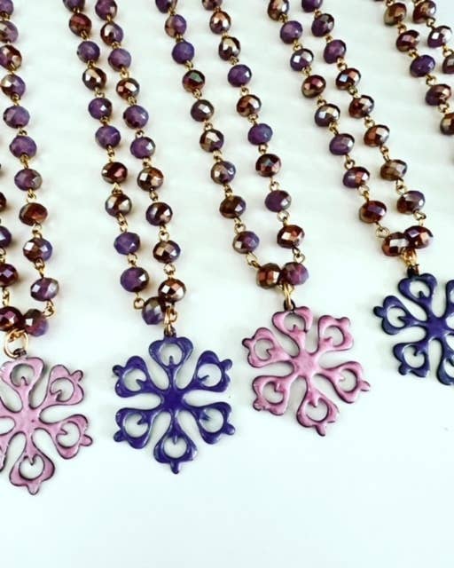 Michelle DaRin Jewelry is best described as bohemian, bold, edgy, and eclectic style. Michelle DaRin’s designs are inspired by her love of color and nature. She uses a variety of materials including forged and enameled copper, caste silver, resin, bronze, feathers, leather and gem stones. Michelle received her BA in Sculpture from SUNY Cortland. She went on to pursue her MFA in Metalsmithing from Syracuse University and combines her love of sculpture into wearable art jewelry. Her work has been featured in various magazines including W, Bridal Guide, Where Women Create, Tango, Syracuse Women’s Magazine, The Post Standard, as well as on NBC Today Show, Bridge Street, and Daily Candy. Her work is constantly evolving and reflects her passion for art, life and the creative process. Her studio is located in beautiful Upstate New York on her 7 acres of inspiration with her family and four dogs. All designs are protected under federal trademark laws.