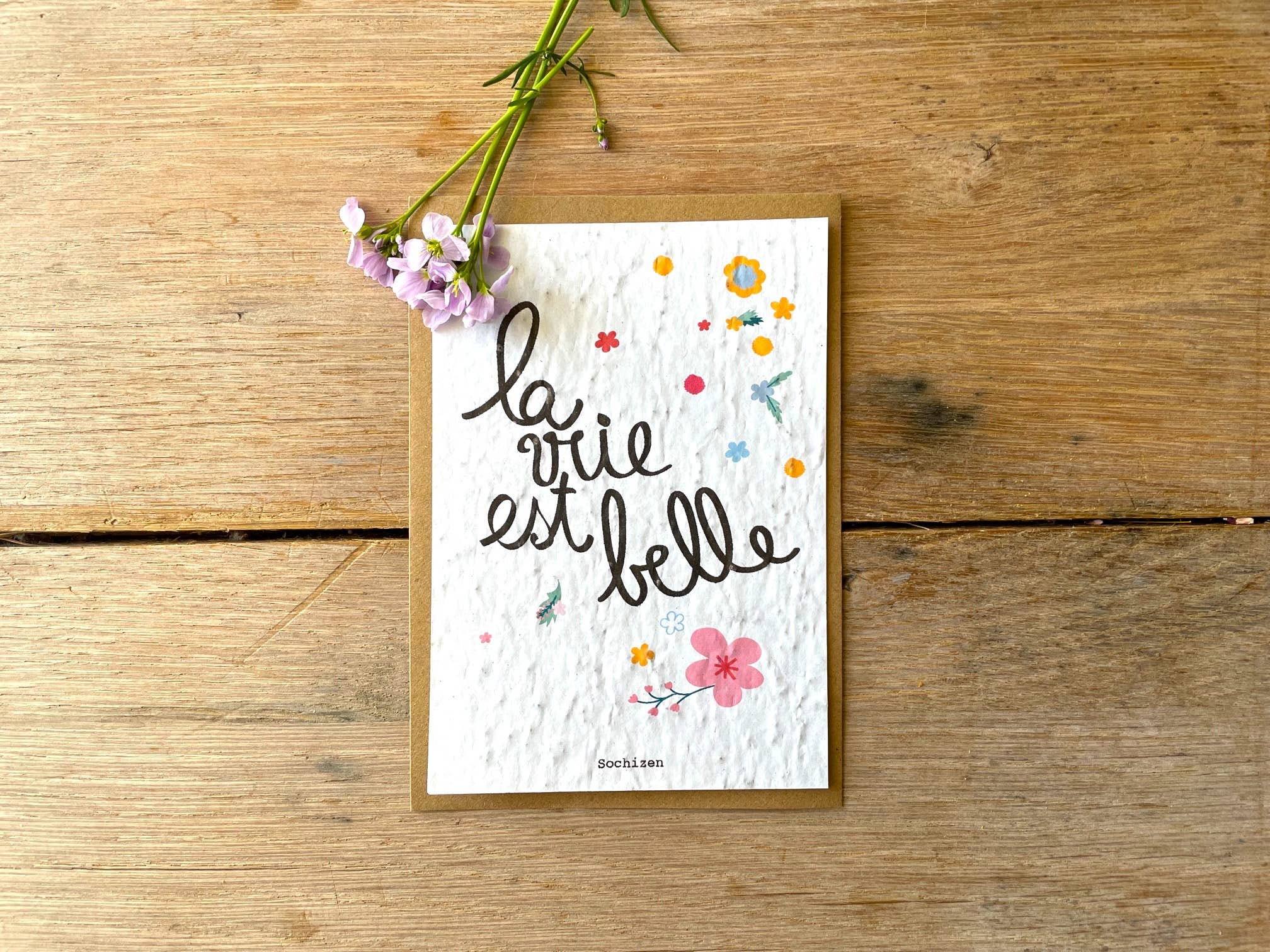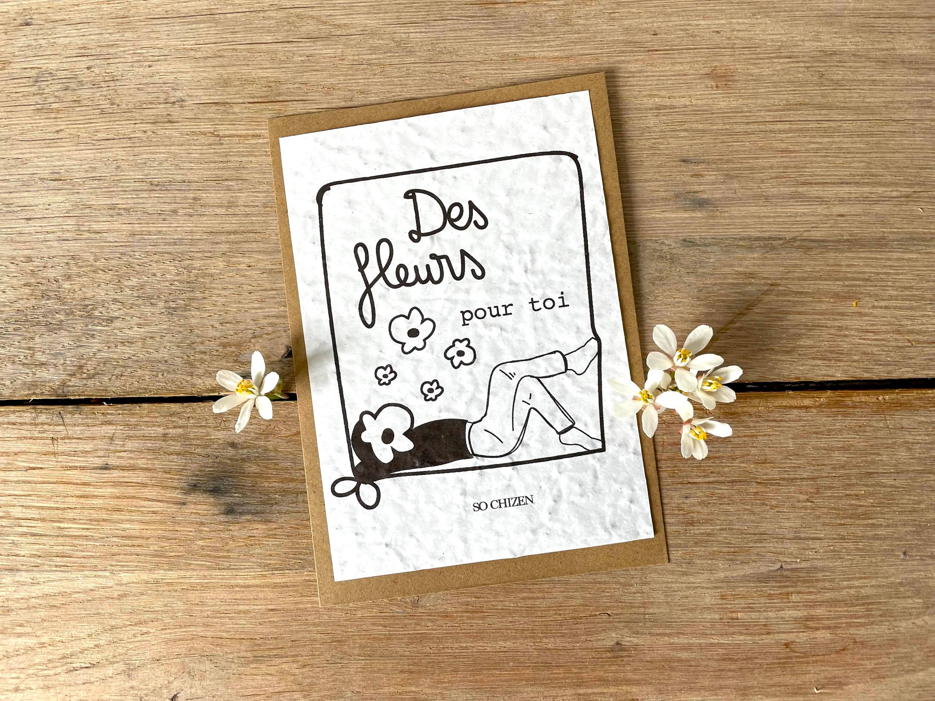 "Make your messages bloom 🌱💌" Send your thoughts, wishes, and sweet words in a card like no other! At sochizen, we sow smiles AND flowers: our plantable cards turn your messages into a burst of greenery. Birthdays, love declarations, congratulations, or simple "hello"? Our cards adapt to all festive occasions, and they do much more than just sit on a shelf: they become plants! ✨ Why is it great? 🌍 Zero waste, 100% nature: Made from biodegradable seed paper, our cards grow after use. 🌸 Two-in-one gift: You give a lovely thought AND a potential bouquet. 🐝 A gesture for the planet: Our cards bloom to feed bees and color gardens. So, say goodbye to sad cards that end up in the trash, and hello to eco-friendly and joyful correspondence. With us, every word planted can change the world... or at least beautify a flower pot! 🌱💕
