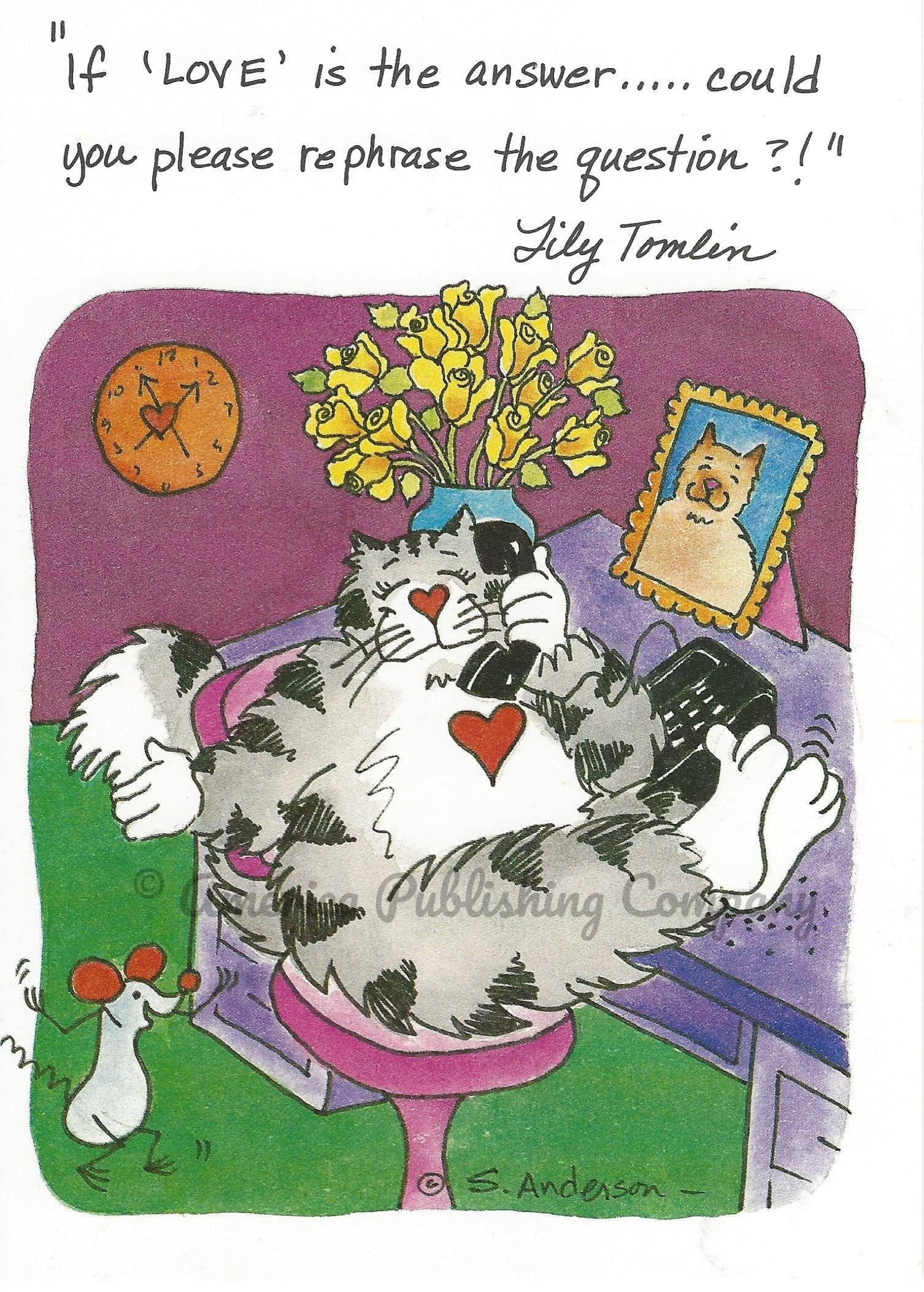 Welcome to a ‘happier’ life! Meet Bart, the 'Cosmic Cat' and his whimsical friends. Do you love smiling cartoon cats, intriguing quotations, and thoughtful greetings. Send one to a friend. They’ll feel better, and so will you! The FeLines Story John, a publisher from Central Florida, married Susan, a Portland artist. Susan wanted to become a "professional artist." A friend suggested quotations on cards with sketches of cats. Susan hand-painted a dozen card samples with their cat, Bart, dancing through life. John showed the sample cards to a bookstore owner friend, and a new venture was born! Students and retired friends helped hand-paint the first 60,000 cards. Thousands more were color-copied, then color-printed, filling orders from stores across the Northwest and beyond. Quotations, art and greetings were continuously revised. Only recycled paper was used for cards and envelopes. Out of consideration for the environment, only soy-based inks were used. There was also experimentation with tree-free papers. Quotes were selected if a smile or laugh resulted. Authors and artists – famous and infamous – provided quotations that could be matched with art. Greetings had to “snap” when the card was opened and read. Thousands of stores across the country carried the line. From 1991 to 1999, thousands and thousands of lives were brightened when folks got a FeLines card.