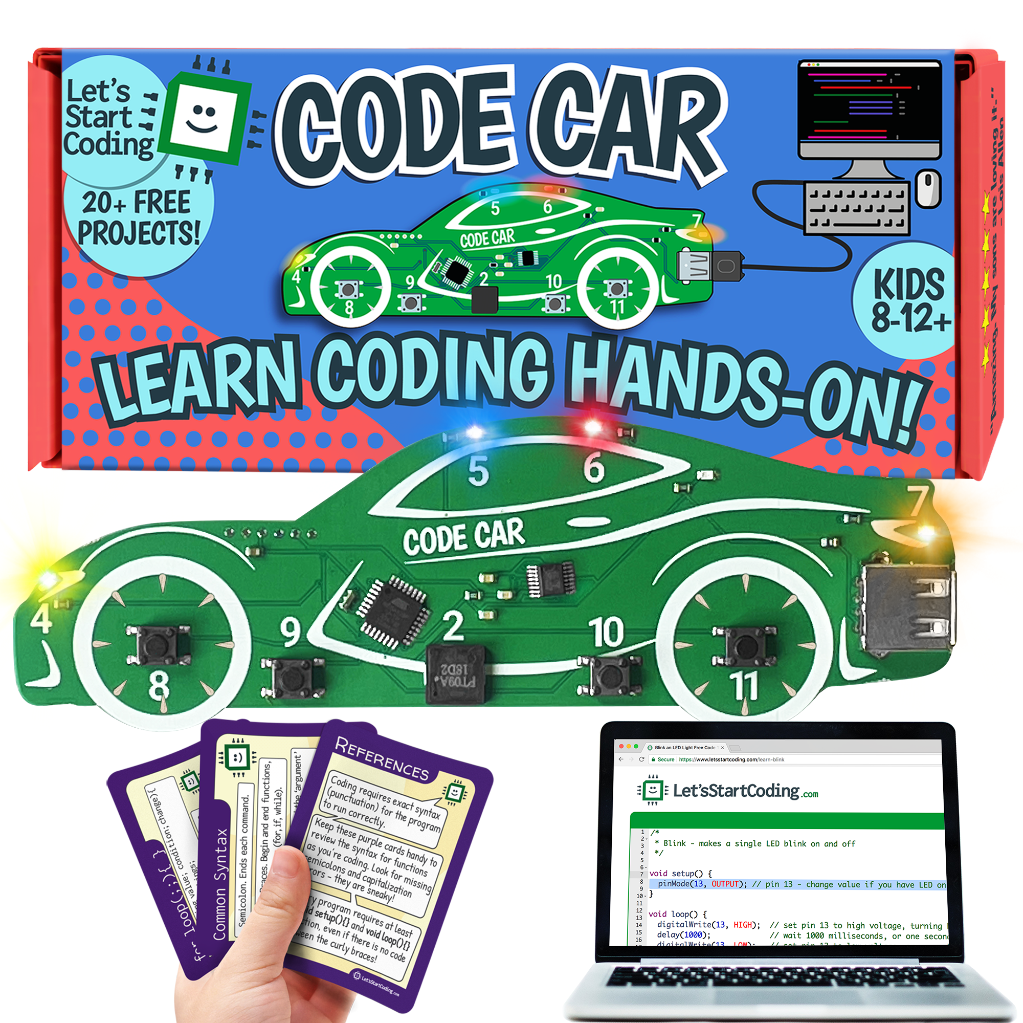 Let's Start Coding brings the "aha!" moment to kids through hands-on coding kits. We make technology approachable through an online platform of projects, videos, and challenges. Girls and boys aged 8-12+ can learn real computer code with blinking lights, beeping speakers, arcade-style buttons, sensors, rainbow LED light strips, and more. Let's Start Coding provides support to customers through live chat and email, plus our email newsletters that encourage and enable kids to code. We are committed to inspiring kids' interest and comfort with technology to build a stronger STEM future. Designed in Louisville, Kentucky based on feedback from kids, parents, teachers, and summer camp leaders, each Let's Start Coding kit offers a unique approach to the same core coding fundamentals used at NASA, Apple, and in government coding systems. The kits are excellent as gifts for that curious and precocious kid on customers' gift list because they are so flexible and open-ended.