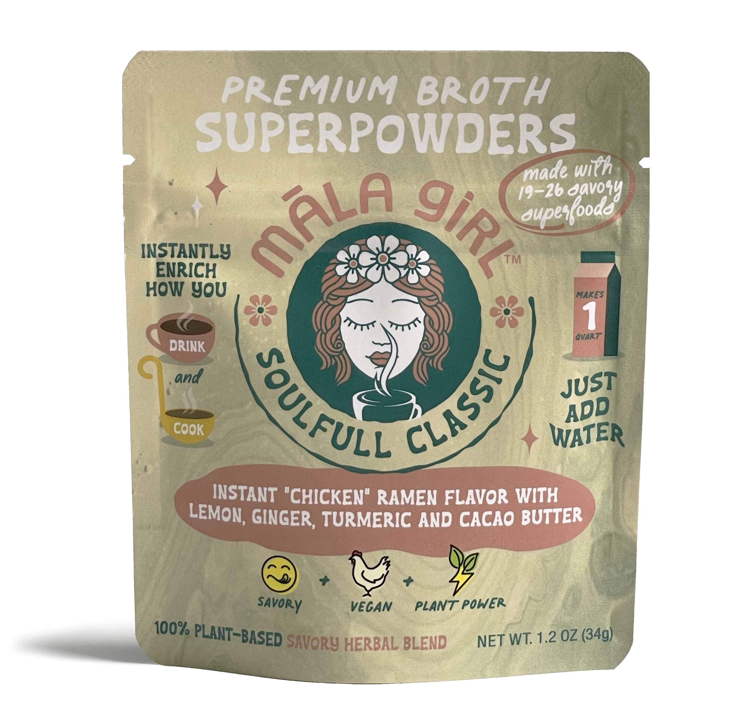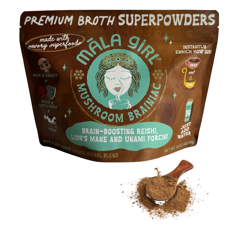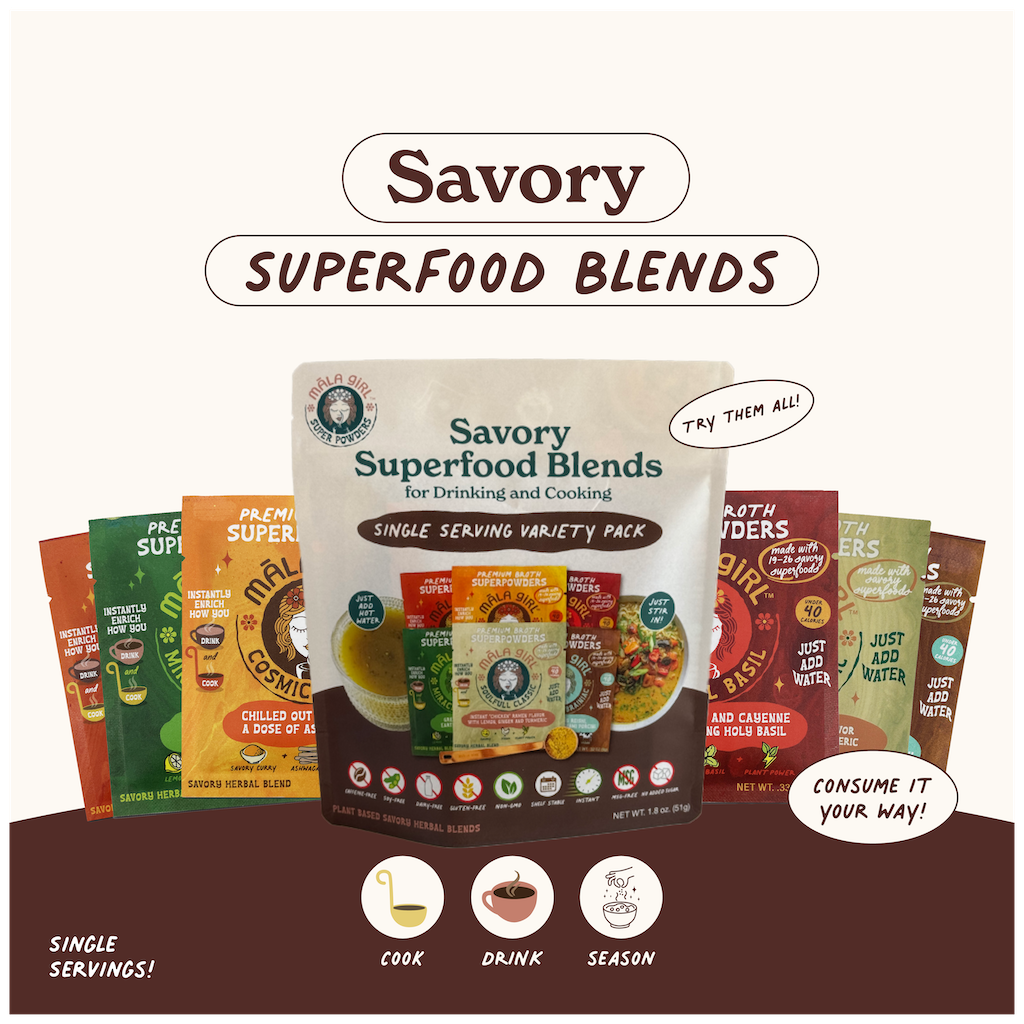 Meet māla girl, your future savory soulmate. Premium broth superpowders that bring a new approach to instant. Māla Girl connects our cravings with real ingredients our bodies deserve. Six feel good flavors of culinary personalities each with their own superpower crafted from 19-26 single origin or organic savory superfoods, nothing else. We get it plants are good for you, we're here to make it effortless, versatile and delicious along the way. Māla girl is a free spirited brand that's: -vegan -gluten free -soy free -dairy free -gmo free -corn free -artificial free When flavors are made with ingredients that are known to help promote: -sources of antioxidants -reducing inflammation -boosting overall immunity -sources of vitamins and minerals -stress blaance -reducing prep in the kitchen. māla is Hawaiian for "garden". Each flavor is so garden good, you'll want to add it to everything you eat, drink and cook. Feel good flavors simply taste better. Cheers to sipping and simmering together soon! 😘 māla girl