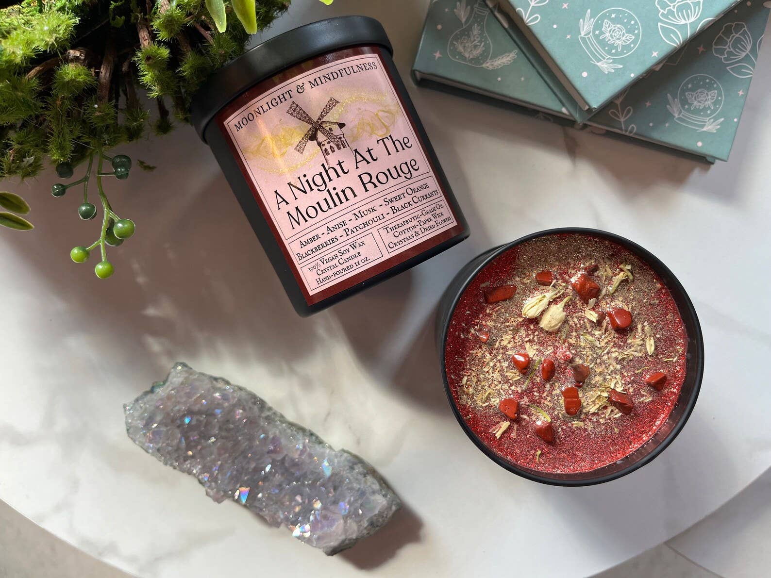 Moonlight & Mindfulness began with the intention of providing a community for those seeking guidance on their healing journey while creating non-toxic, eco-friendly products. We developed clean, vegan candles that are not only free from toxins and other harmful ingredients, but that are also safe for folks with sensitivities and allergies. We put so much love into each and every candle from start to finish. Each one is hand-poured, uniquely decorated, and made with only 100% soy wax, certified-clean therapeutic-grade oils, and a paper-cotton wick. Not only can you feel good about lighting these candles in your home, but they also feature beautiful heat-safe glitter, tumbled crystals, and dried flowers. We want everyone to feel the love and comfort from each and every product we create.