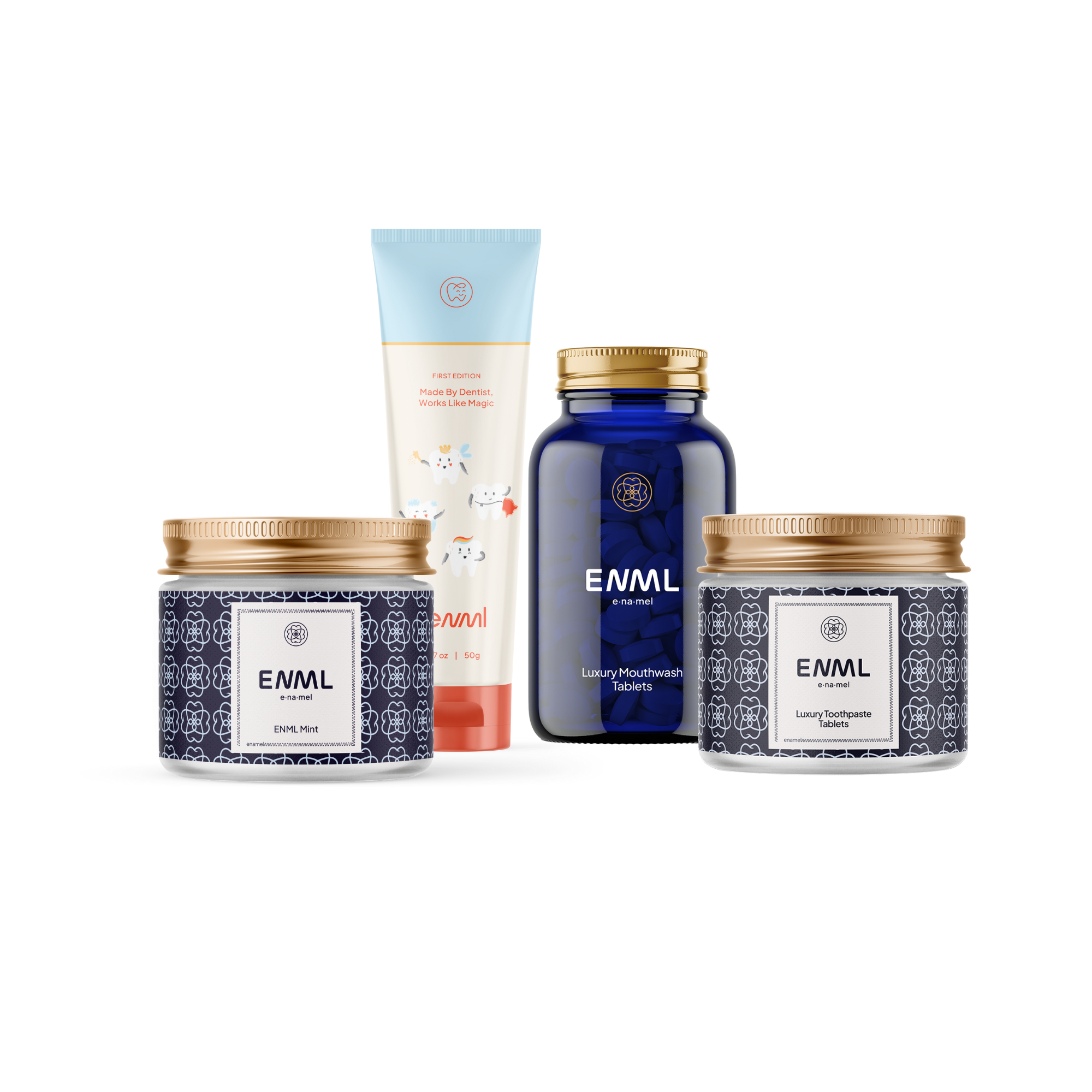 There is a better way for healthier, cleaner, whiter teeth. We launched a luxury brand of toothpaste tablets and oral wellness products called ENML (e-na-mal). Our goal is to shift the conversation around oral care from a medical necessity to a form of self-care and wellness. People's smiles are what we notice first when we meet someone, and yet, we only care for our teeth in a very medical, narrow way. Dentists take care of teeth health and chemical-laden strips take care of how they look. We want to do both in a way that keeps our teeth at their healthiest, without unnecessary chemicals and toxins. So that you don’t just look good, but you feel good in the process. Our toothpaste uses micro-Hydroxyapatite, an FDA approved compound that has been proven to be a better form of tooth remineralization than flouride. By using a compound that is already in our teeth, ENML is a natural choice for those seeking a clean, and more effective oral care routine. 100% Plastic Free & Environmentally Conscious: Our 100% recyclable packaging solution ensures that your choice for oral care aligns with your commitment to a greener planet. Plus, ENML tablets are water-free, which means it takes less fuel to transport them. Fluoride-Free and SLS-Free. Free from harsh chemicals and fluoride, ENML tablets provide a refreshing and more effective alternative to traditional toothpaste.