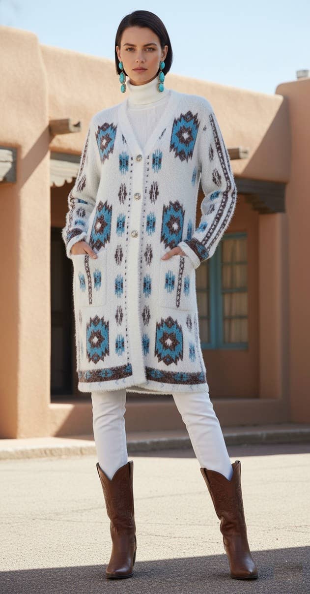 Time of the West was born from a deep admiration for the landscapes, artistry, and soul of the American Southwest. The wide deserts, adobe houses, and timeless tribal patterns tell stories of resilience, beauty, and freedom and we wanted to carry those stories into modern fashion. Inspired by this heritage, we create sweaters that honor the iconic Southwest style while reimagining it for today. Each piece blends bold geometric designs, earthy tones, and details drawn from the region’s artistry, transforming tradition into a wearable statement. Our sweaters are made from high-quality synthetic wool—crafted to be soft, warm, and durable, while staying true to our commitment to accessibility and comfort. They’re designed for those who love the romance of the West: the sunsets, the adobe walls, the spirit of adventure, and the endless horizon. Time of the West is more than clothing, it’s a connection to heritage, a celebration of artistry, and a reminder that timeless style always finds its way forward.