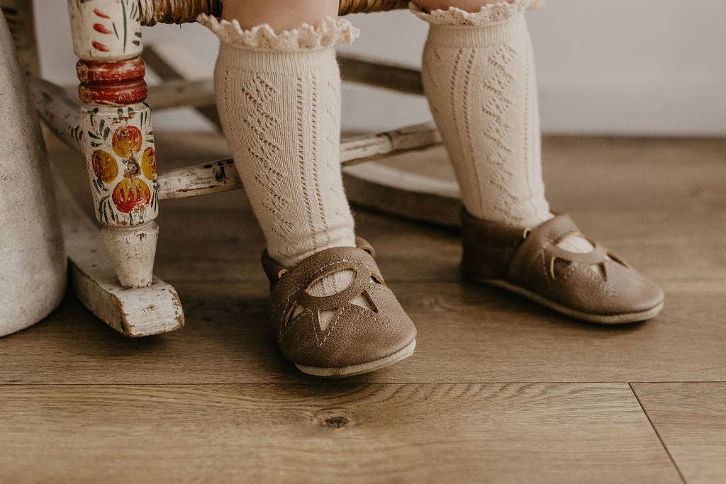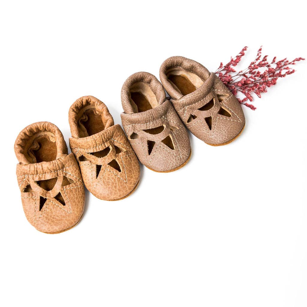 Starry Knight Design shoes are handmade in Montana USA by a team of local women with high-quality 100% leather and suede. Since 2008, We have been designing and making soft soled leather shoes for your tiny babies up to kids. Our Shoes are great for ages newborn to 4years: -Soft and non restrictive for developing feet -Soft Elastic band around ankle -Help keep socks on newborns -great for babies crawling around -perfect for balance when they start standing and walking -suede bottoms help make non slip for floors -good for house/daycare shoes for toddlers! Or with our Add on soles even outdoor shoes Starry Knight Design Shoes -- 100% high quality leather and suede -- Handmade in Montana USA