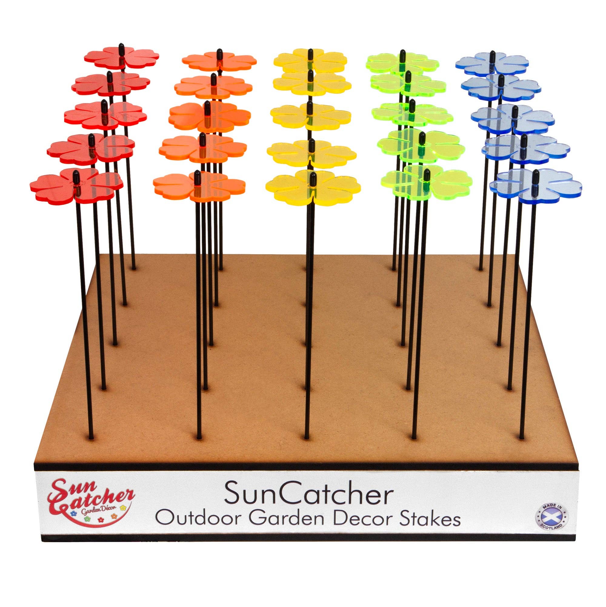 At SunCatcher we create colourful, innovative, garden decorations to bring a long lasting, vibrant glow to your outdoor or indoor space whatever the weather or the time of year. We are a family owned and run business based in Scotland, UK with a creative heart. Scotland is blessed with long daylight hours in the summer but come October to April, the daylight hours are short and nights long. Taking inspiration from our Scottish landscape, where the light is amazing and by our travels around the World, we set out to make contemporary all year round, garden products that last long, are fully recyclable and help keep our home spaces looking good while helping encourage nature. Already working with acrylic, and missing the sunshine in the winter months, we decided to develop a range of fluorescent glowing garden decorations, using a special type of acrylic that attracts and emits UV light, creating a mystical glow and powerful, vibrant reflections. These contemporary, garden decorations add colour and light to any home setting, putting a smile on people’s faces, especially on those days where the sun is hiding. Our SunCatchers not only attract light, they are also a magnet for pollinators; butterflies, bees and even, we are told, the odd hummingbird in certain parts of the World, are drawn to the glow.