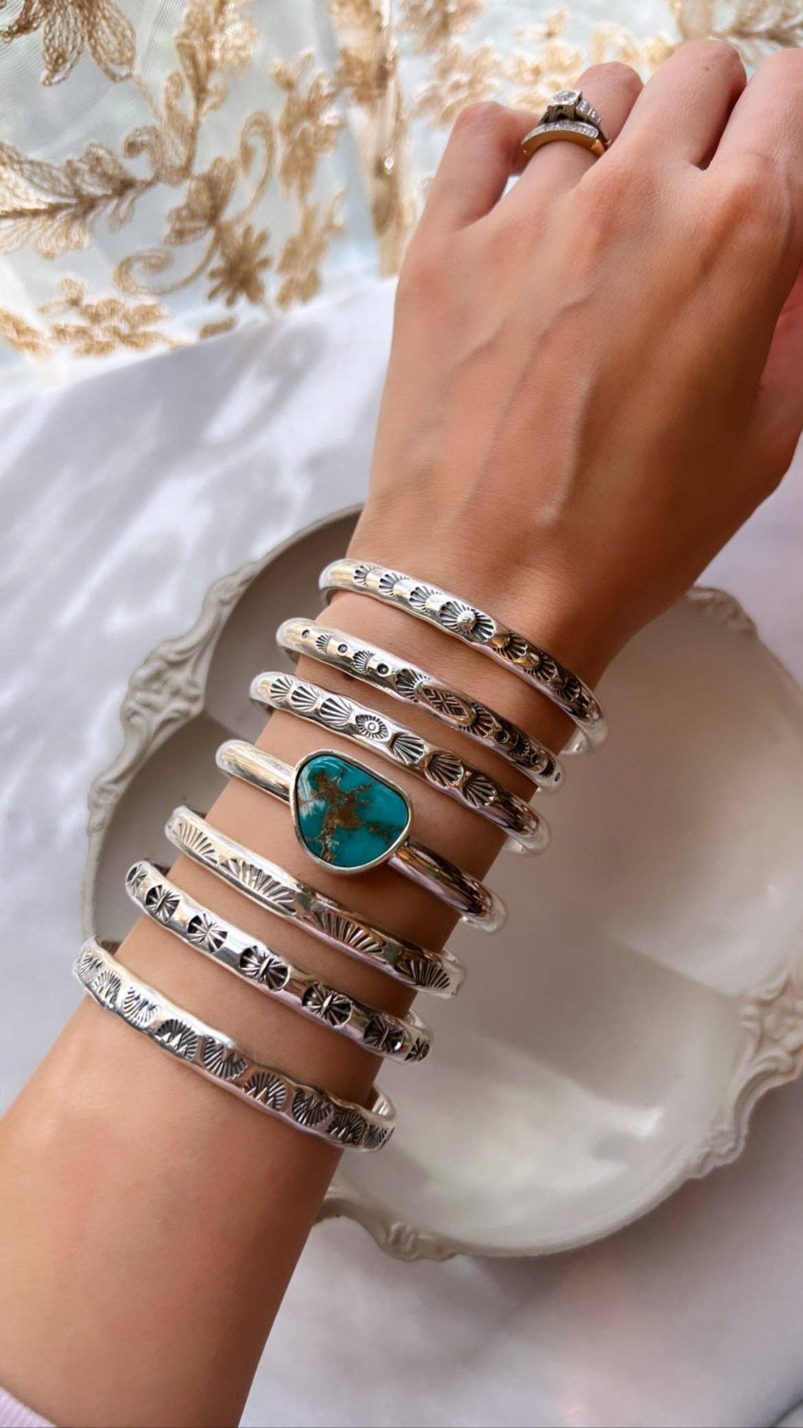 Our botanical jewelry features flowing leaves handcrafted from fine silver. Each piece is created to last lifetimes and be passed down generations. Collecting jewelry as talismans to protect, heal or commemorate is an ancient practice. Our jewelry is not simply an adornment, each piece acts as a spiritual guide to help you find your way through difficult times. Our jewelry is worn to harness love, luck and self empowerment. Every piece of Artemis + Aura jewelry is created by hand, using traditional techniques and handmade Navajo stamps. Our stones are sourced from small businesses and family owned mines. Our jewelry supports other small makers and family owned businesses.