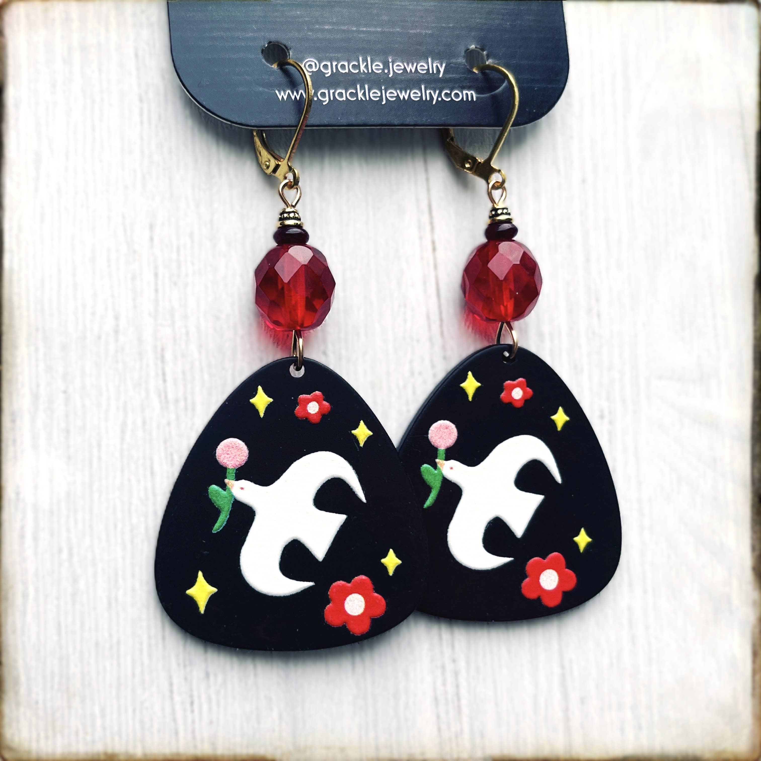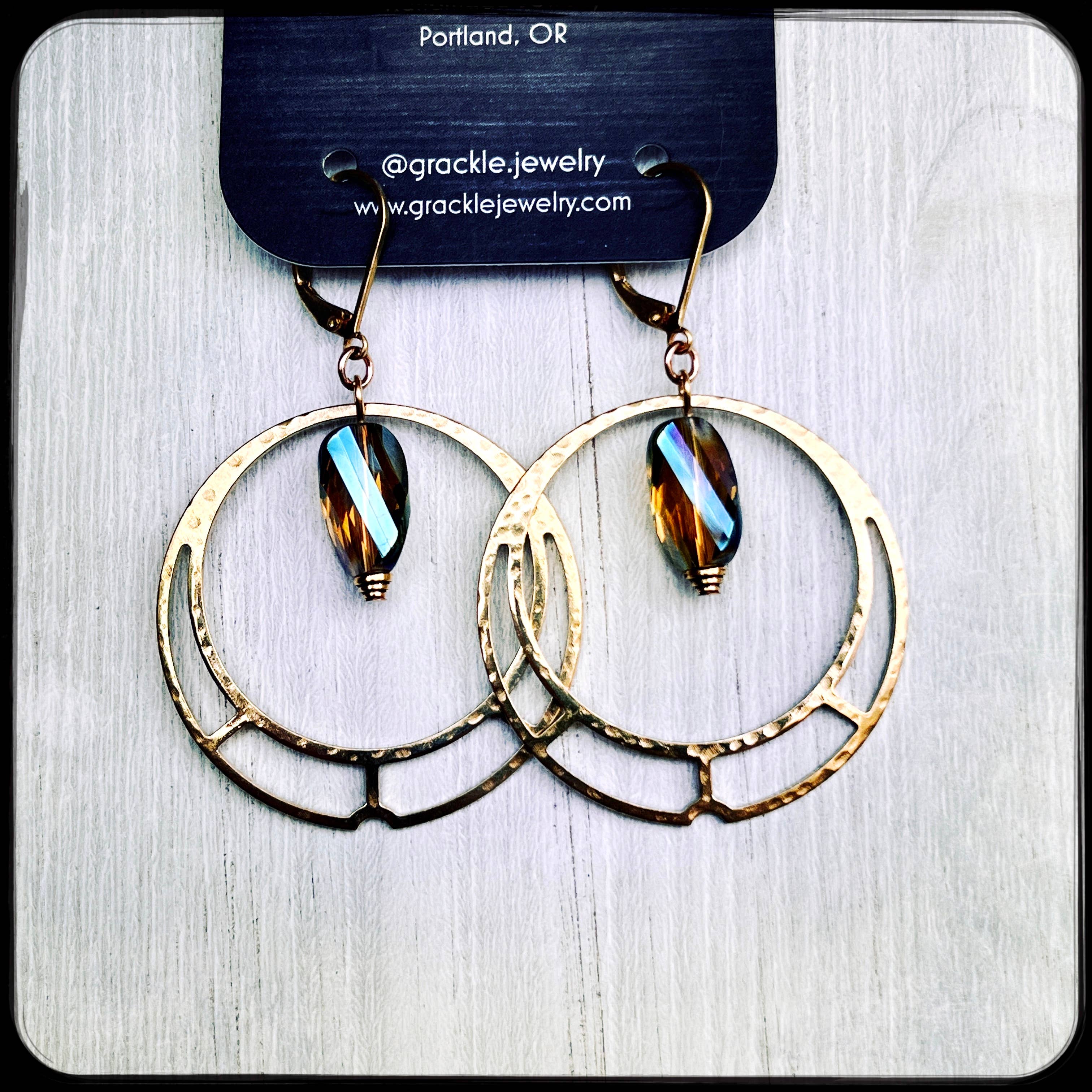 Grackle Jewelry offers modern handmade earrings with a focus on fresh designs and accessibility. • Earrings are made with high quality yet affordable materials such as brass, stainless steel, upcycled leather, glass and crystal beads, non-petroleum cellulose acetate, and colorful acrylic resin. • Earring hooks are always brass with leverback closures which make them nickel and lead safe and also help keep them from falling out or getting tangled. • Because earrings are made in small batches, available inventory is kept small and can fluctuate. Please reach out if you're interested in higher quantities or sold out styles! • This Portland, Oregon brand is founded and run by Natalie Divine who is a lifelong jewelry maker, artist, and crafter as well as a single mom and nature enthusiast. • Look for us on Instagram at @grackle.jewelry!