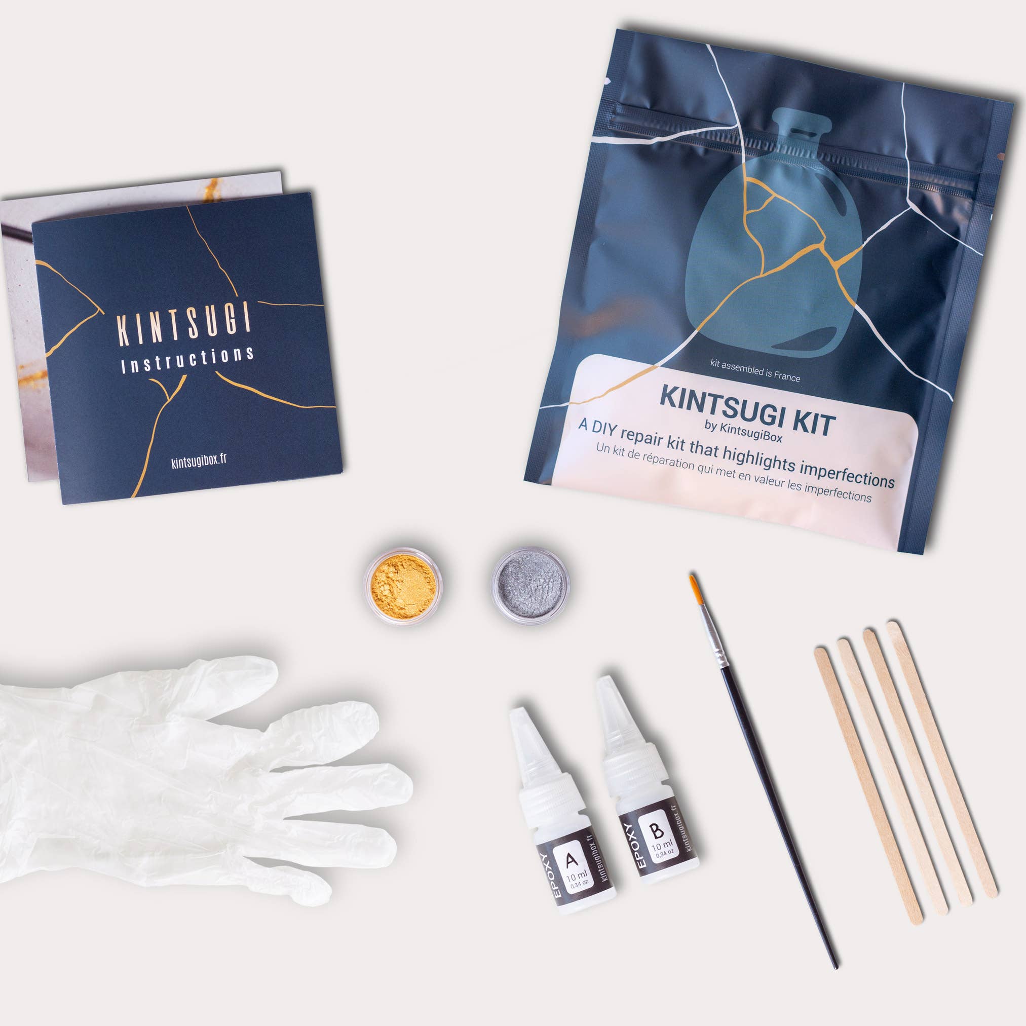 Kintsugi Box er et ungt fransk mærke, der skaber Kintsugi reparationssæt samlet i Frankrig. Vores ønske er at give alle mulighed for at øve denne forfædres japanske kunst derhjemme. Hvad kunne være ædelere end at genoplive ved at fremhæve fejlene i dagligdags genstande beskadiget ved et uheld? Det er vigtigt for os at bidrage på vores niveau til at give objekter et andet liv i stedet for at smide dem væk. På et tidspunkt, hvor DIY er inviteret ind i hjem og økologisk bevidsthed er kernen i vores tanker, ved vi, at Kintsugi Box giver alle mulighed for at handle positivt for planeten og samtidig have det sjovt.