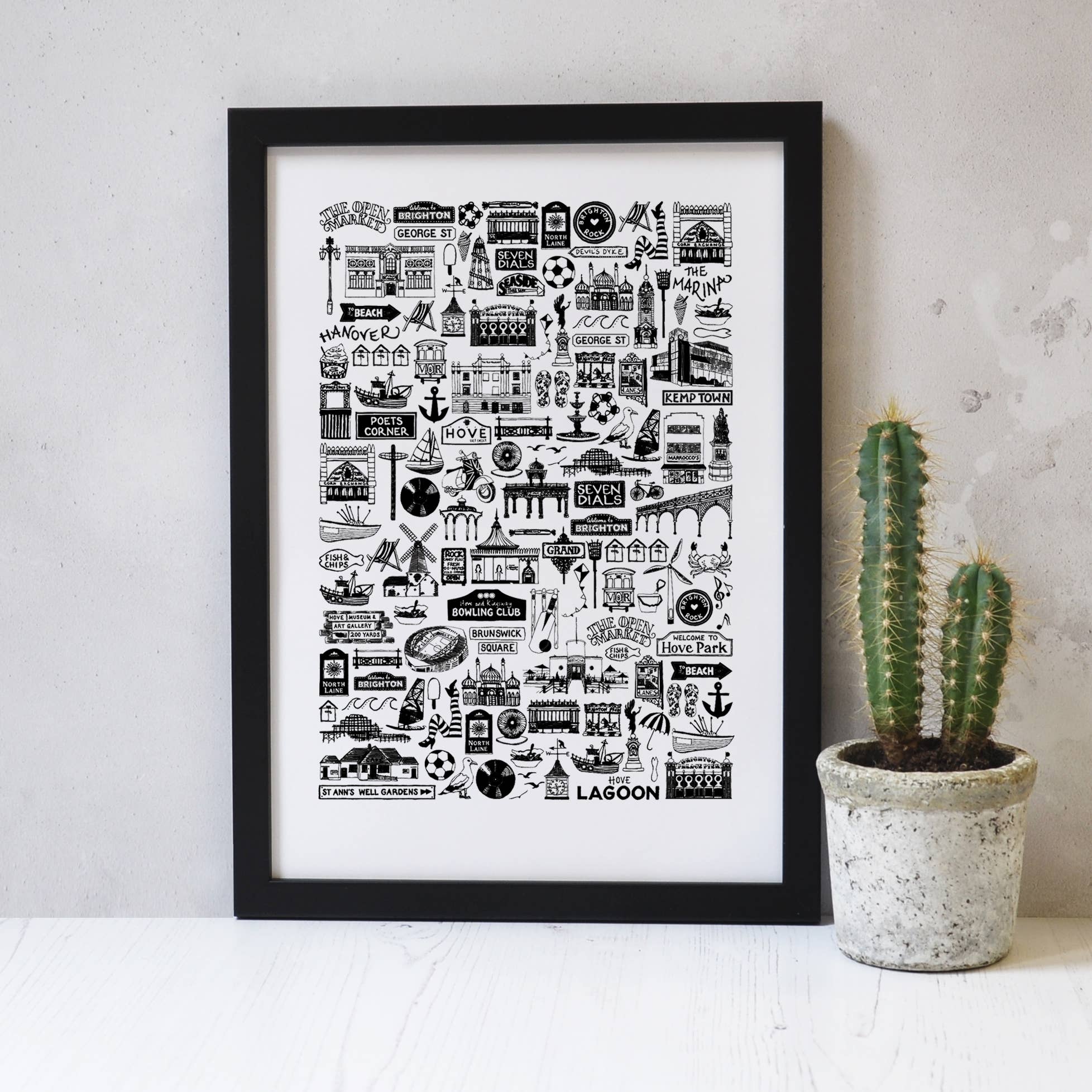 Martha arbejder fra en konverteret mews studie i hjertet af Brighton, hvor hun trækker utroligt detaljerede fine-line billeder af berømte ikoner, steder, fødevarer, sportsaktiviteter osv med en 0,005 pen! Og disse miniaturetegninger anvendes derefter på fint benkina, tekstiler, papir og andre materialer, der skaber et unikt udvalg af sort/hvid merchandise. Byområder inkluderer Brighton, London, og Liverpool plus britiske og skotske temaprodukter. Der er også designs ved hjælp af mademballage og kiks samt sport og tidsfordriv, som er virkelig populære på manchetknapperne. Produktsortimentet er omfattende, fra fine benporcelæn krus og kander og 100% bomuld te-håndklæder og forklæder, til manchetknapper, badges, prints og papirvarer. Særligt usædvanlige produkter er fliserammerne på 9 eller 16 individuelle små fliser, der skildrer individuelle tegninger af byscener og ikoner. Og Marthas unikke stil og evne til at tegne næsten alt, har ført til en enorm stigning i den personlige merchandise, især fliserammerne, der viser sig at være meget populære til de"noughty“ fødselsdage, Bryllupper og fødselsmeddelelser.
