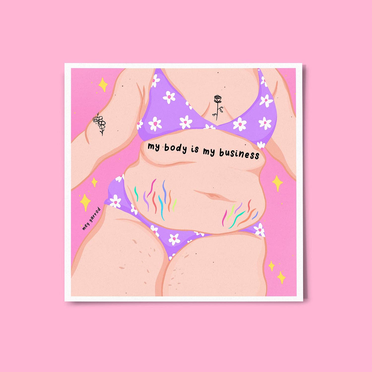 Hej! 💞🌈✨ Jeg er Meg, jeg er 26 år og jeg er en Self-Love Illustrator fra Lincolnshire. Jeg har elsket kunst, så længe jeg kan huske, og finder det en fantastisk måde at udtrykke mine følelser på og sprede vigtige budskaber. Jeg startede min lille virksomhed i 2018 med en mission om at sprede kropspositivitet og vise folk, hvor smukke de er. Det er stadig kun et enkvindeteam her hos Meg Garrod Art! 🌷 Alt er designet, pakket og sendt af mig fra mit lyserøde kunststudie! Jeg elsker at skabe kunstværker og produkter, der opmuntrer dig til at elske dig selv og omfavne din krop 💖