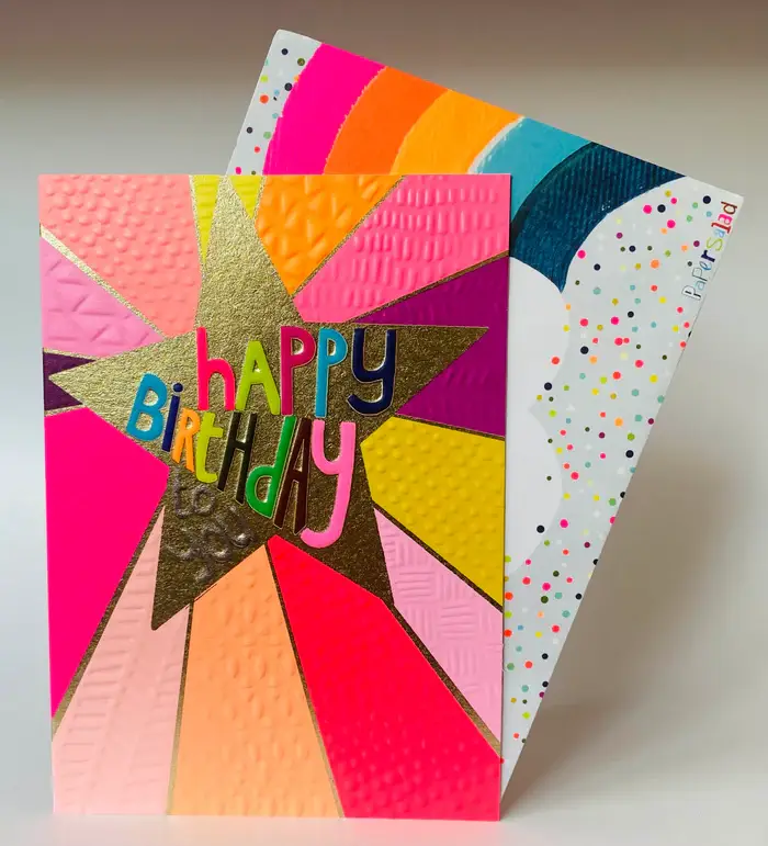 Hej og velkommen til Paper Salad! Her hos PS HQ er vi passionerede omkring vores dristige, lyse neon- og teksturerede lykønskningskort. Vær advaret, du kan få brug for dine solbriller, når du bladrer gennem vores side! Vores virksomhed blev etableret i 2005, og her er vi 20 år senere! Vi er vokset enormt, og vi eksporterer nu til over 16 lande. I 2015 vandt vi vores første Henrie Award nogensinde for bedste børnesortiment! Siden da er vi stolte af at kunne sige, at vi fortsat har vundet priser for forskellige sortimenter. Alle vores designs er håndmalede - ved hjælp af maling, blyanter og fundne papirer, som derefter kreativt sættes sammen for at skabe vores finurlige kort i vores studie i Cheshire, England. Vores kort trykkes derefter af specialiserede trykkerier på FSC-papir, lige her i Storbritannien. Det er dog ikke kun vores kort, der er så gennemtænkt designet... da vi elsker alt neon, designer vi skræddersyede neonkuverter for at komplementere hvert af vores designs.