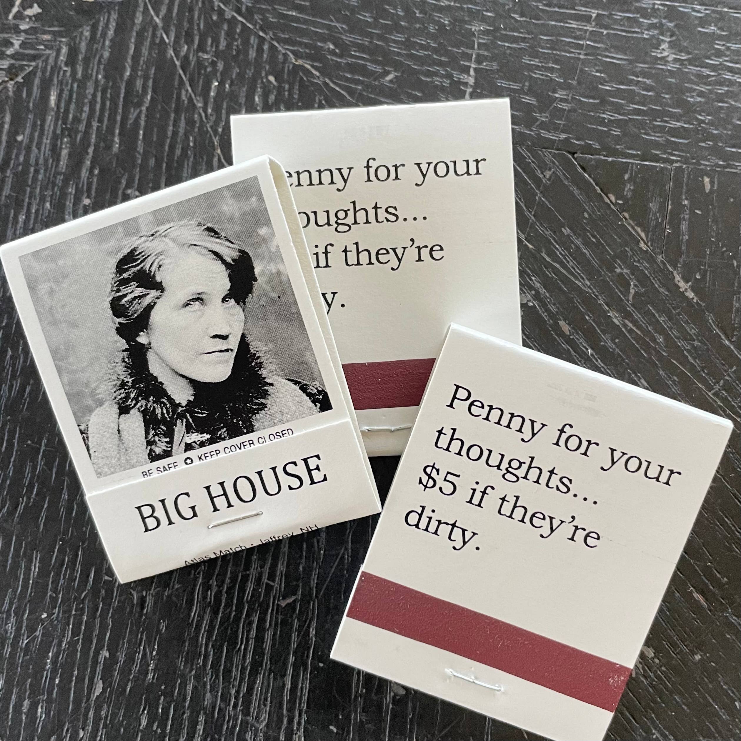 Snarky, fræk og lidt bad ass. Ja, der er virkelig 3 søstre (logo venligst udlånt af bedstefar, Lapeer MI, cirka 1971). Storesøster Martha bringer sin overaktive fantasi til live ved at skabe snarky ting. Vintage-stil motelnøgleringe trykkes internt med popkultur, tv-inspirationer og snarky og frække 'virksomheder'. Efter at have opdaget et lager af vintage mugshots, lancerede Martha sin nye BIG HOUSE-linje af stearinlys, klistermærker, sæber, lotions, lykønskningskort, klistermærker, tændstikker, postkort, pudebetræk, viskestykker og luftfriskere! Vintage mugshots kombineres med fræk kommentar og præsenteres alle på håndlavede, små produktionspartier fremstillet i USA.