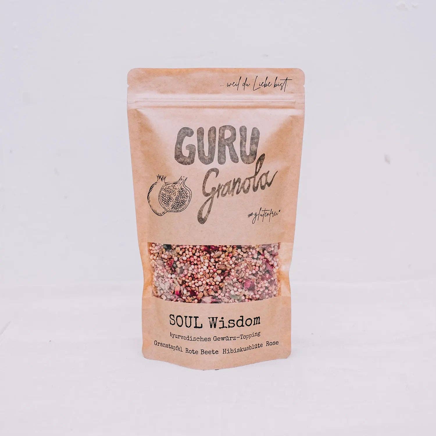 „Guru“ betyder noget som „fra skygge til lys“ og bruges også som et synonym for livslærer. Jeg er overbevist om, at den sandeste lærer, den sandeste budbringer af lys, allerede er i dig, i os alle. Med hver ske, GURU Granola kan minde dig om al din visdom og kærligheden i dig. Et sprødt krydderi perfekt, kombineret på en ny måde i henhold til ayurvedisk filosofi og japanske ernæringsprincipper, hvilket gør alle dine retter til mesterværker. Saltet, salt, frugtagtig tærte, aromatisk-sød, trøstende umami, en holistisk smagseksplosion, der forviser dine trang for evigt. GURU Granola Fordi du er kærlighed!