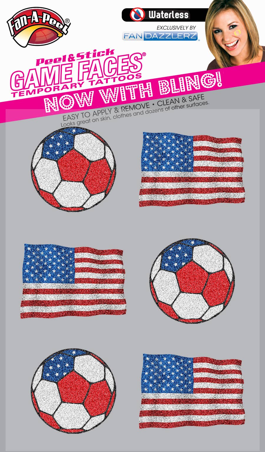 Fan-A-Peel/Gamefaces har længe været en hæfteklammer i sportsverdenen. Først introduceret over 25 år siden som en vand anvendt tatovering i kollegiale sportsgrene har nu udviklet sig til en mode statement for fans, cheerleaders og spillere. Vores produkter har omfavnet modetrends samt impulskøb og øjeblikkelig brug ved at indføre flere år siden en tatovering, der kan bruges uden vand og bruges på de fleste overflader. Som opfinder og patentindehaver til peeling & stick midlertidige tatoveringer har vi revolutioneret markedet og gjort det lettere for alle at bære og fjerne deres „GameFace“ efter ønske. Vi udnytter de sikreste 3M Medicinske klæbemidler i vores produkter og har udvidet vores linjer til at omfatte metallisk og glitter. En spildag går ikke uden at se vores produkter på tv, print og på tribunerne. Ud over vores mantra for sikkerhed og konvention har vi omfavnet bæredygtighed ved kun at bruge genbrugsmaterialer i vores emballage. Alt, hvad vi ønsker, er for dig at have det sjovt og „sætte din gameface på“!!