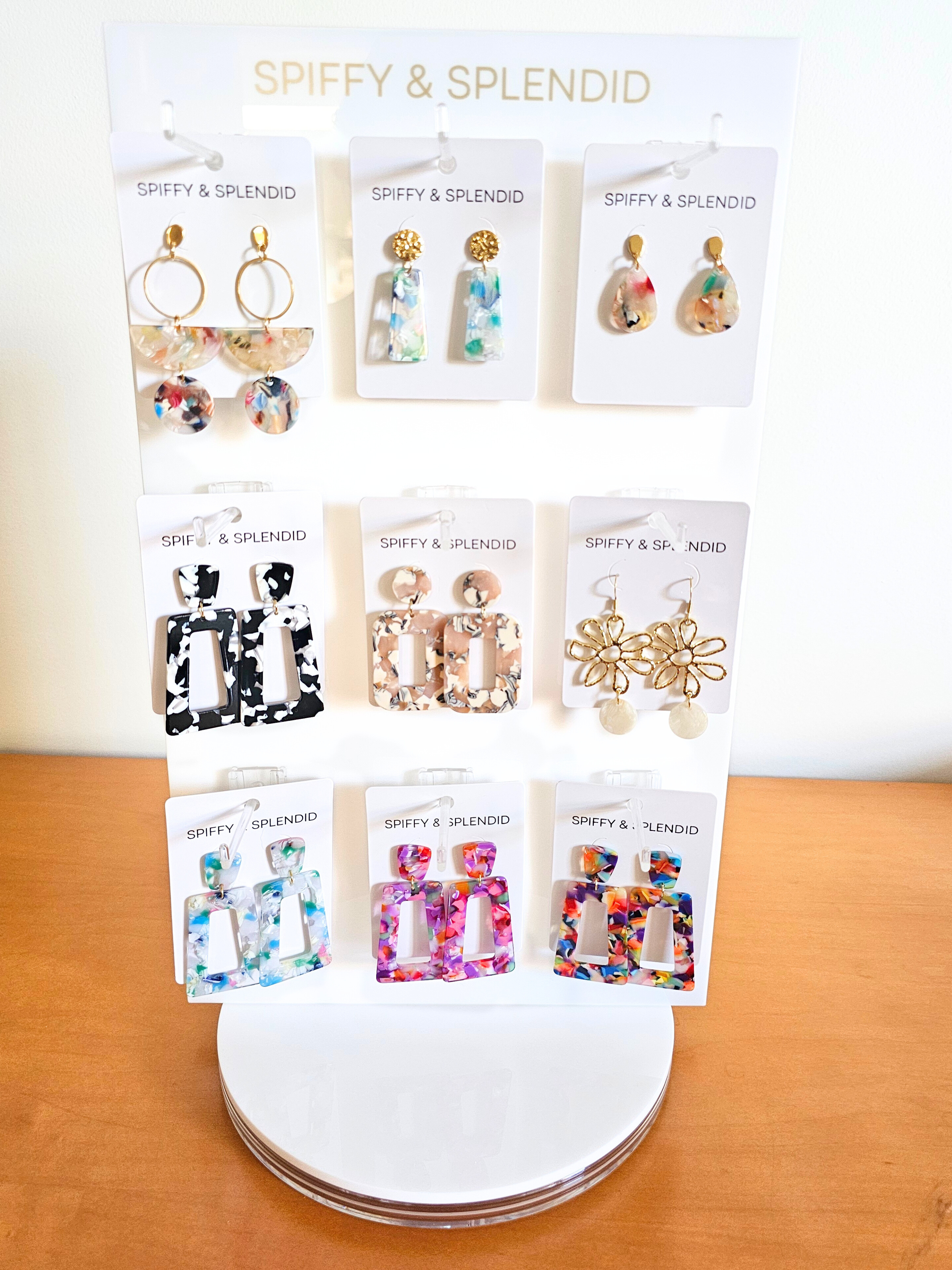 *Ordrer sendes næste hverdag! * Spiffy & Splendid er et kvindeejet smykkefirma beliggende i Fishers, Indiana. Vi er familiedrevet af et mand-og-kone-team sammen med et team af lokale kvinder, der håndfremstiller vores smykker. Vores mission er at skabe glædefyldte smykker, der er unikke, af høj kvalitet, og alt sammen til en god pris. Vi er specialiserede i sjove og trendy stilarter for at få enhver kvinde til at føle sig pigg og pragtfuld! Spiffy: moderigtigt, stilfuldt og trendy Pragtfuld: fabelagtig, vidunderlig & smuk Vi har brugt utallig tid på at perfektionere vores produkter. Derfor finder du kvalitetsforgyldte rustfrie stålmaterialer til vores stolper, kroge og halskædekæder og holdbare akryl til vores unikke designs. Vi hører fortsat fra vores kunder, hvor meget de elsker vores produkter til deres følsomme ører. Kreativitet er vores passion, så vi er altid forpligtet til at bringe dig friske stilarter.
