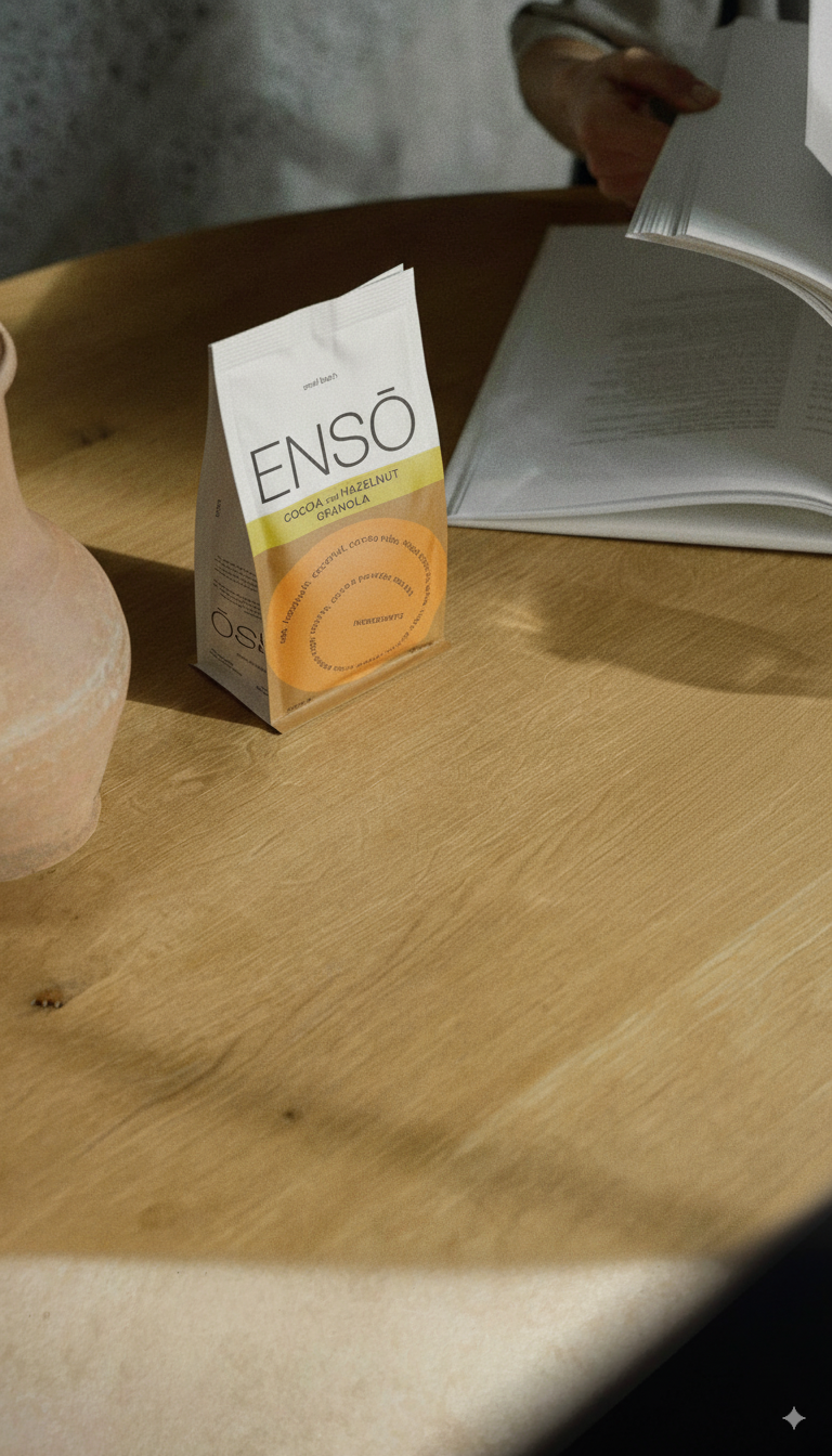 ENSŌ (円相) er inspireret af japansk buddhisme og fejrer jagten på kvalitet og selvforbedring i nuet. Vi fokuserer på renheden af ingredienser og smag. Hver af vores granolaer bages langsomt ved lav temperatur med ekstra jomfruolivenolie og ahornsirup, hvilket skaber en let, sprød tekstur og unik karakter på tværs af vores tre smagsvarianter. I modsætning hertil mangler mange kommercielle granolaer den ideelle sprødhed, smager alt for tørre eller indeholder for meget sukker og skjulte tilsætningsstoffer. Med vores kulinariske ekspertise har vi skabt en granola, der er enkel, ren og lækker—som noget en ven ville lave, bare bedre.