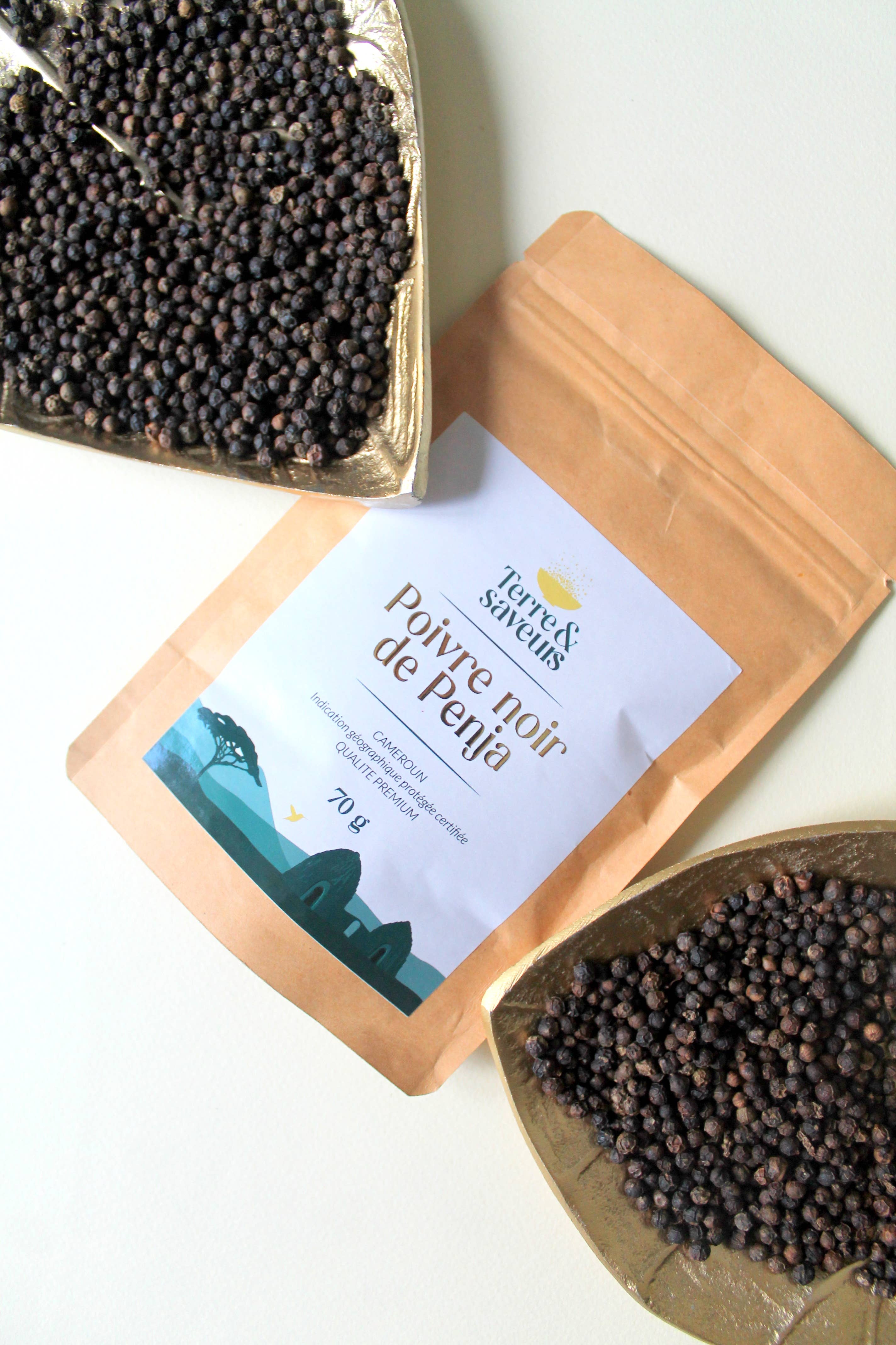 Terre et Saveurs importe des produits de qualité des terres d'Afrique, notamment le Poivre de Penja. Mais qu'est ce que le poivre de Penja? Tout d'abord, c'est l'un des poivres les plus réputés du monde grâce à sa puissance et sa complexité aromatique qui donne une saveur excellente à tout type de préparation. Le poivre de Penja est un poivre de la famille Piper nigrum, il est cultivé dans la terre naturellement riche et volcanique de la commune de Penja beliggende i la région du littoral du Cameroun en Afrique centrale. Il pousse dans les terres volcaniques de la vallée de Penja et dégage des arômes frais de menthol et de camphre, avec des notes herbacées et fumées. Le poivre de Penja vous permettra de sublimer vos recettes et sera source d'inspiration culinaire, en effet ce poivre de grande qualité est un exhausteur naturel de goût car 3 fois plus puissant en arôme qu'un poivre classique avec un pikant doux. Il est apprécié par les fins gourmeter et les kokke pour son goût ainsi que sa finesse, ce qui permet au poivre de Penja d'être élevé au rang des meilleurs poivre du monde. Il fera voyager vos papilles dans la cuisine savoureuse à souhait des contrées camerounaises. De plus, riche en oligoéléments et minéraux dû au fait qu'il pousse naturellement dans une terre volcanique, il est doté de multipla vertus pour la santé du foie et la micro cirkulation sanguine. Depuis la reconnaissance en tant que produit de terroir, la culture de cette épice est normée et protégée