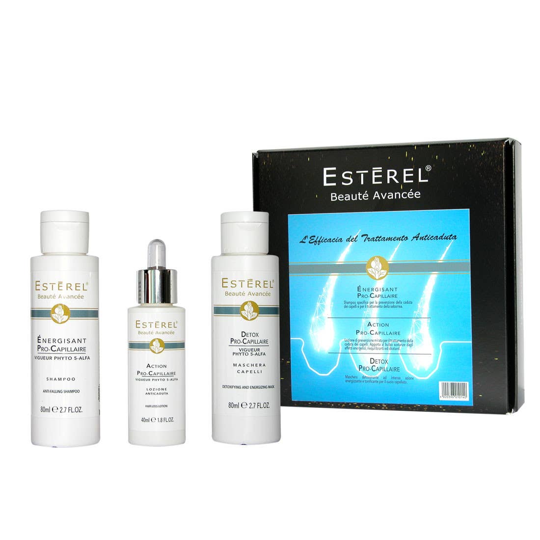 ESTĒREL er mærket fra Mario Zunino Labs dedikeret til højtydende kosmetiklinjer til hudpleje og hårpleje. Innovation og ekspertise mødes i originale og forførende formler designet til den daglige skønhedsrutine og til det effektive svar på de specifikke skønhedsbehov for ansigt, krop, hår og hovedbund. Blandingen af udvalgte naturlige aktive principper er udtrykket for Estérels vision, styret af respekt for miljøet og brugeren, og ved skabelsen af altid innovative og fantastiske skønhedsbehandlinger for strålende hud og forførende hår. Fremstillet i Italien - UNI EN ISO 9001, 14001, 22716 certificeret