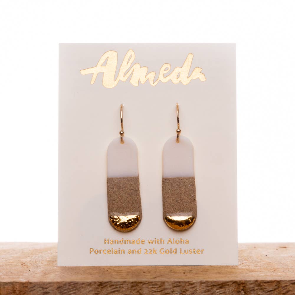 Aloha! Vi er glade for, at du er her. Vi er Jon og Heather Almeda, en mand og kone kreativt team. Sammen dannede vi Almeda Jewelry i 2018 i vores Kaneohe, Hawaii studie. Ud over vores smykker arbejde; Jon er pottemager, der har specialiseret sig i lille skala arbejde @almedapottery. Heather er en maler, der nyder at spille med dristige streger og farve blokering @heatheralmeda. Vores smykkesamarbejde er født af vores fælles kærlighed til Hawaii, og hver serie er inspireret af vores foretrukne strande, synspunkter, flora og fauna. I vores bærbare kunst vil du se glimt af klart turkis vand, pulver sandstrande, og skæringspunkterne mellem land og hav. Lavet af porcelæn eller en blanding af porcelæn og stentøj ler. Vi afslutter hvert stykke med et strejf af 22k guld glans for perfekt mængde gnistre. Alle komponenter er premium 14 k guld fyld. Alle stykker er alle håndlavede af os.