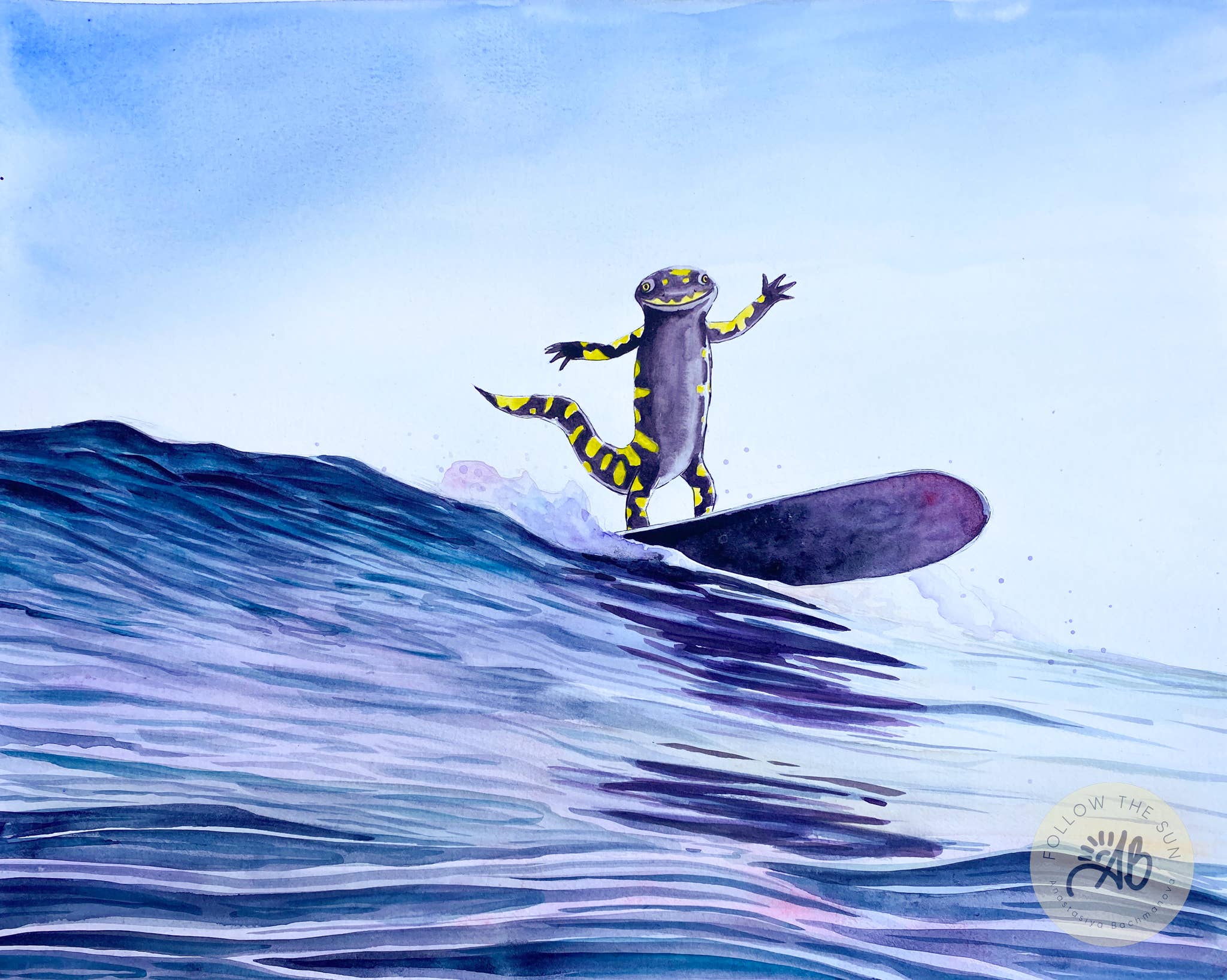 Min passion er at opleve naturen gennem surfing, klatring, vandreture og andre eventyr, og min inspiration kommer fra øjeblikke af forbindelse til mine omgivelser - livet, farverne, energien. Jeg oversætter disse øjeblikke til malerier, der er tro mod deres motiver, men forstærket med et udtryk for min personlighed - ved hjælp af klare farver og flydende linjer. Efterhånden som de skrider frem, udvikler malerierne sig med intuitive og bevidste penselstrøg. Jeg tror på, at naturen har evnen til at lære os mange livslektioner, hvis vi tillader det. Havene, klipperne og træerne er symbolske, og de dyr, vi deler verden med, ligner os meget. Det tomme lærred er et værktøj til at dele mine tanker og meninger om, hvad der er vigtigt, hvad der er værd at beskytte, og hvad der er så magisk ved et bestemt øjeblik eller sted.