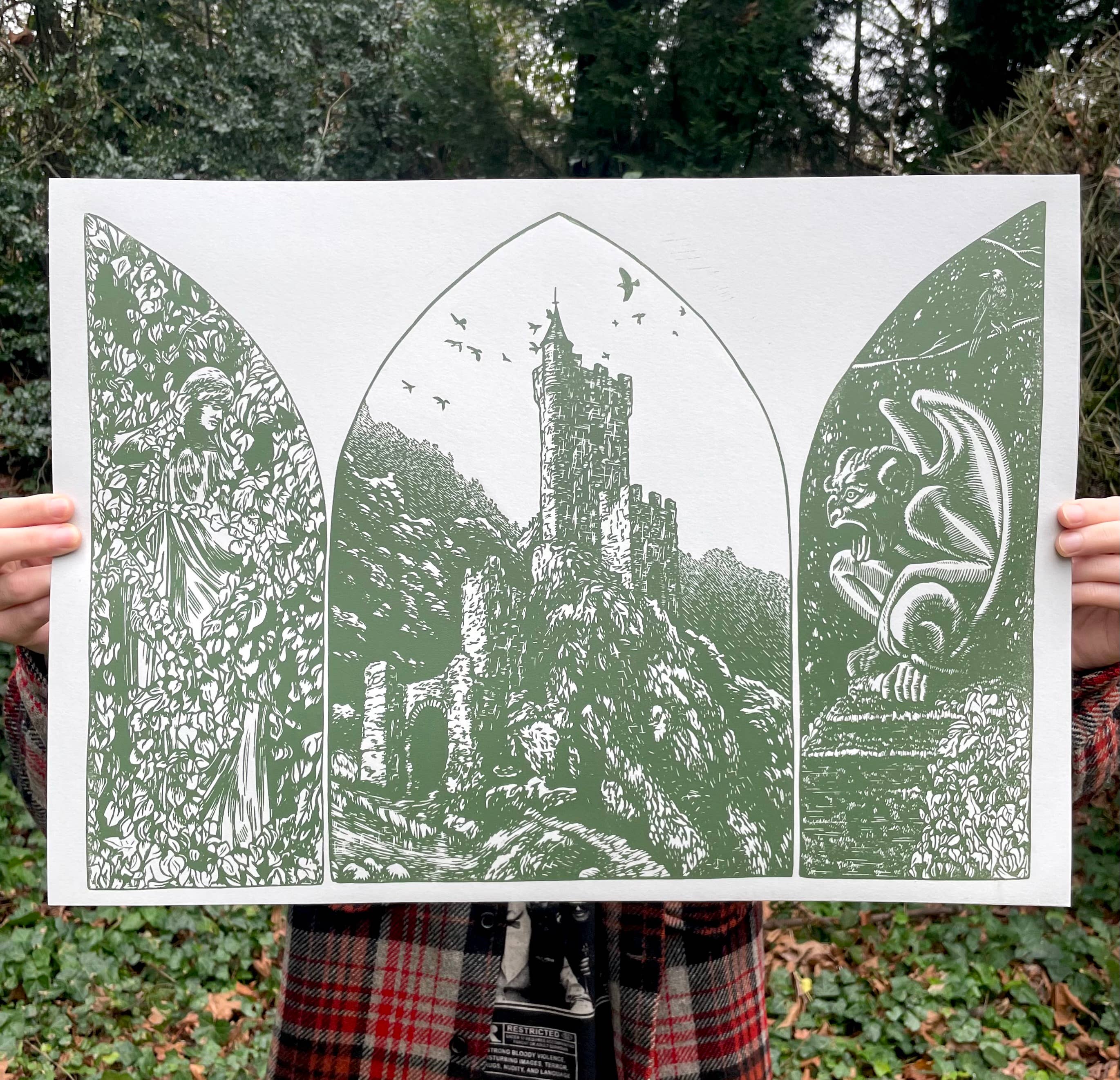 Jeg hedder Faith, og jeg startede min trykkerivirksomhed kaldet Augury Press i 2017. Jeg specialiserer mig i linoleumstryk, og mine designs leger med fjollethed, det fantastiske og nogle gange popkultur. Mine tryk varierer i størrelse fra ganske små til meget store, perfekte til at dekorere ethvert hjem, eller endda bare et rum. Jeg sælger også en række produkter ud over tryk, herunder skjorter, klistermærker, pins, tasker, magneter og mere! De fleste af de tryk, jeg laver, kaldes linoleumstryk. Et linoleumstryk er en form for højtryk, hvor et design håndskæres i en linoleumsblok, der derefter indfarves med en valse for at producere et billede. Der er mange grunde til, at jeg forelskede mig i denne metode til trykning, men en af de vigtigste er det fysiske aftryk, som min hånd efterlader på hvert tryk. Ingen to tryk er ens, hvad enten det er registreringen af to lag, der er en smule skæve, eller der er noget "støj" eller "snak" på et tryk (dette er, når stykker af den skårne blok uden for billedet også bliver indfarvet og trykt). Hvis jeg ønskede, at mit arbejde skulle ligne perfekte serigrafitryk, ville det være min foretrukne metode. Hvis denne type arbejde ikke er noget for dig, bedes du venligst tage din forretning et andet sted hen! Jeg er en enkvindesforestilling, og jeg laver alle mine egne tryk internt, så mine ordrer tager lidt længere tid end et større mærke. Vær venligst opmærksom på dette, før du køber, tak!