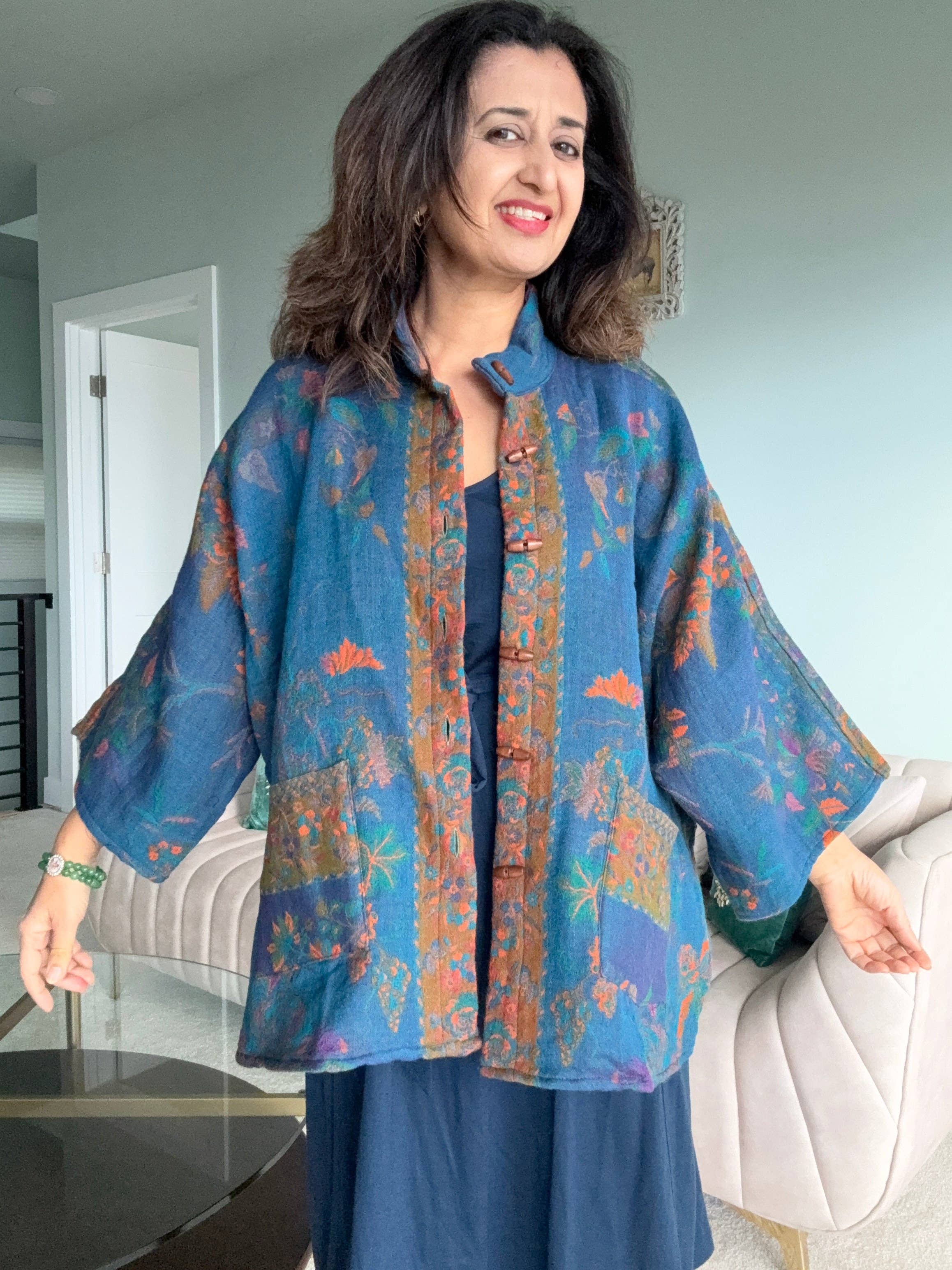 Mit navn er Megha Malhotra og jeg er designer og kurator for Boiled Wool, som har været højdepunktet i vores kollektion. Min rejse startede, da jeg flyttede til Seattle i 2000, jeg er en person, der har stor beundring for kunst og mode, efter at have flyttet fra Indien ville jeg bære Pashmina sjaler hele tiden og ville få lokalbefolkningen til at stoppe og beundre mine sjaler. Den gang i Seattle var der ikke lys farve uld tilgængelig, og jeg havde mange anmodninger om at sælge det, jeg havde på, dette inspirerede mig til at sælge pashminas. Efter at have solgt få pashminaer stod jeg over for en masse konkurrence fra andre leverandører og indså, at for at få succes i tørklædebranchen, skulle jeg oprette en linje, der har unikke interne designs, så In Style blev født, jeg stødte på Boiled Wool og elskede dets tekstur, glans og kvalitet, det er et stof, der findes i Australien, processen med at koge ulden involverer at væve ulden og derefter koge den i varmt vand for at gøre den blød, vandtæt, ikke-kløende, let, varm og behagelig.