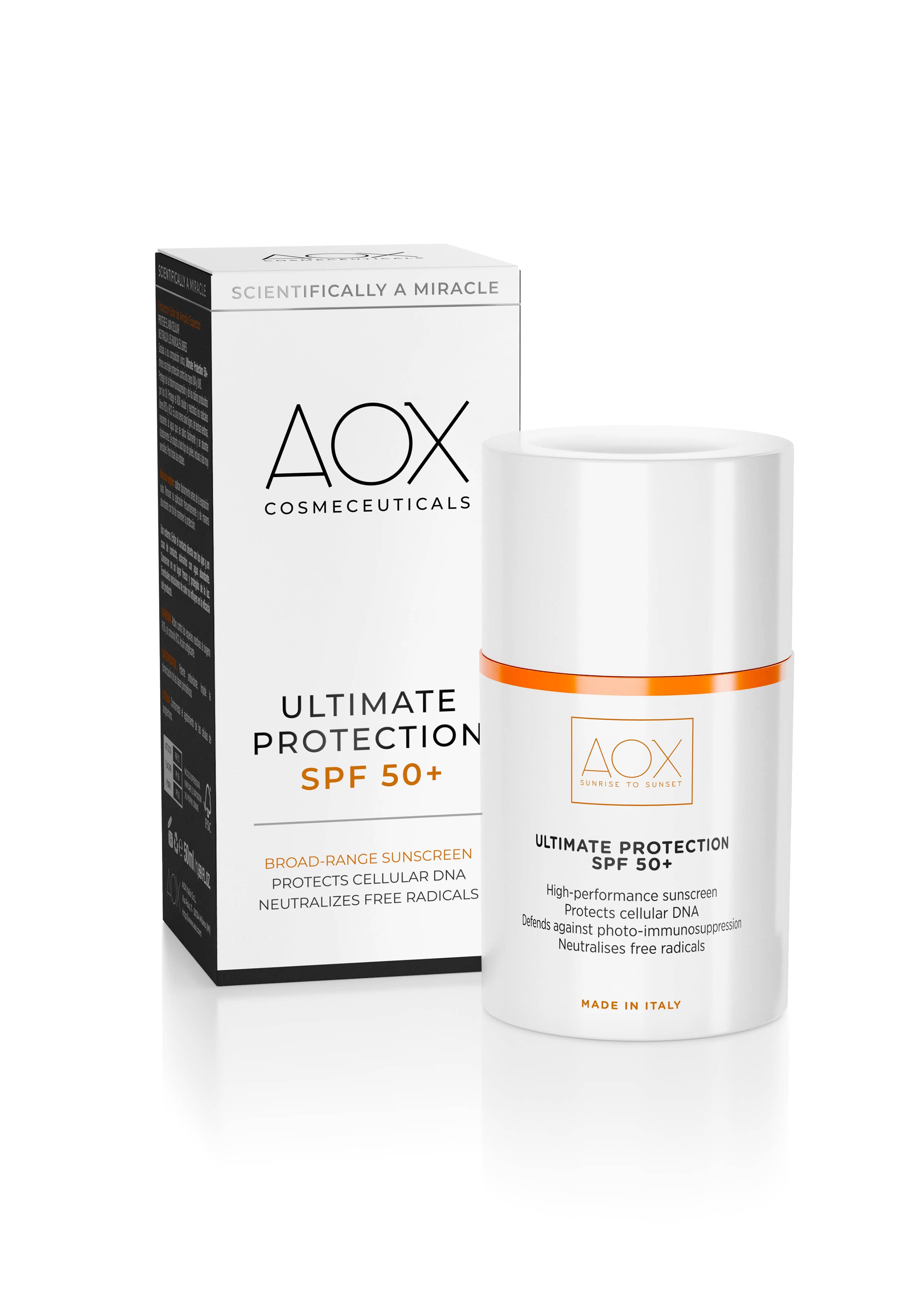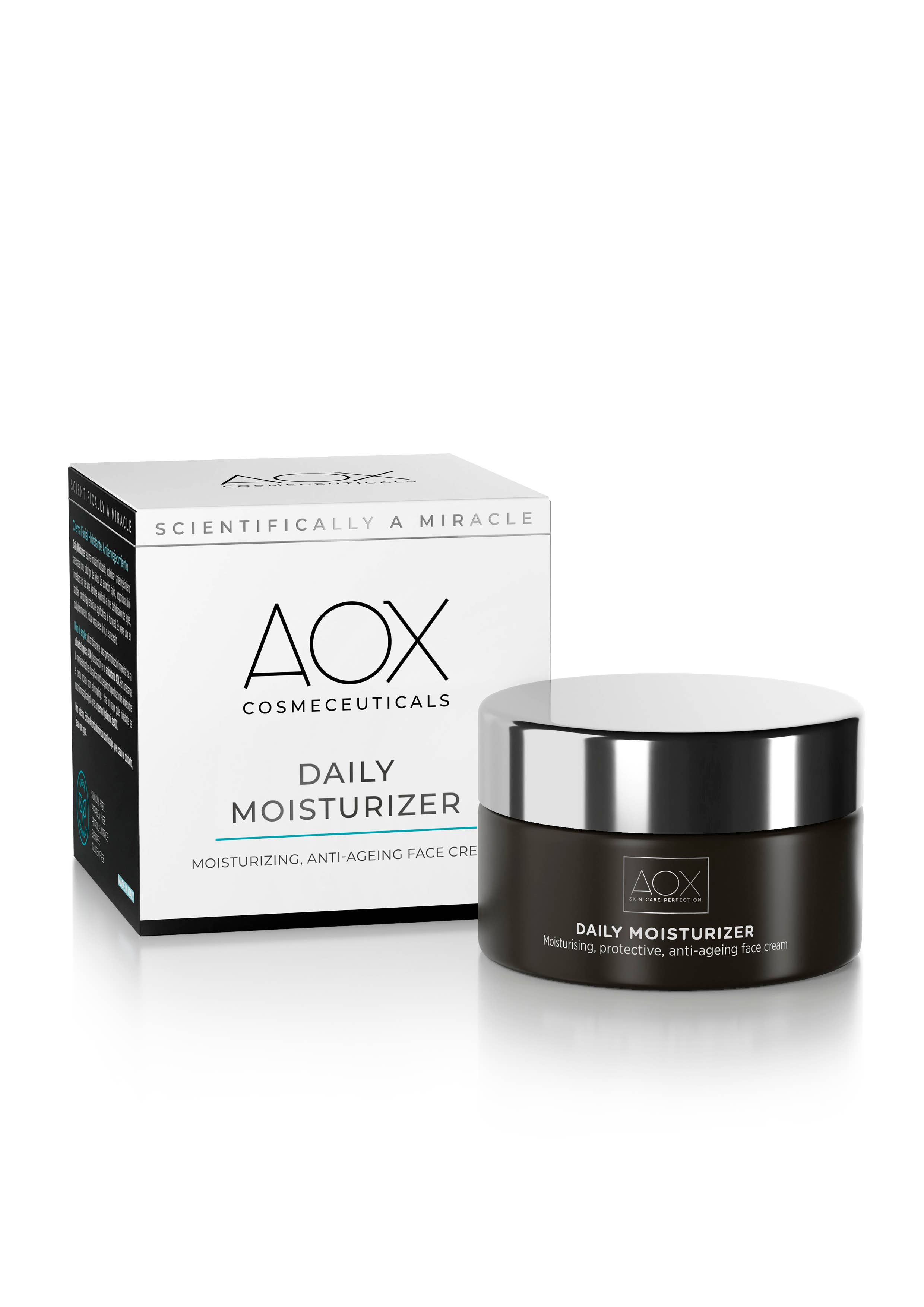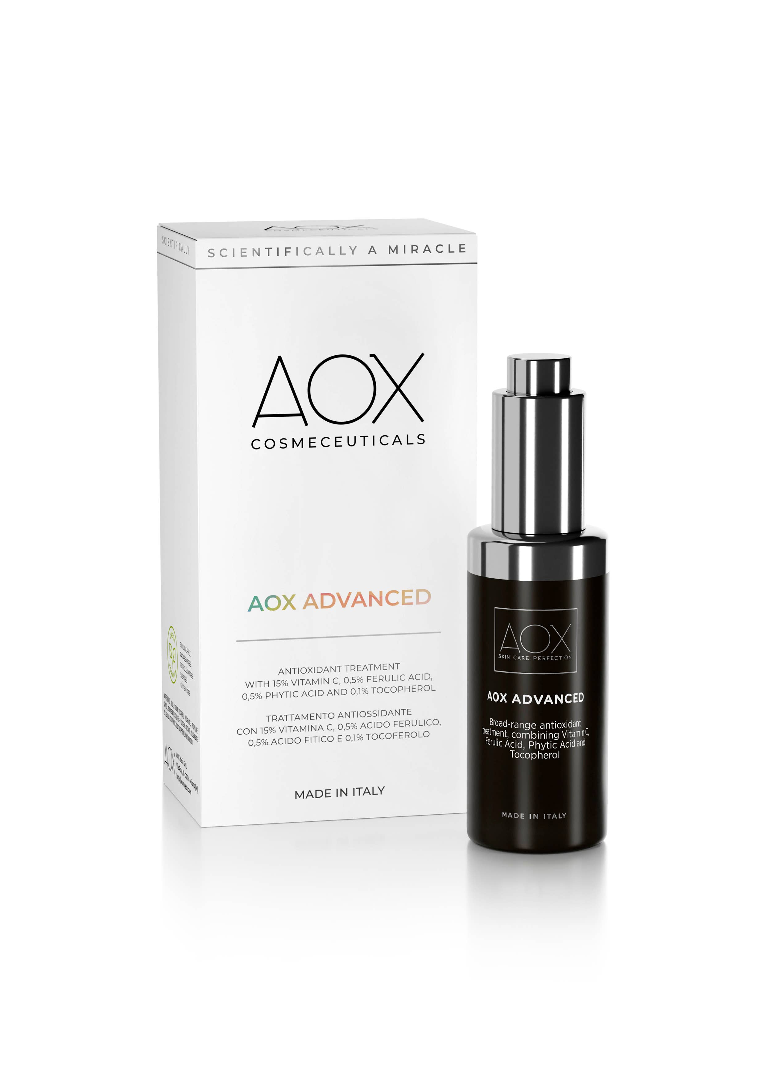 AOX er et populært hudplejemærke specialiseret i antioxidanter, der i øjeblikket sælges i 700+ italienske apoteker og medicinsk spa. Vi fremstiller vores innovative formler med kun de mest effektive naturlige ingredienser. Aktive ingredienser er lige så modtagelige for oxidativ skade som vores hud er. Vores eksklusive luftløse dispensere opretholder antioxidanternes styrke i hver behandling og sikrer den perfekte daglige dosis ned til den sidste dråbe, så intet produkt går til spilde. Vores patenterede mikrosfærer er certificeret til at trænge op til +1153% ud over hudbarrieren. Tjek vores hjemmeside for mere information. Alle AOX produkter er dermatologisk testet og er nikkel-, parabener-, siliconer-, SLS- og glutenfri.