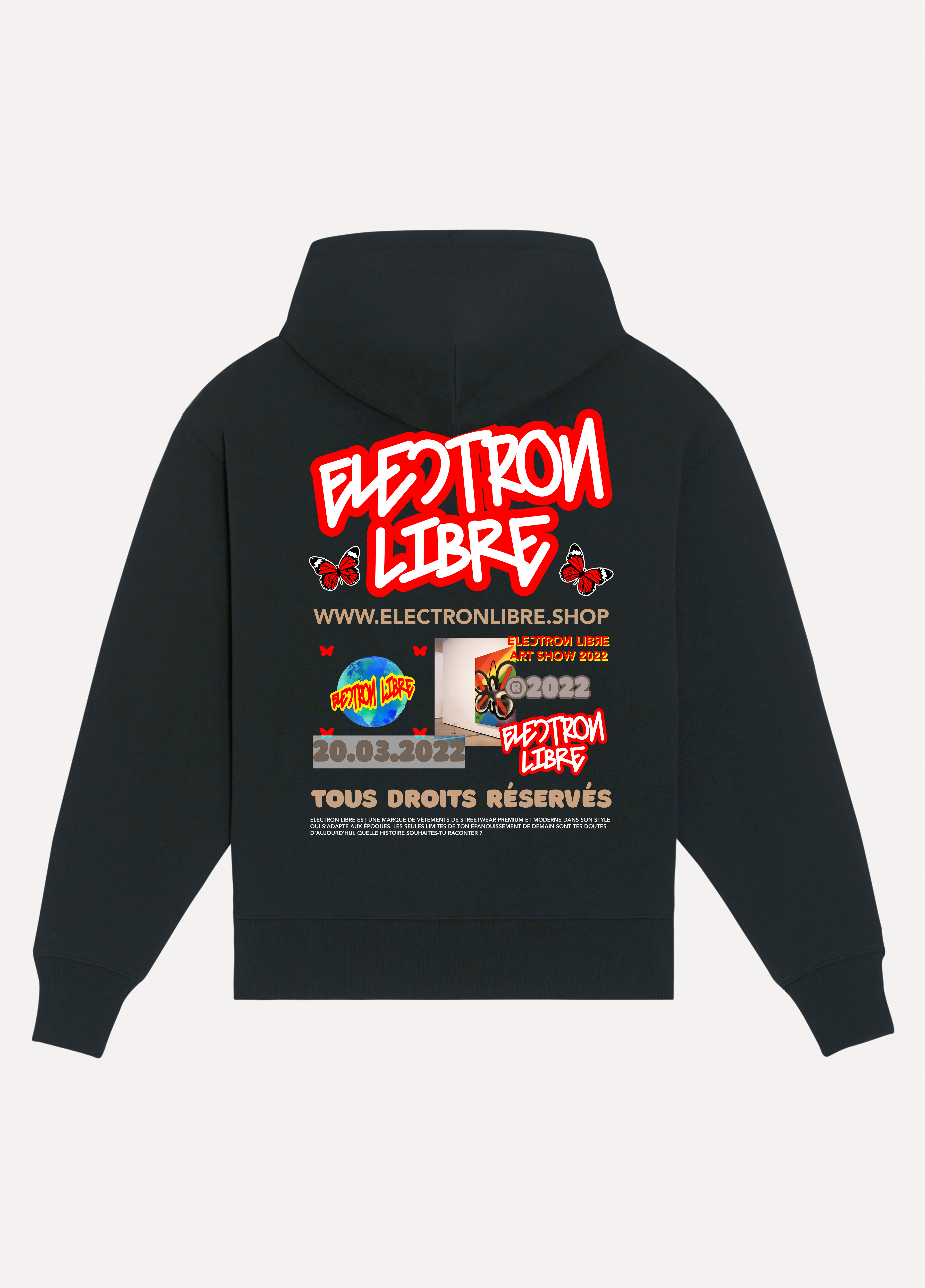 Vivre sa meilleure vie en créant son propre mouvement. ELECTRON LIBRE est une marque de vêtements de streetwear premium et moderne dans son style qui s'adapte aux époques. A l'image du papillon, la marque est synonyme de libertés multipla. ELECTRON LIBRE inspirere la liberté totale et sans contraintes. ELECTRON LIBRE permet la rencontre entre l'univers de l'art et celui du vêtement, grâce à des créations artistiques mettant en relation le papillon et l'esprit de la marque. Les seules limites de ton épanouissement de demain sont tes doutes d'aujourd'hui. Quelle histoire souhaites-tu raconter?