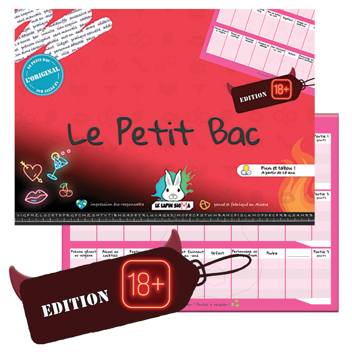 LE LAPIN SIGMA, der blev oprettet af 3 venner i 2020, er et ungt alsace-firma, der udgiver brætspil. Vi inviterer dig til at genopdage det berømte spil i vores barndom LE PETIT BAC, eller high school-spil, genbesøgt i A4-papirpuder, der er klar til at spille på 50 identiske aftagelige ark, beskyttet af et beskyttende halvstift låg. PETIT BAC-spillet er tilgængeligt i 6 nye versioner til alle aldre og alle atmosfærer! En rigtig Madeleine de Proust for nogle, griner garanteret for alle:) 100% Made in France-spil trykt i Alsace og miljøvenlige (PEFC-etiketpapir og vegetabilsk blæk). Alle spil er beskyttet af en plastfolie fastgjort med ESAT i Strasbourg.