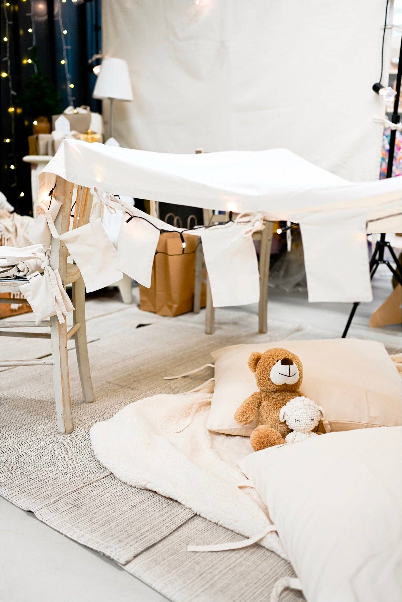 Siden 2021 har vi med Mamie Stella støttet familier over hele verden takket være vores stoffritidshytter, som er beregnet til meget hurtigt at skabe sjove og varme ressourcerum. Ikke flere hjemmelavede dækhytter, der falder og er svære at stabilisere, tipis og andre strukturer, der er trange, komplekse at bygge og skrøbelige at håndtere. Med vores stofhytter drysset med stropper, deres små vægte, der skal vægtes for at stabilisere dem, og de stabile støtter til dine daglige aktiviteter, alene eller sammen med andre, er der alt at bygge!