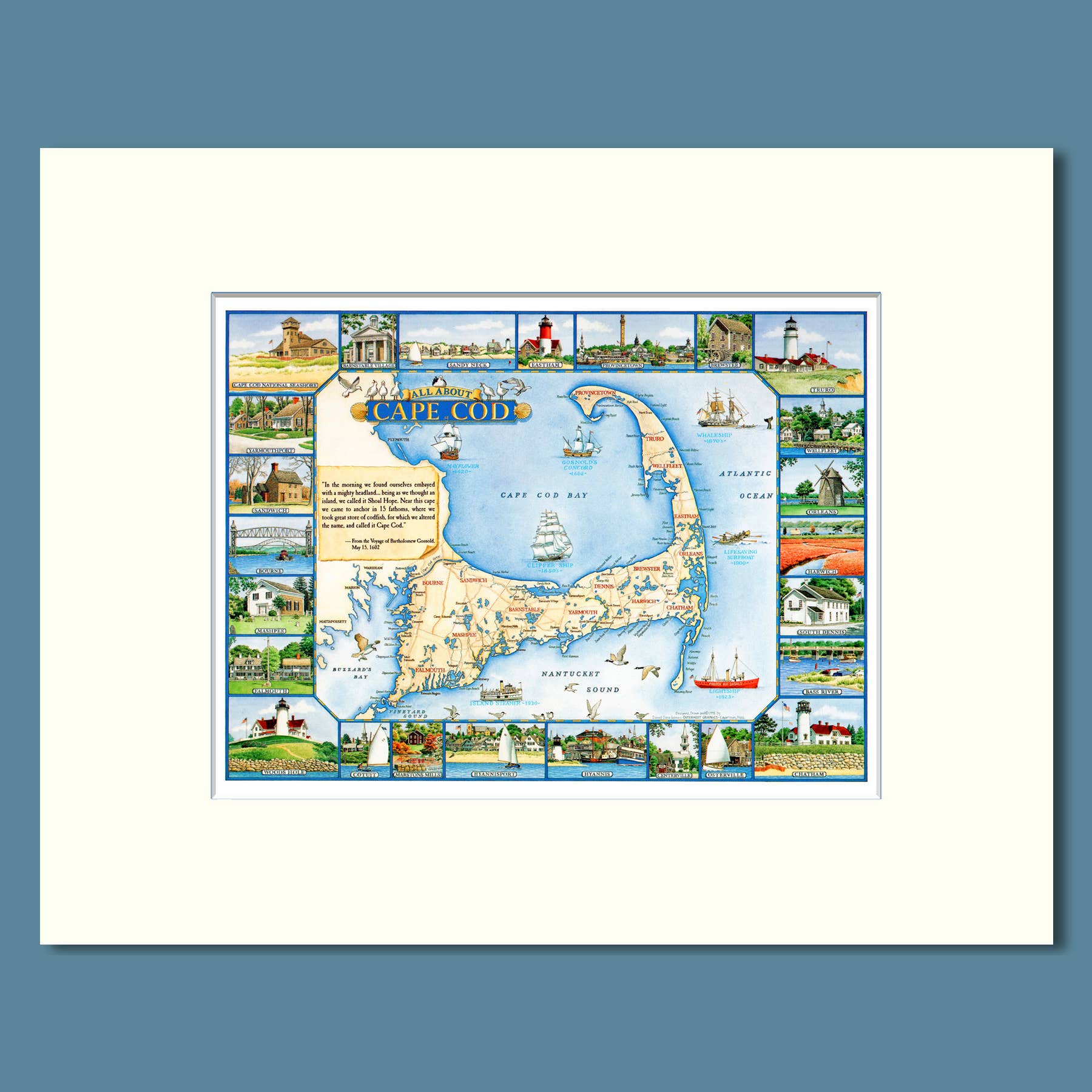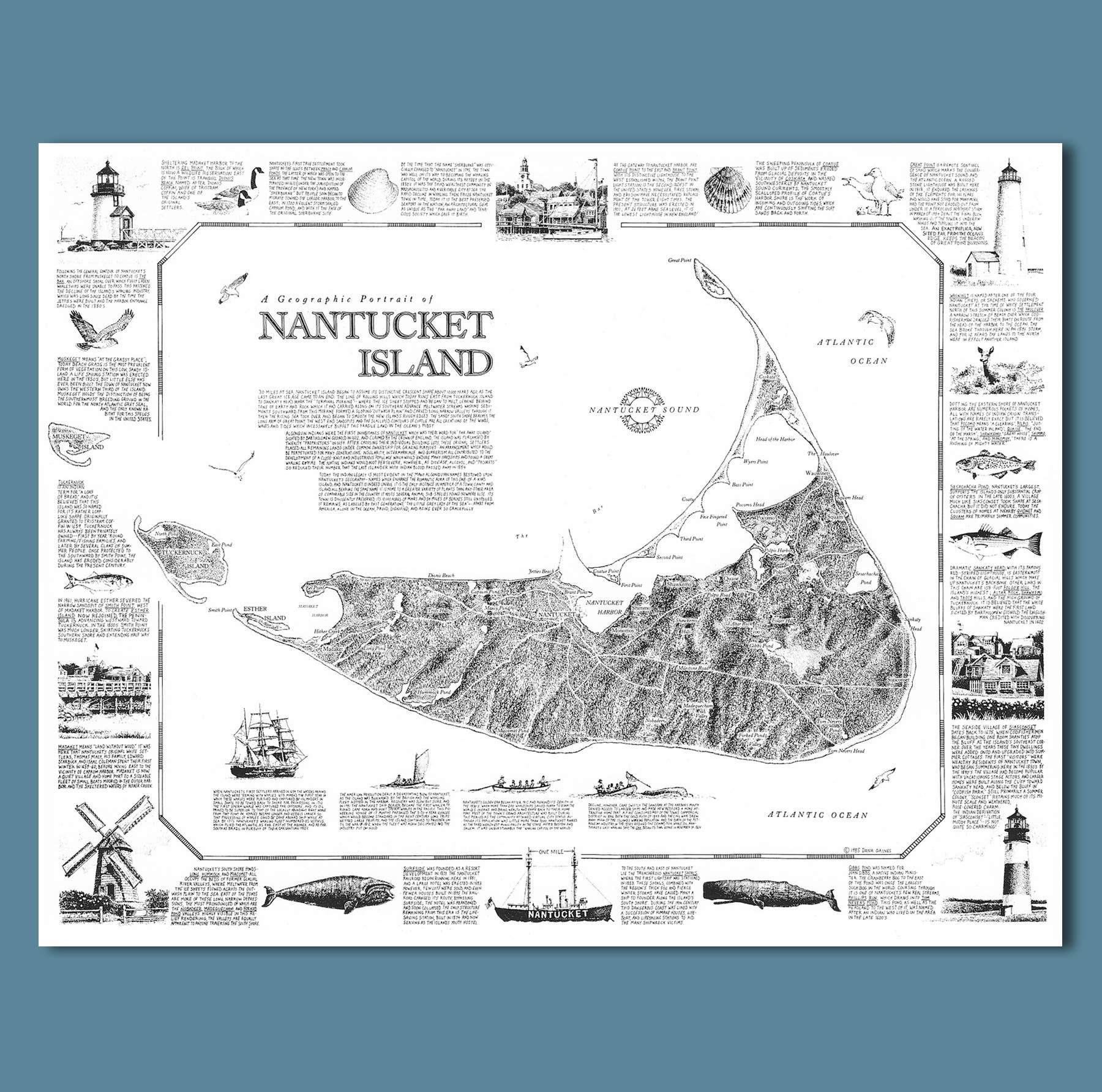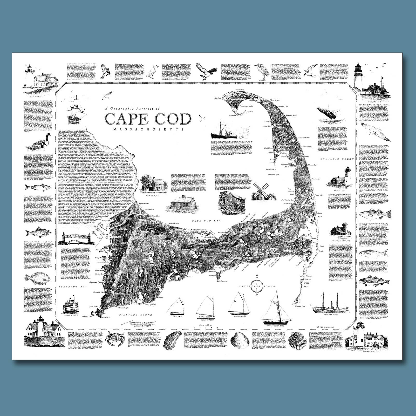 At vokse op på en ø - og derfor omgivet af hav - indgød i mig en livslang fascination for alt maritimt: skibe, både, kort, søkort og de mange arter, der lever både over og under overfladen. Jeg har anvendt mine færdigheder som designer og illustrator til at skabe en bred vifte af trykte produkter, som har været populære i årtier i Cape Cod og Islands-regionen, kystnære New England og videre. Jeg håber, at mit unikke udvalg af kort, tryk og kort vil appellere til dig og dine kunder!
