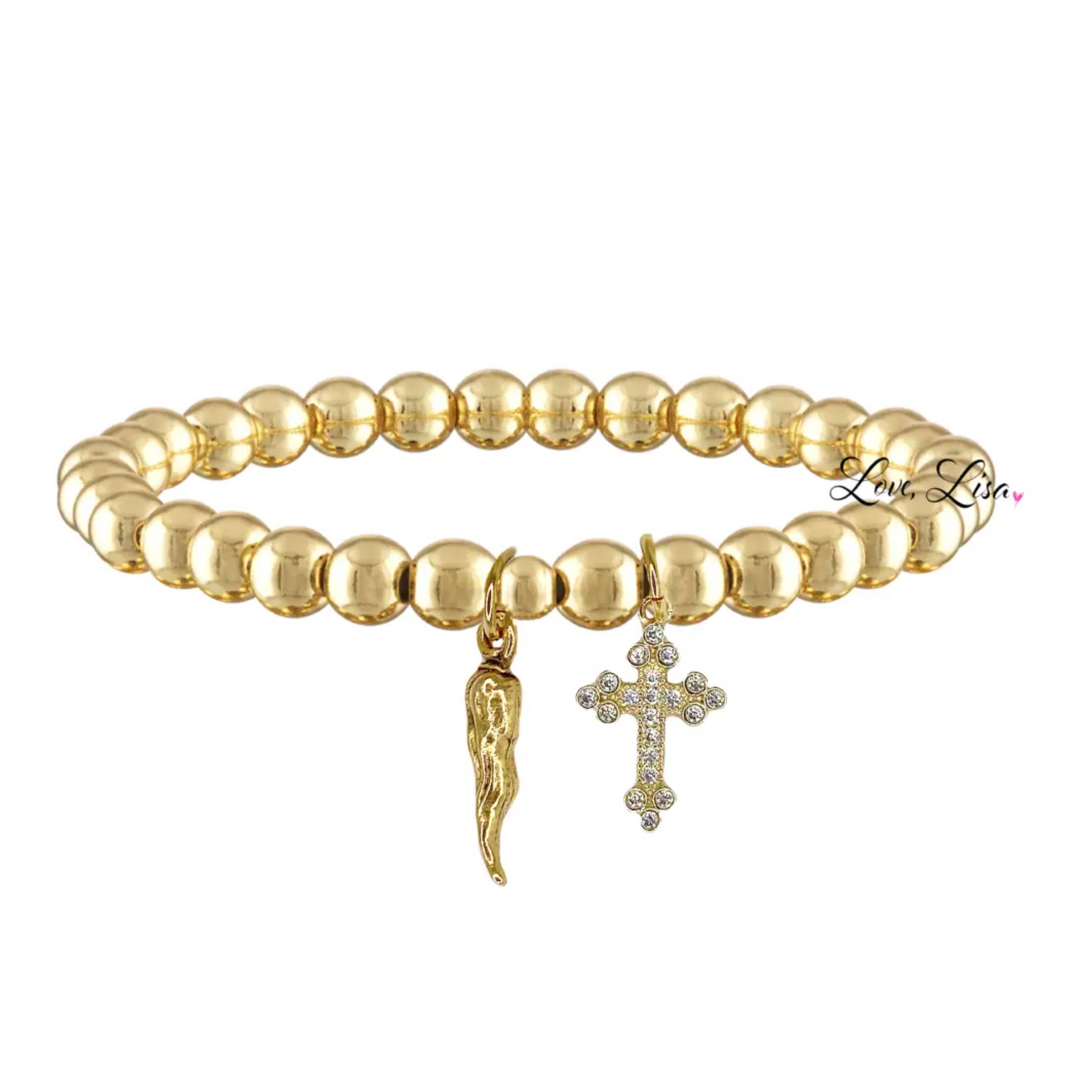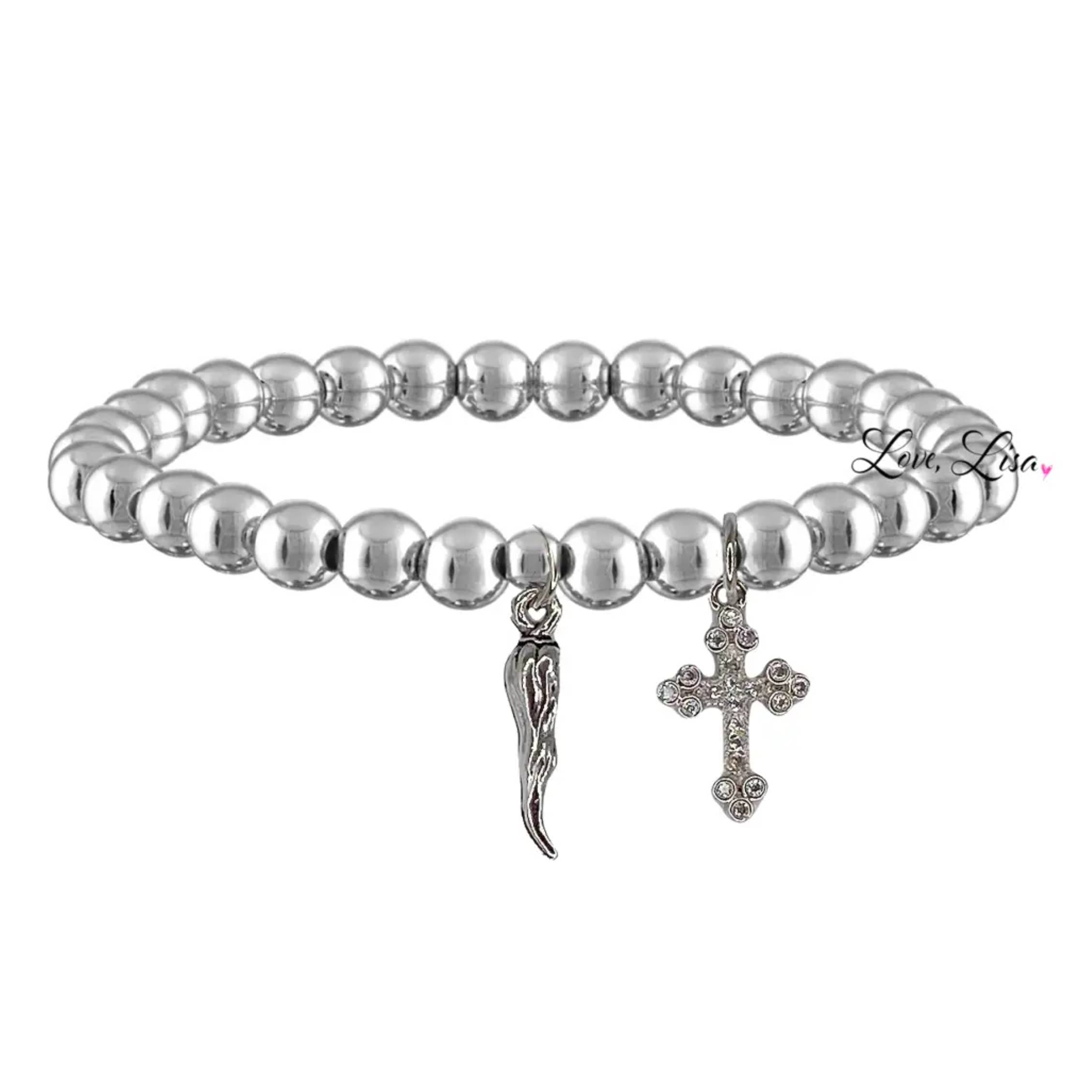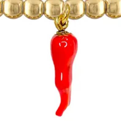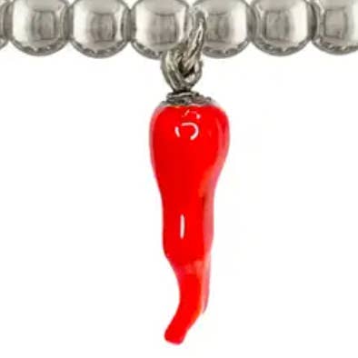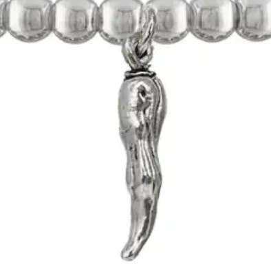 Enhver italiener ved, intet tøj er komplet uden en corno! Det italienske Horn Cornicello (Corno) armbånd kan bæres til at afværge ondskab og give ekstra beskyttelse mod uheld. Enhver italiensk eller italiensk amerikaner i karantæne kan bruge dette smukt perlerede armbånd med en bane som ekstra beskyttelse. Strækarmbåndene med perler måler 6,85“, og det smukke horn måler 3/4".