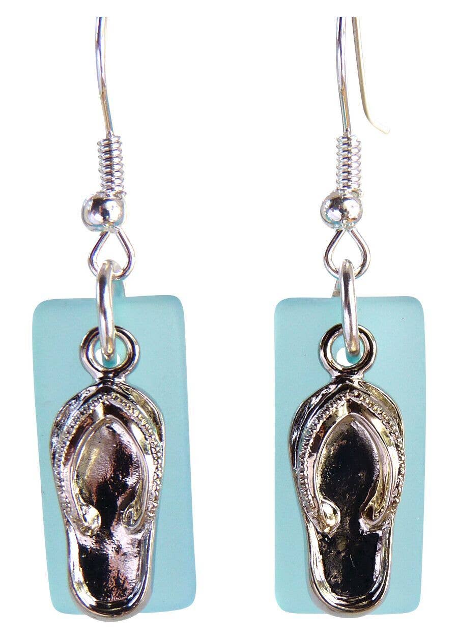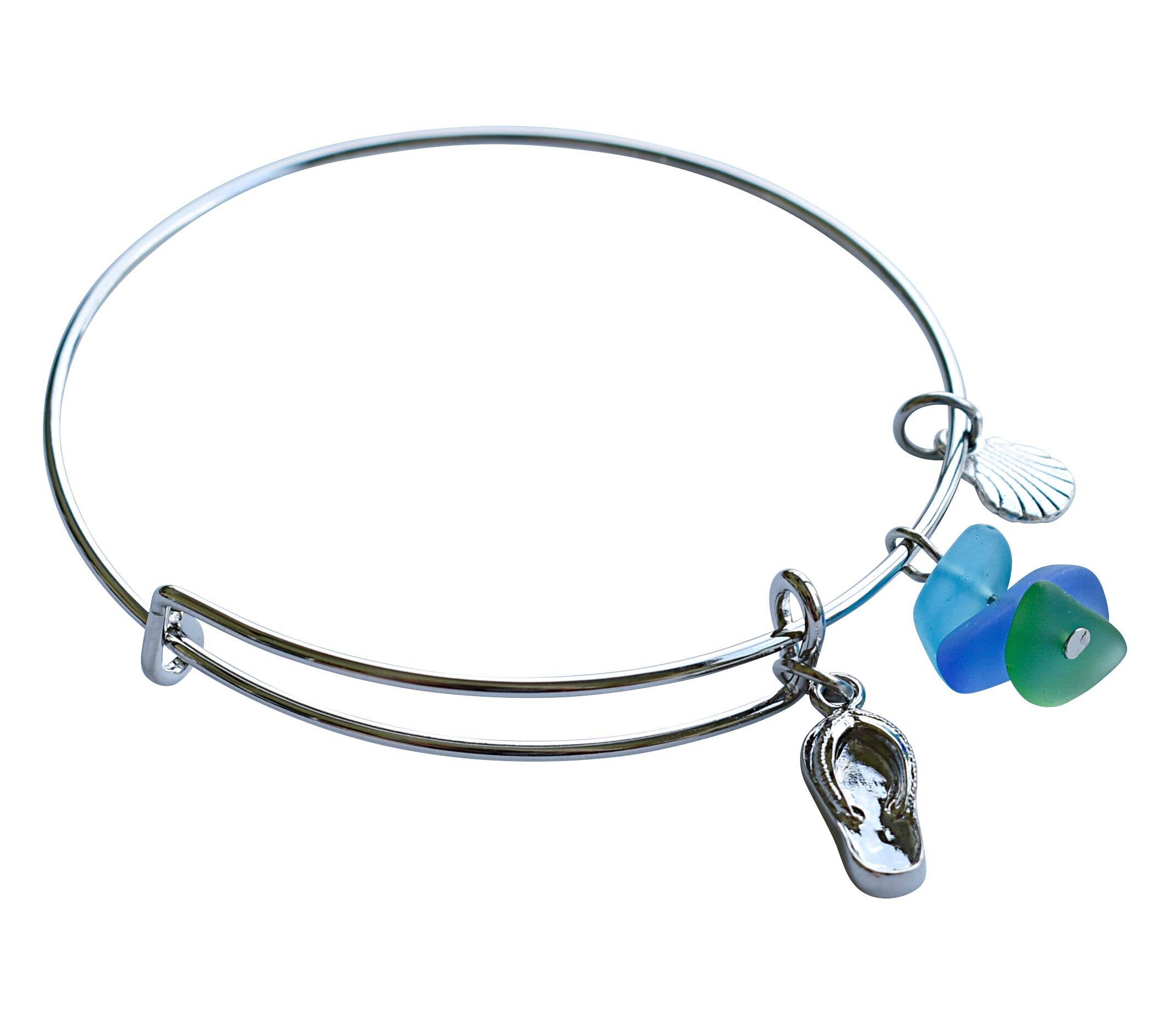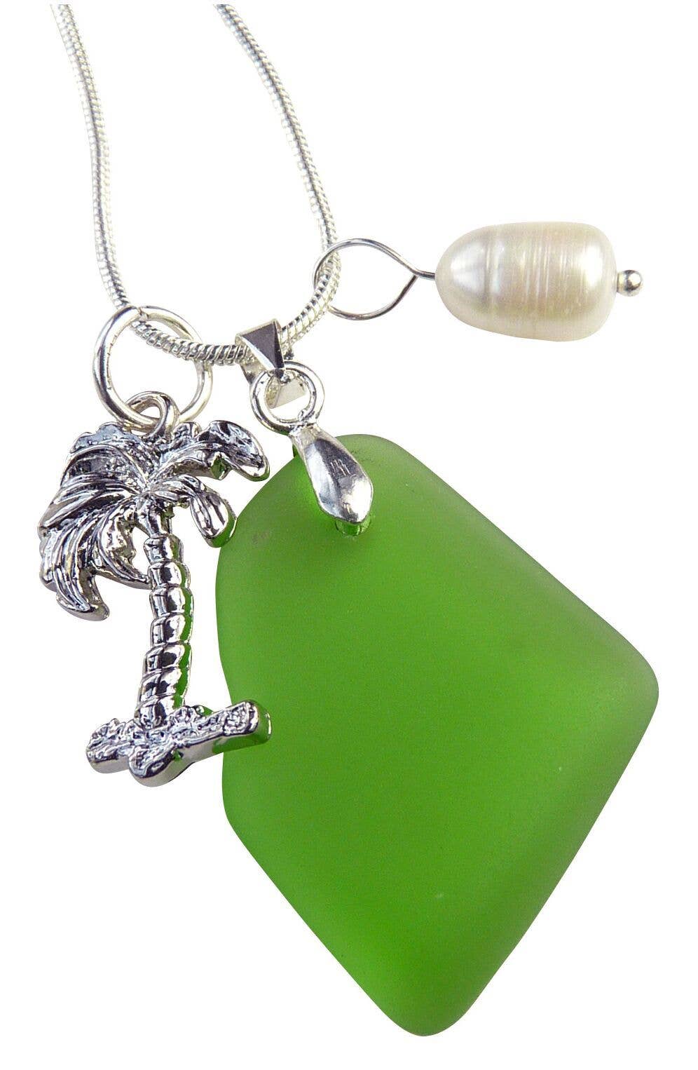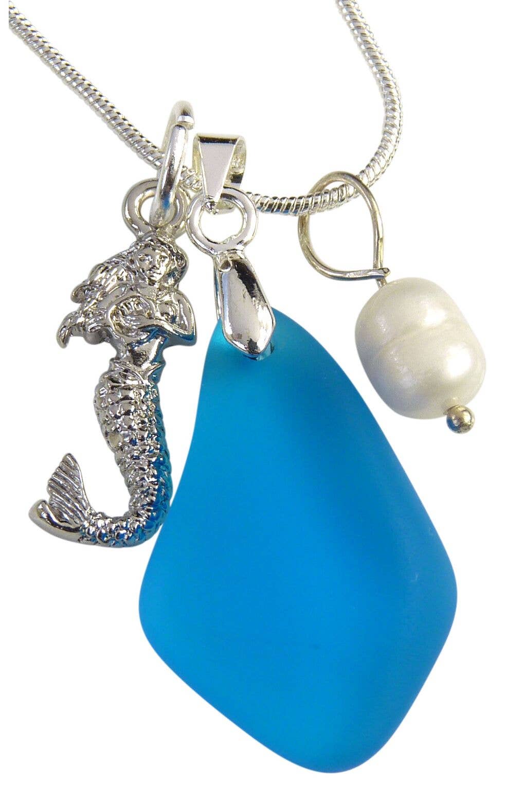 Kulturperler havet glas, en flip flop charme og en ferskvandsperle alle hænge sammen på en 22 „rustfrit stål halskæde. Tre forskellige farver pr pakke i nuancer af blå, aqua og grøn. Lavet i Amerika. Nikkelfri og blyfri.