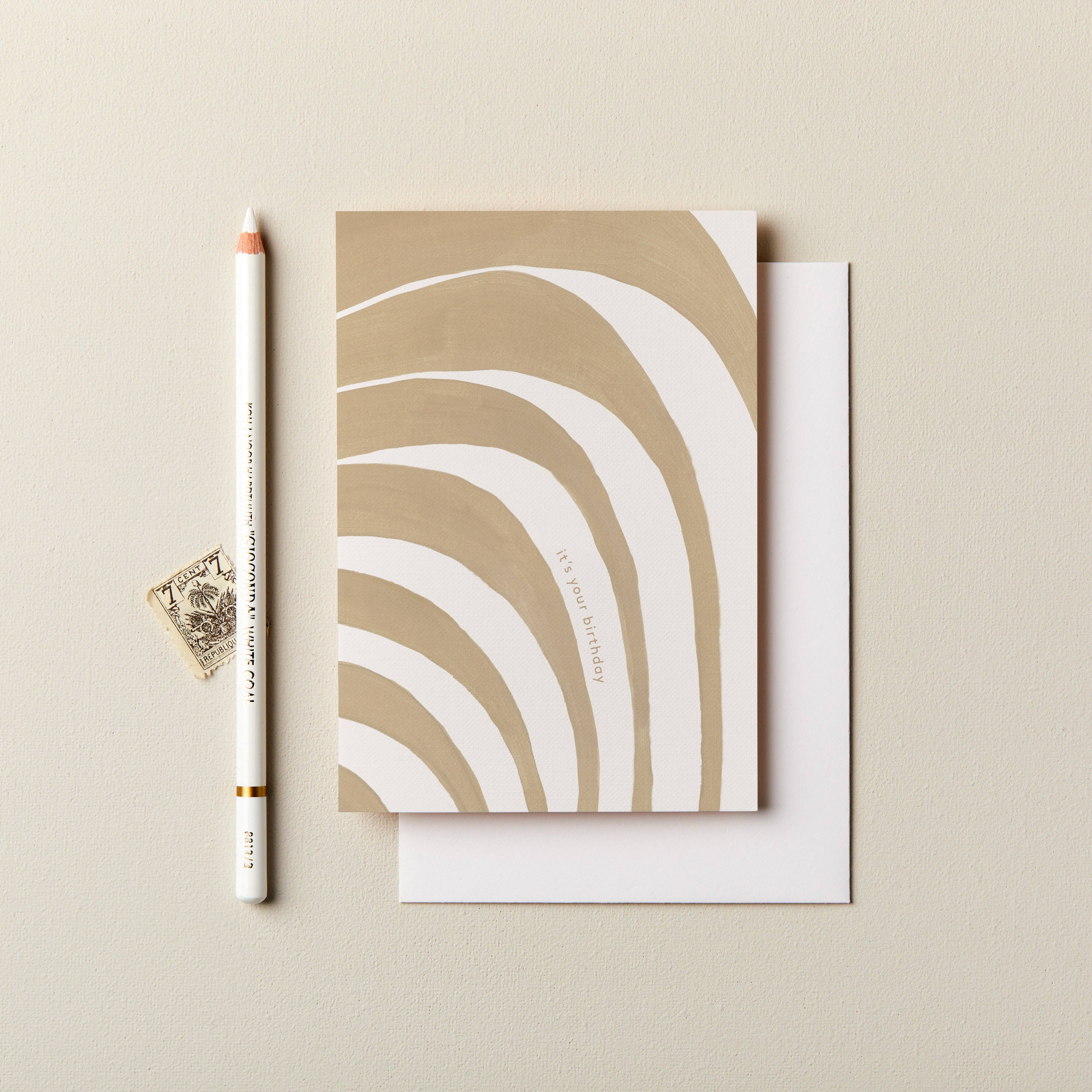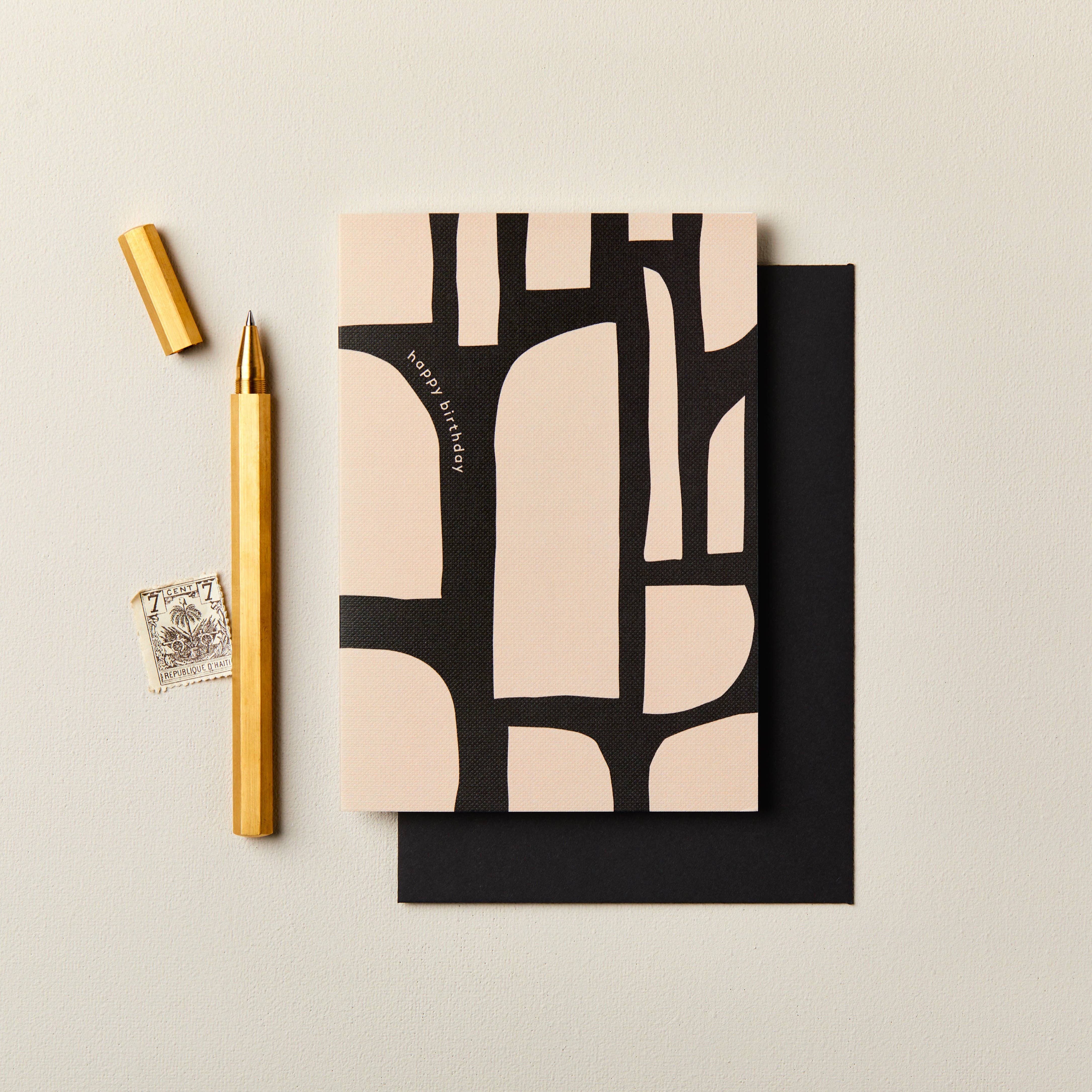 Luksus fødselsdag lykønskningskort, med et jordisk abstrakt terrazzomønster og"tillykke med fødselsdagen“ i guldfolie. Trykt på et luksuriøst præget 300gsm hvidt kort og ledsaget af en solbrun konvolut. A6 i størrelse (105 x 148mm | 4.1" x 5.8"). Venstre tom inde til din egen besked. Stolt lavet og trykt i Storbritannien.